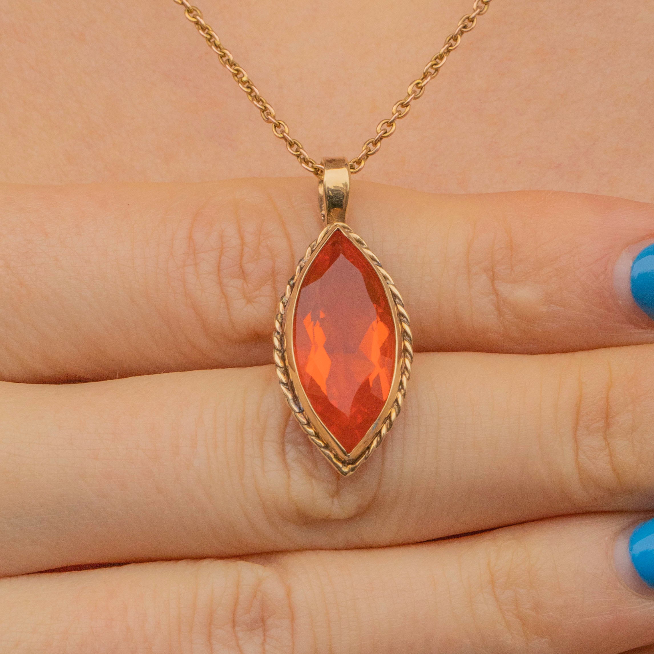 VERY GOOD. This antique 9ct Gold Fire Opal pendant is in very good condition. The Fire Opal is perfect, smooth and has the most vibrant colour! The bezel setting has a petite rope border, and the bale is intact. The size of the bezel does have some wear to note, just beneath the rope border, but this isn't visible front on!
