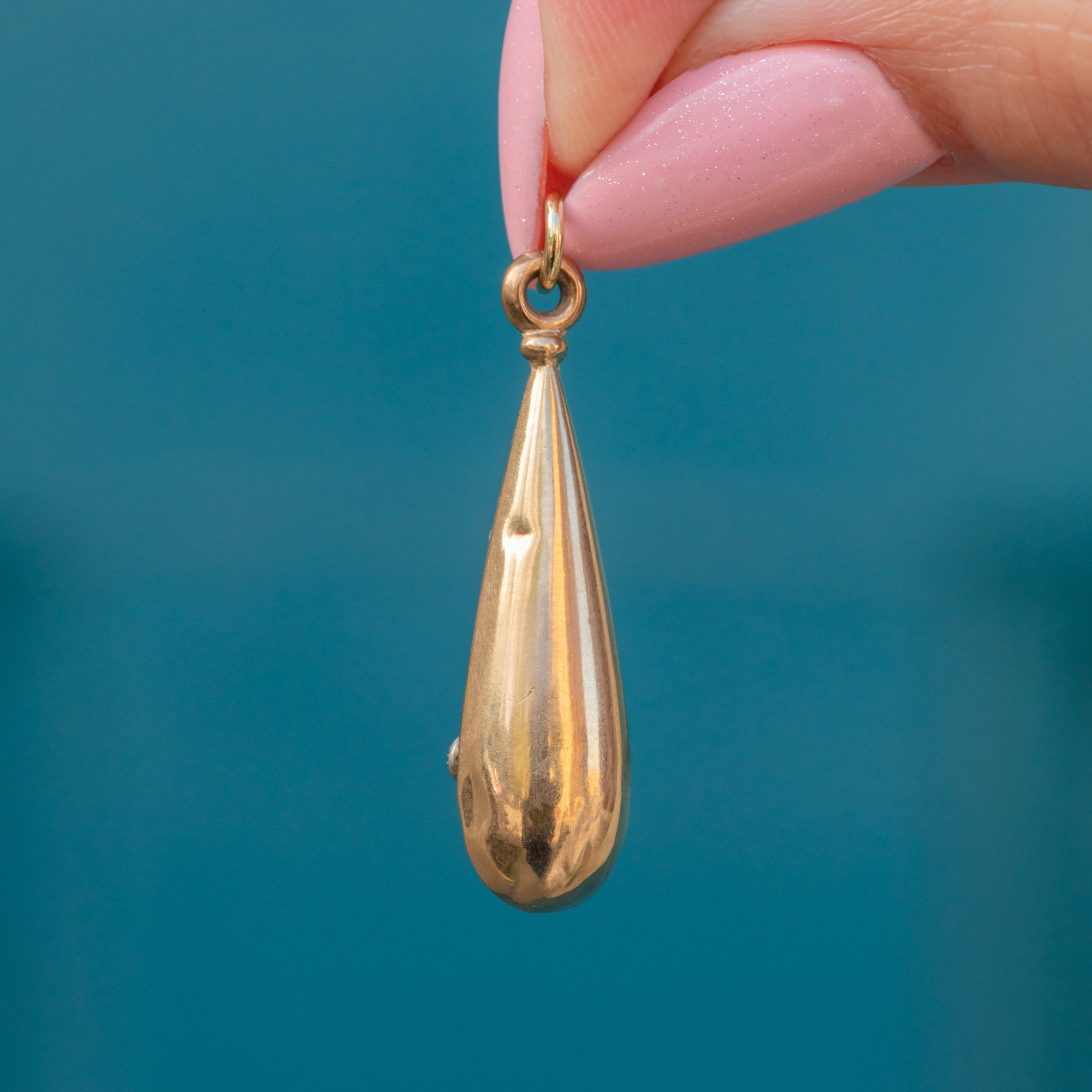 VERY GOOD: This antique 9ct Gold floral torpedo drop pendant is in very good condition. Her Gold has a beautifully blushed hue throughout with a lovely glossy finish. There is a ding on the back of the pendant, and some other wear to the Gold at points, particularly at the back. This is not particularly impactful and cannot be seen during wear. With endless wear potential, this Victorian Gold pendant will make a versatile addition to your collection!