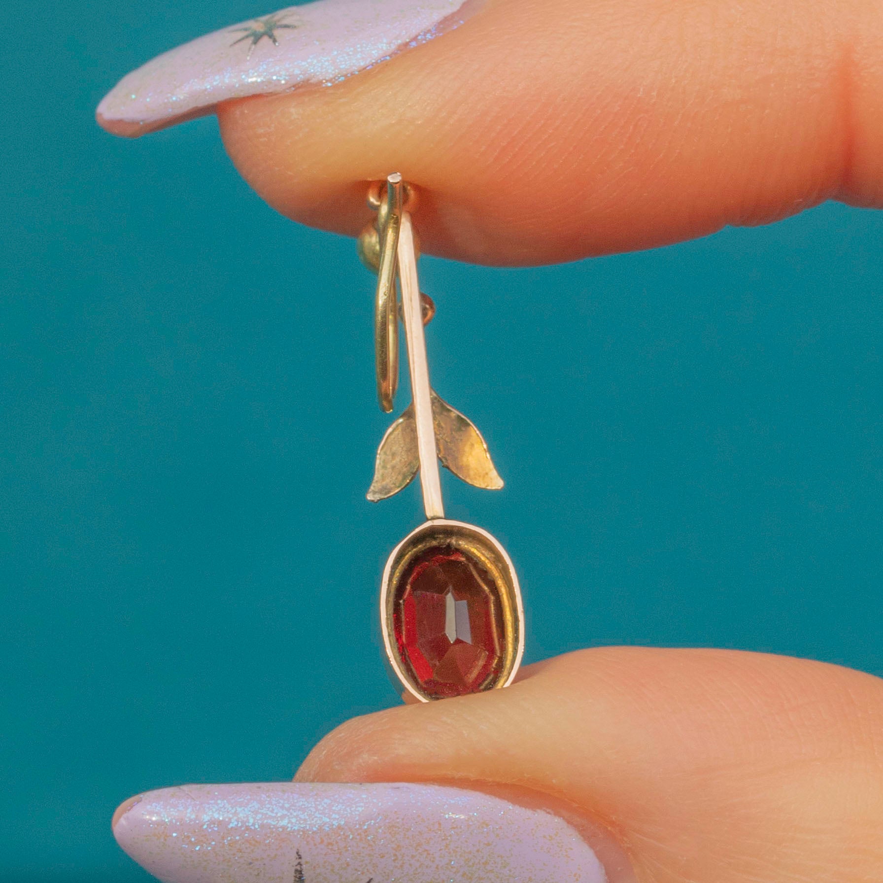 Crafted from buttery 9ct Gold, each Edwardian drop earring features a stunning Garnet, radiating gorgeous deep scarlet hues as they catch the light. Each earring is complete with leaf details adorning the Garnet, making them into dainty floral motifs.