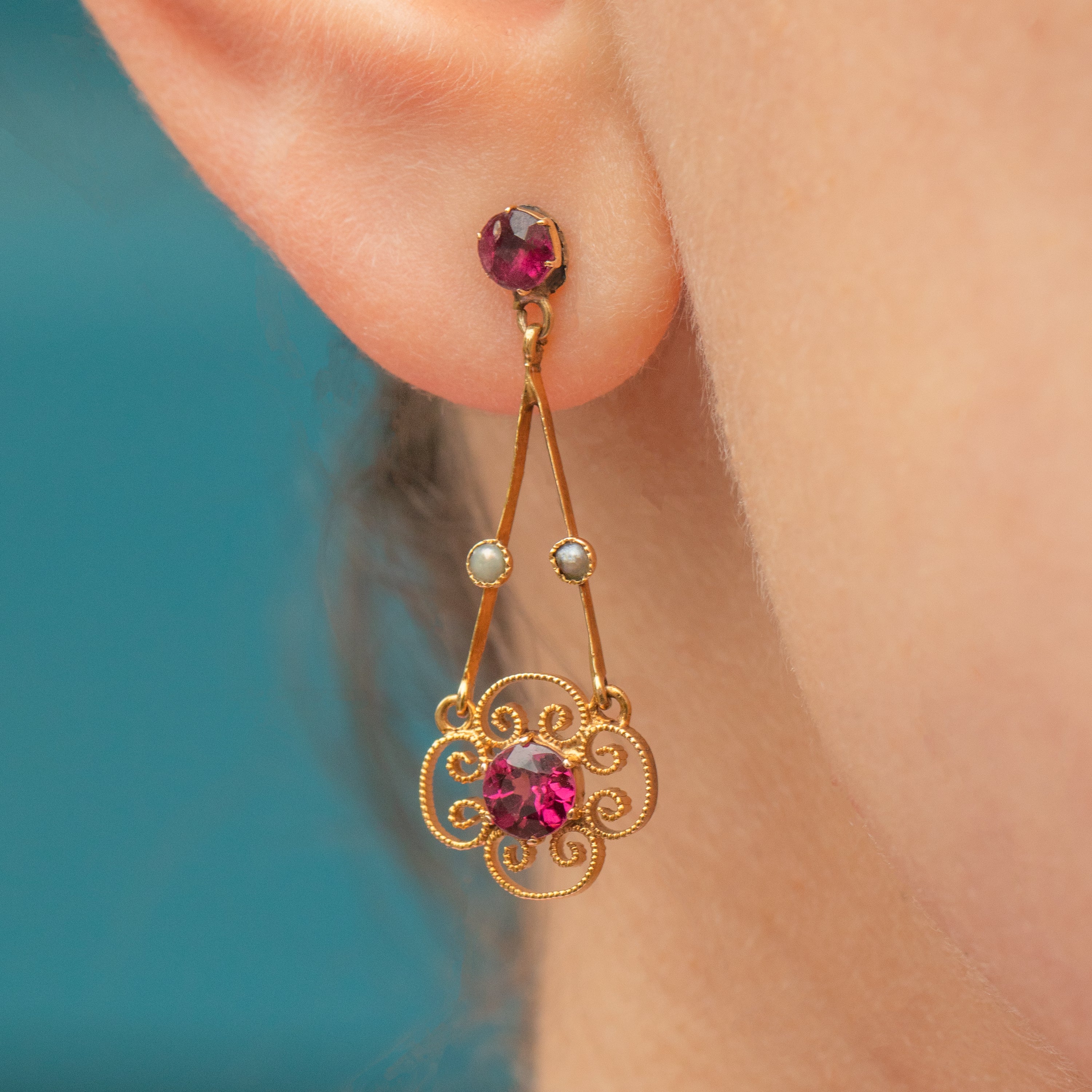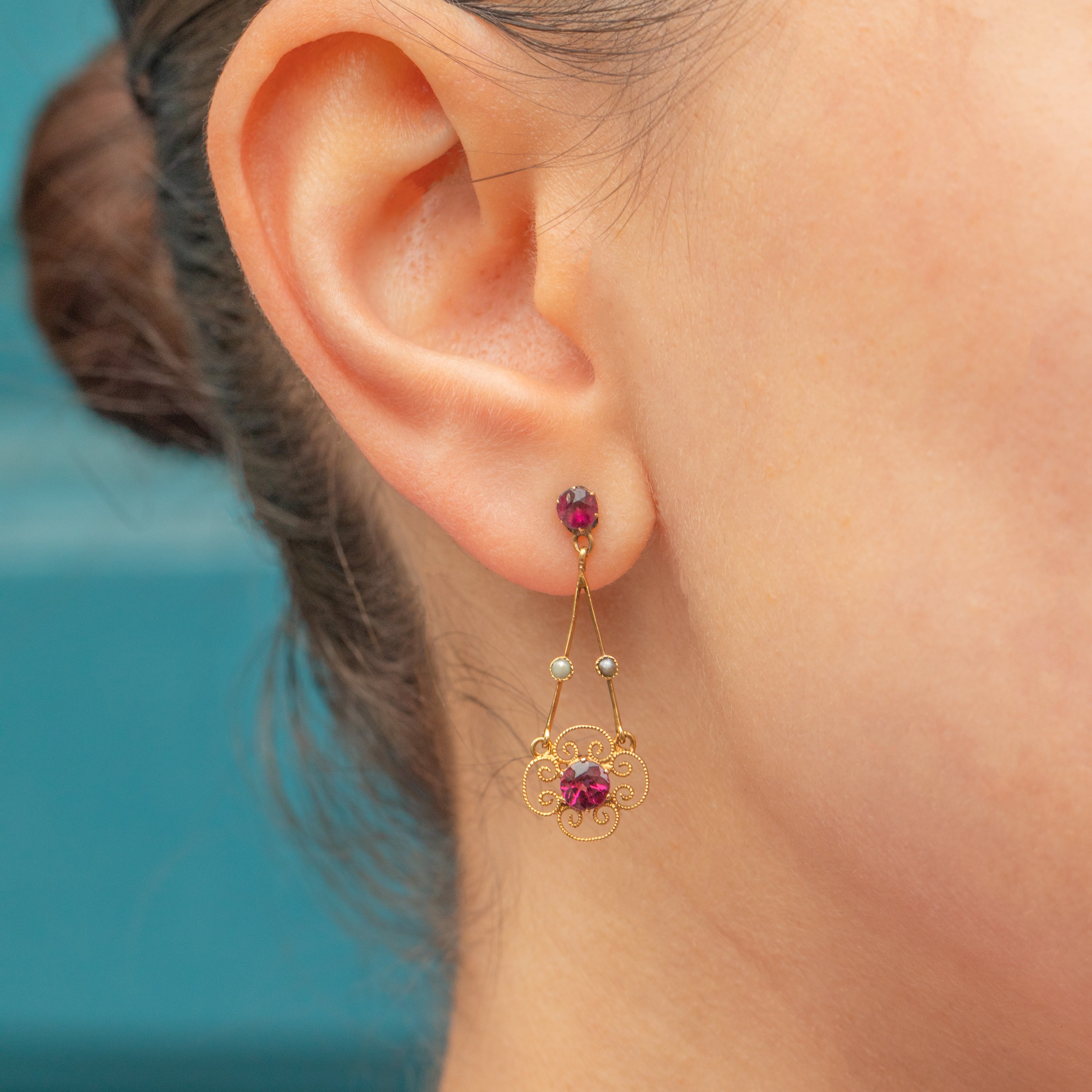 Antique 9ct Gold Garnet Pearl Floral Drop Earrings, 1.60ct