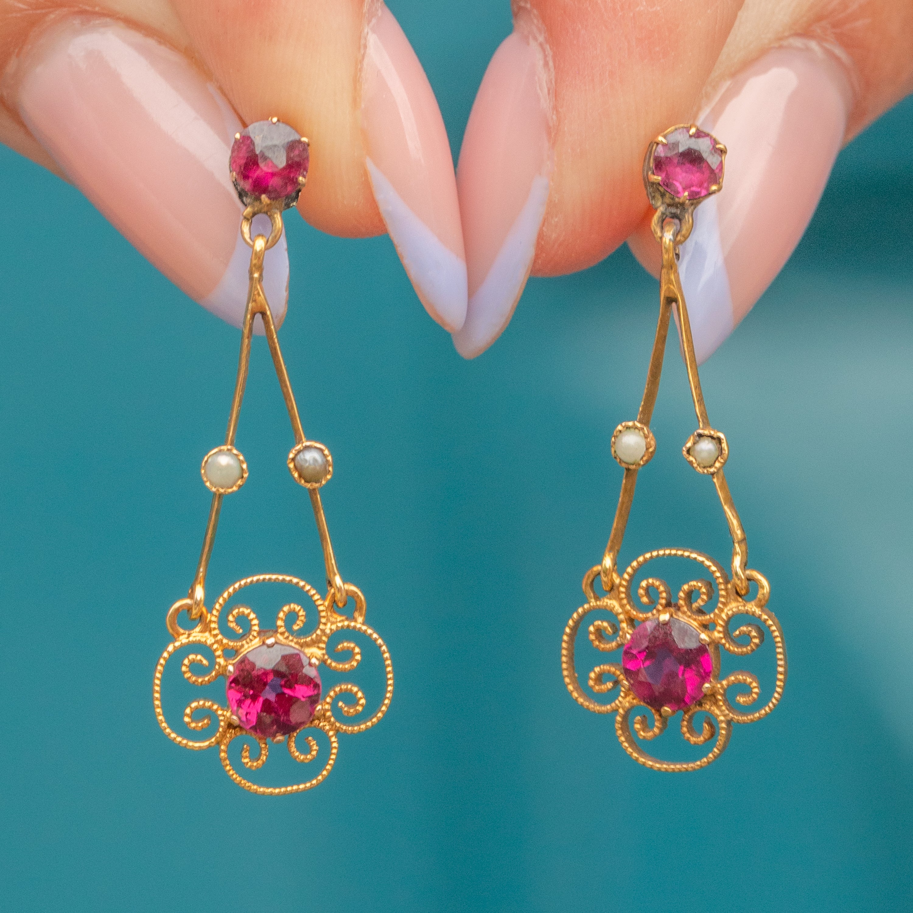 These stunning antique 9ct Gold Garnet Pearl floral drop earrings feature rich and bright berry-toned Garnets surrounded by delicate Seed Pearls in a charming floral cluster design. Edwardian era and crafted in 9ct Gold, their elegant drop style adds graceful movement and timeless appeal.