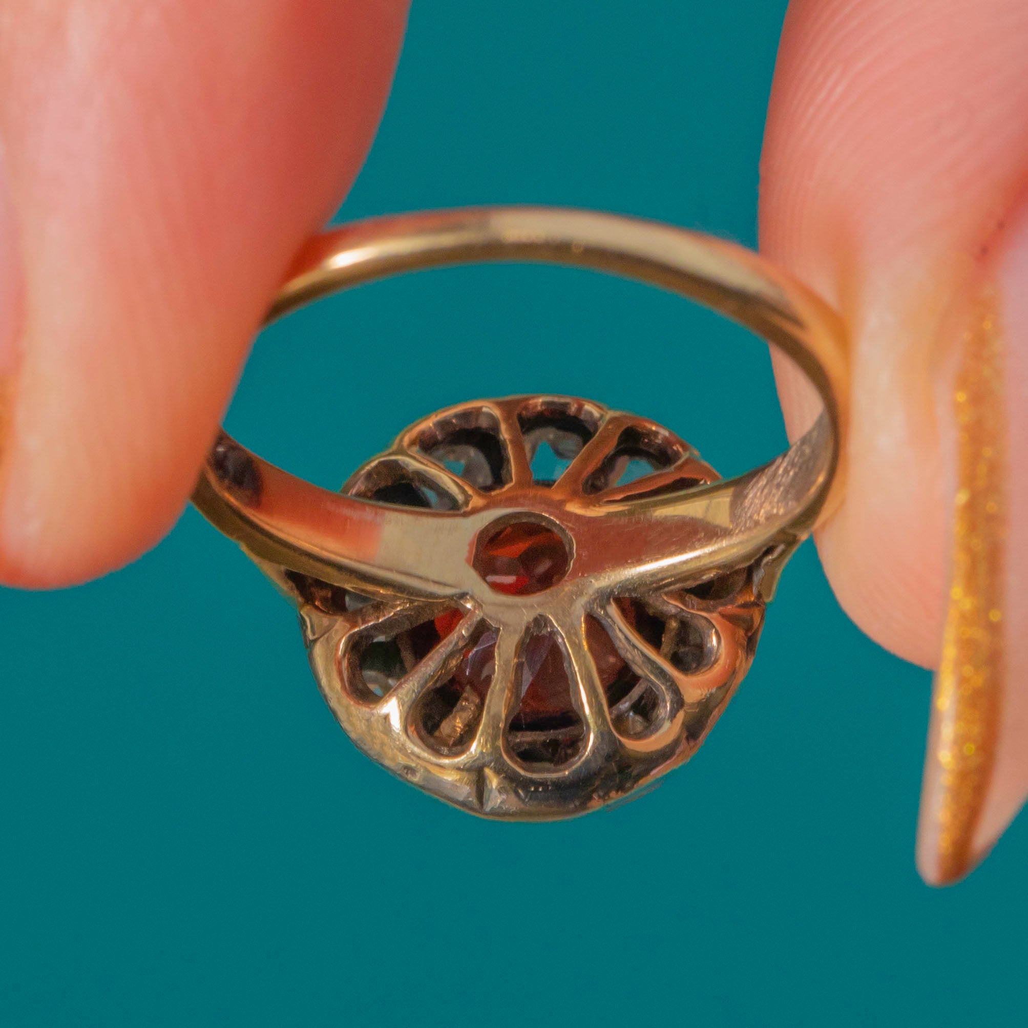 The centre Garnet is approximately 0.70ct, its deep hue intensified by the handmade antique setting. Around it, twelve petite rose-cuts (approx. 0.25ct combined) twinkle with that distinctive old-world sparkle. We love the pretty floral, openwork gallery—an elegant finishing touch that looks as beautiful from the side as it does from the top.