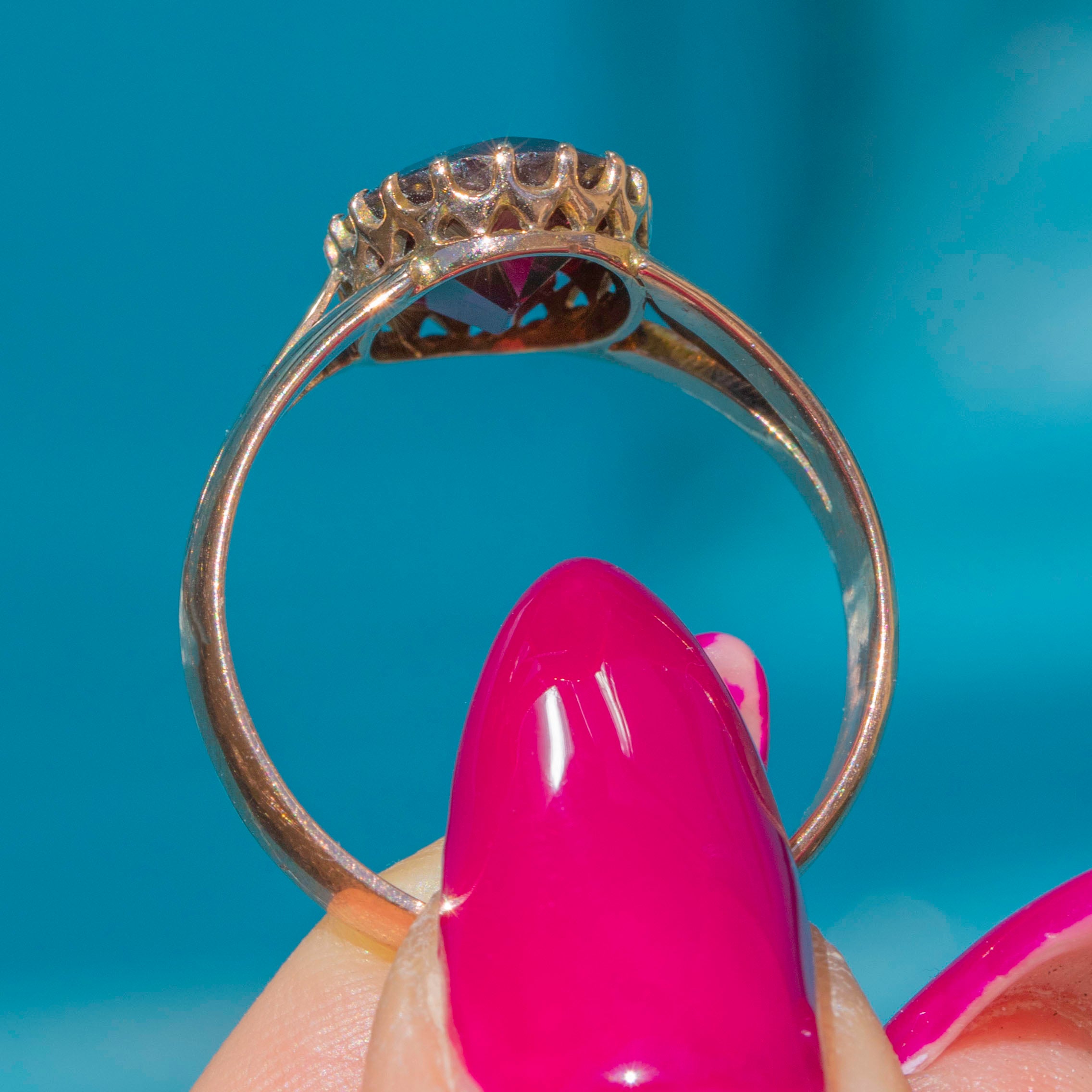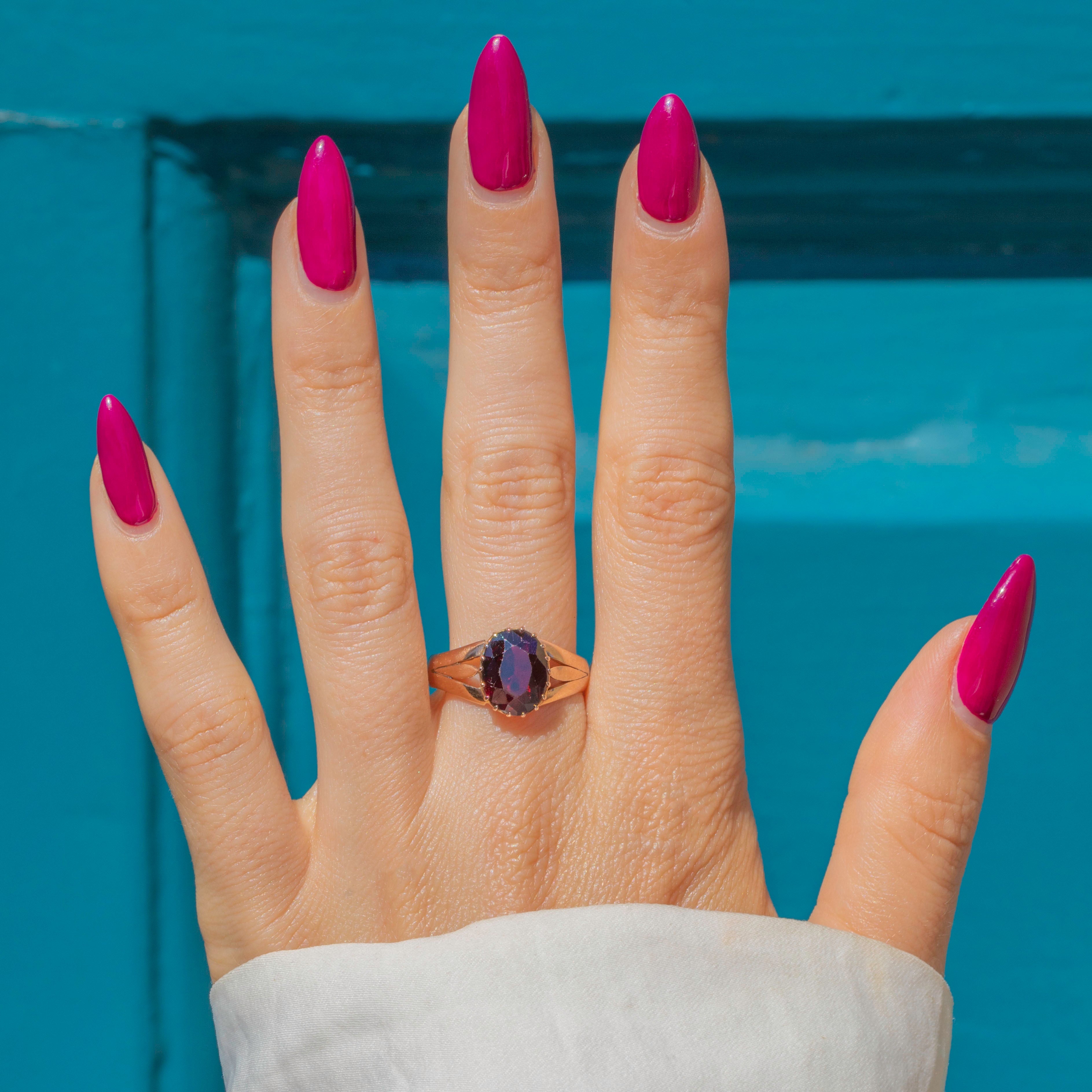 This antique solid 9ct Garnet solitaire ring is a dramatic piece from the early 20th century- hallmarked to 1918. Crafted from solid 9ct Gold, she boasts a richly hued 1.45ct Garnet, projecting flashes of crimson from its geometric facets as they catch the light.