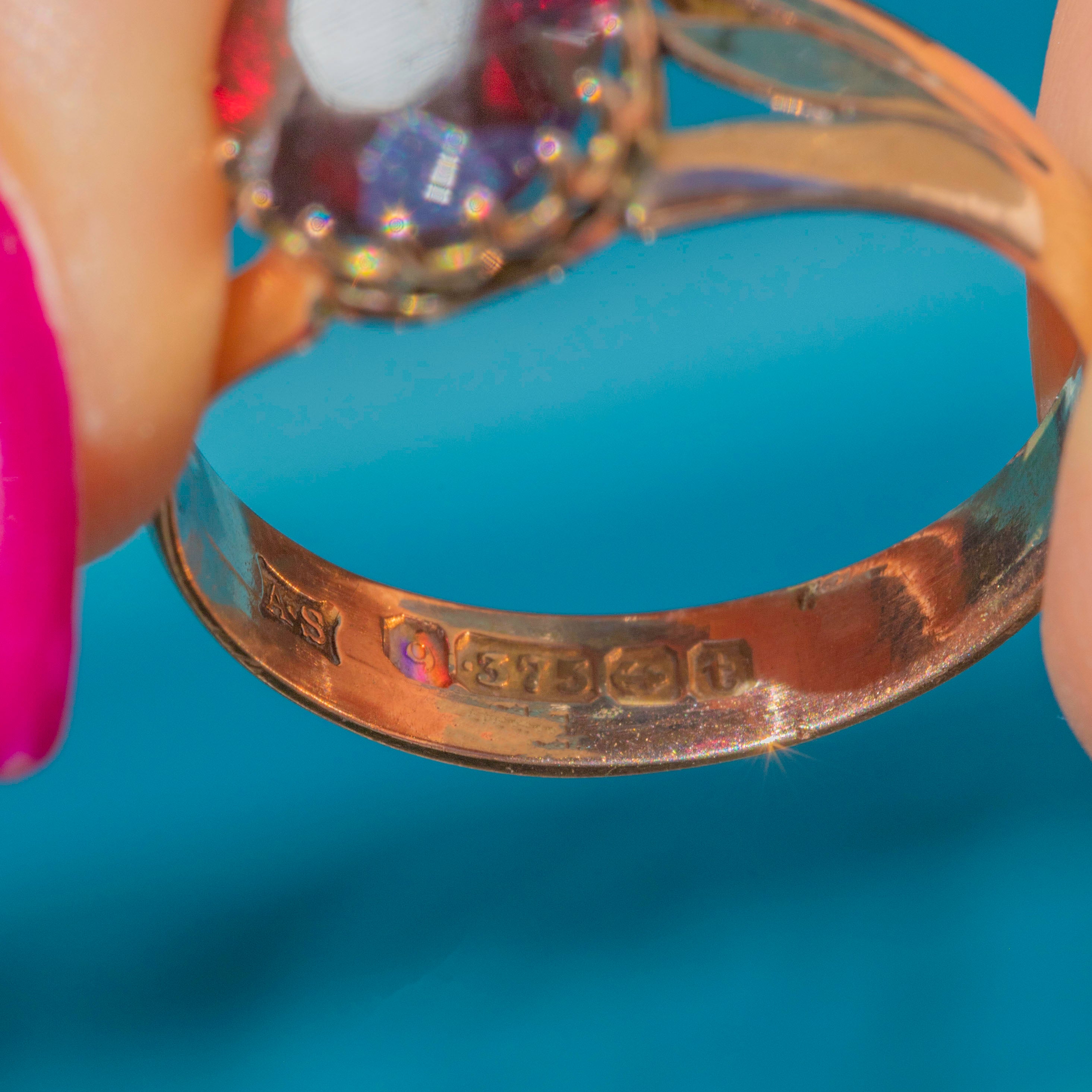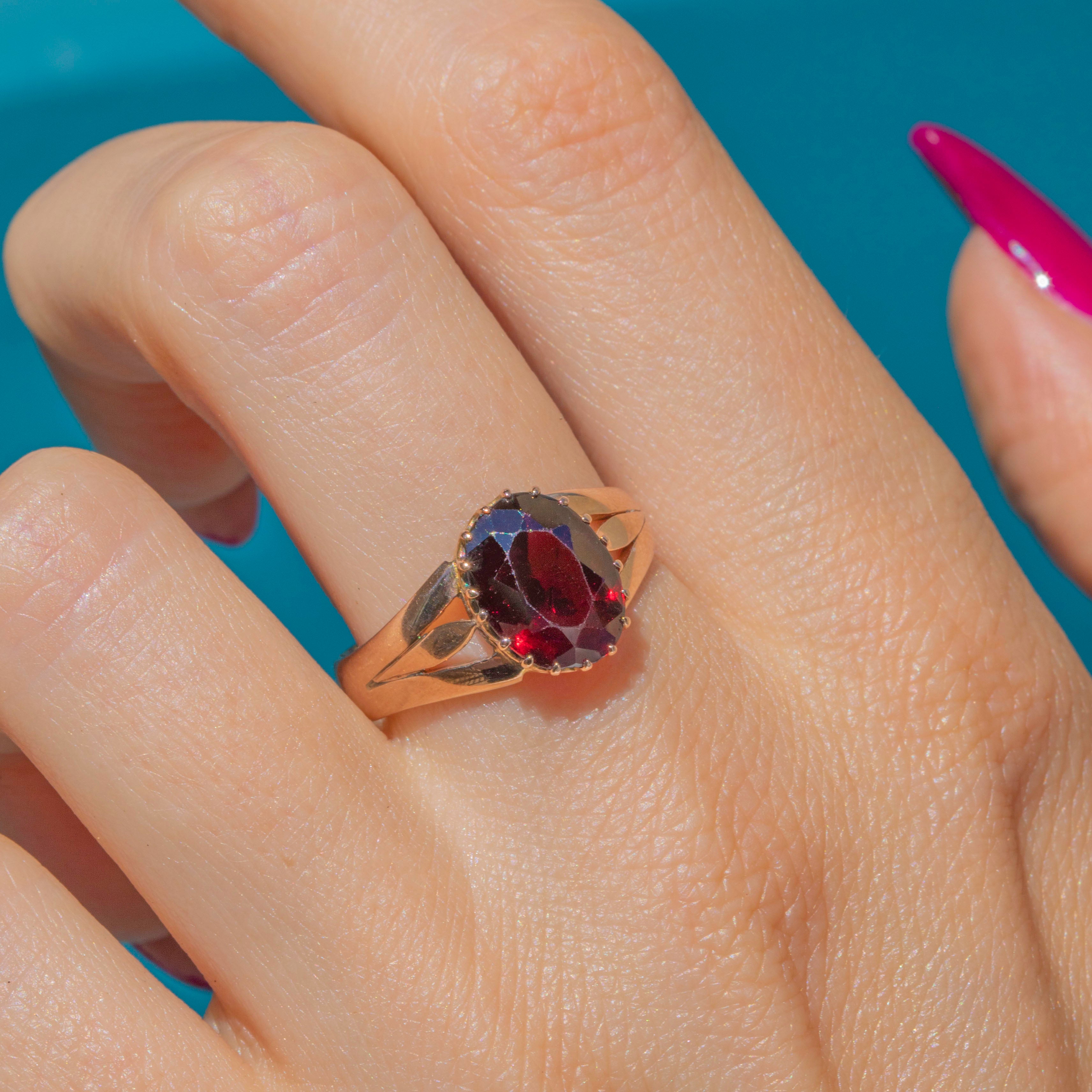 VERY GOOD: The juicy, gleaming Garnet is securely set, free from any damage to note, poised atop lovely claw settings. The 9ct Gold band is in gorgeous shape too, with only some minor wear to its underside and a visible resize on the back of the band, which will not be noticeable while the ring is worn. With a full set of English hallmarks, we can accurately date this piece to 1918!