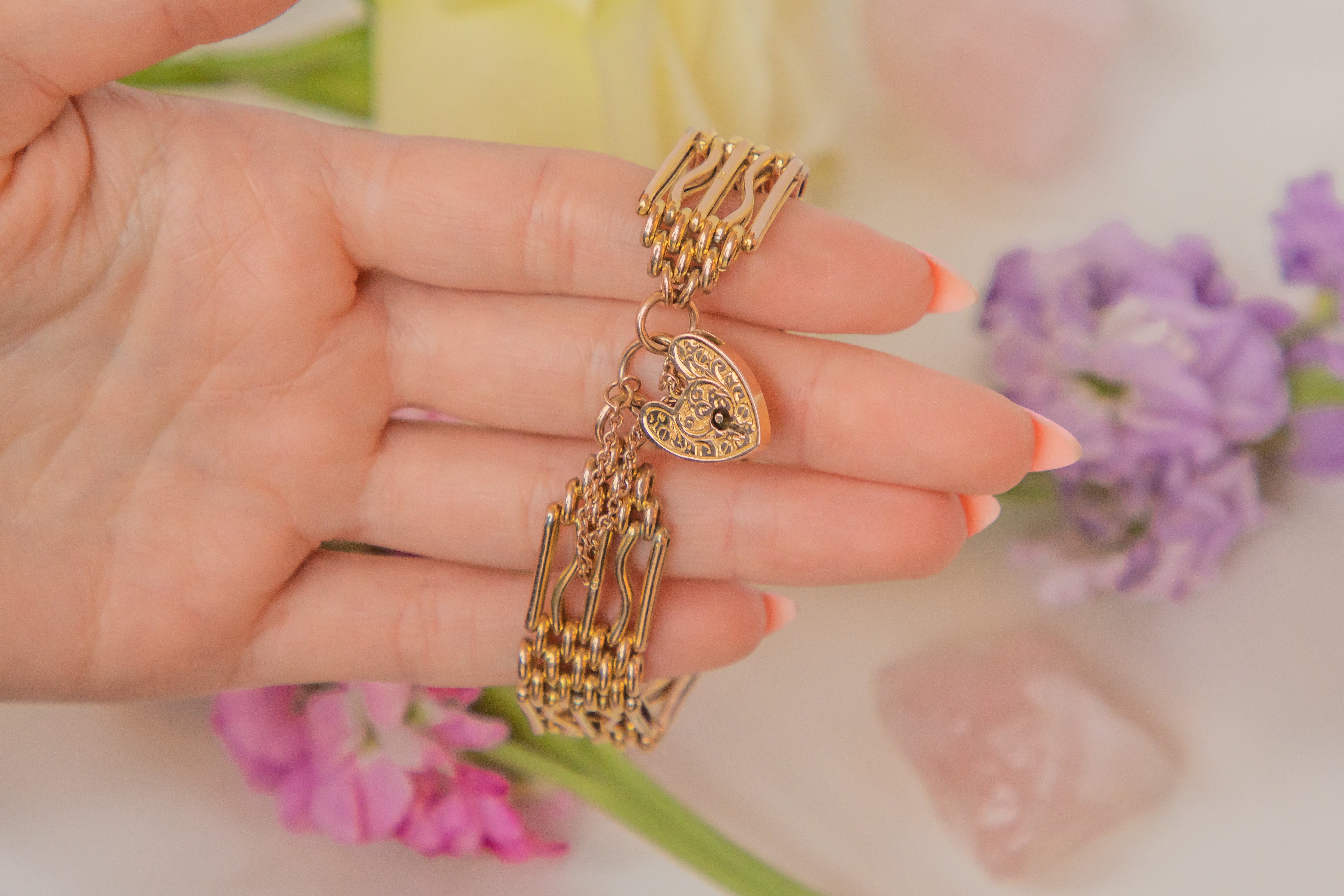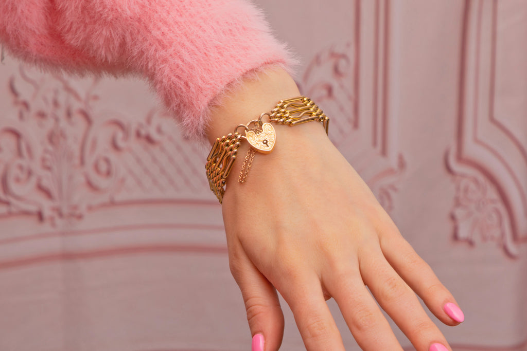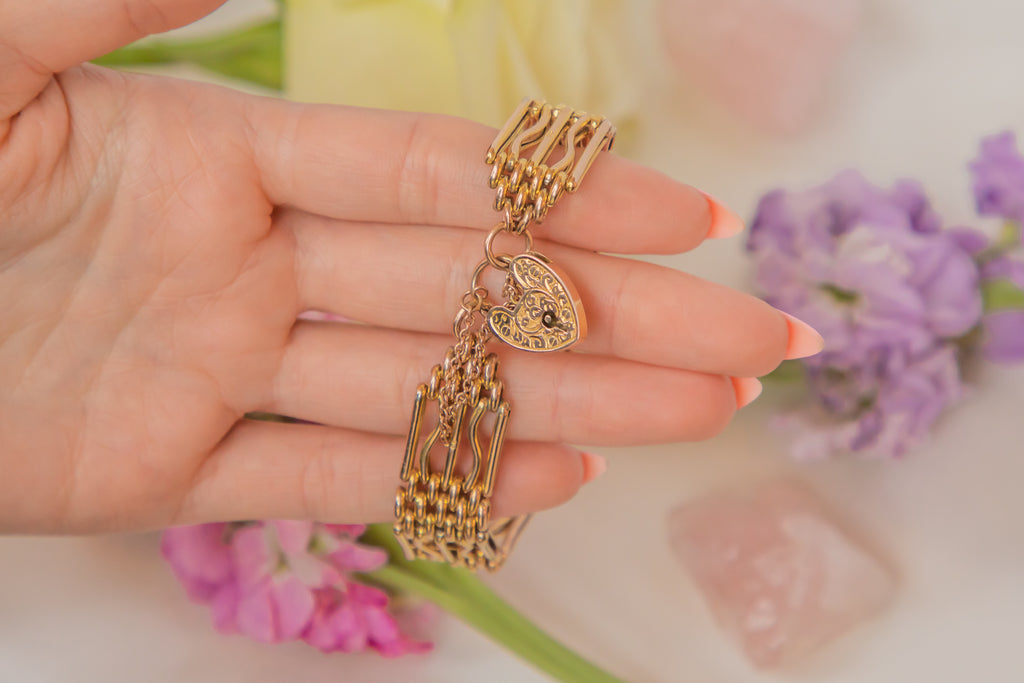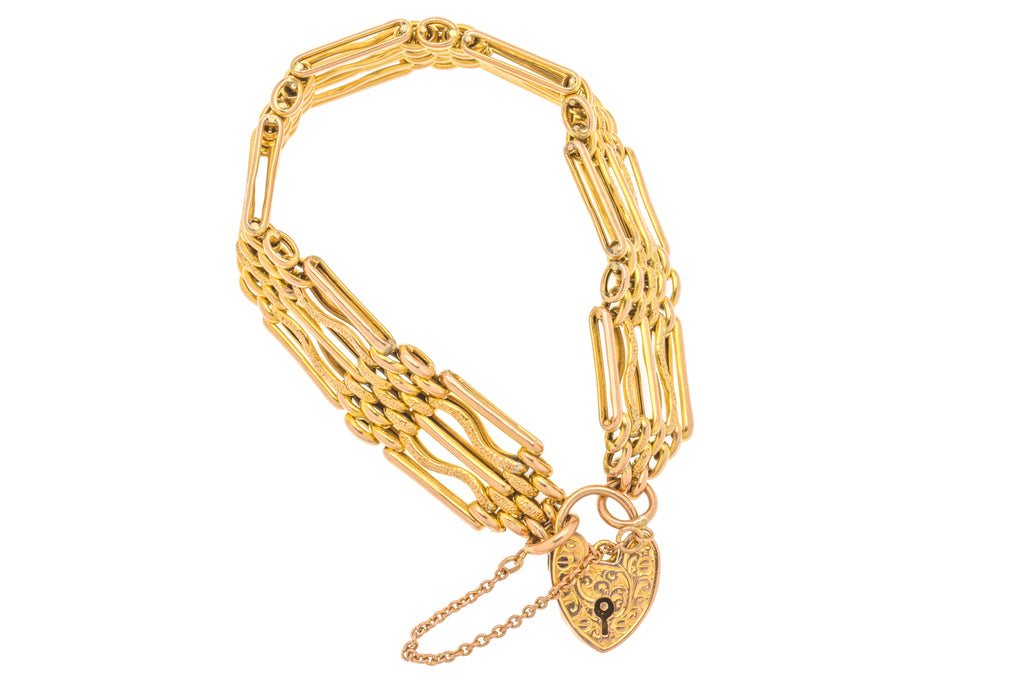 Antique 9ct Gold Gate Bracelet, Engraved Heart Padlock, 16.5g