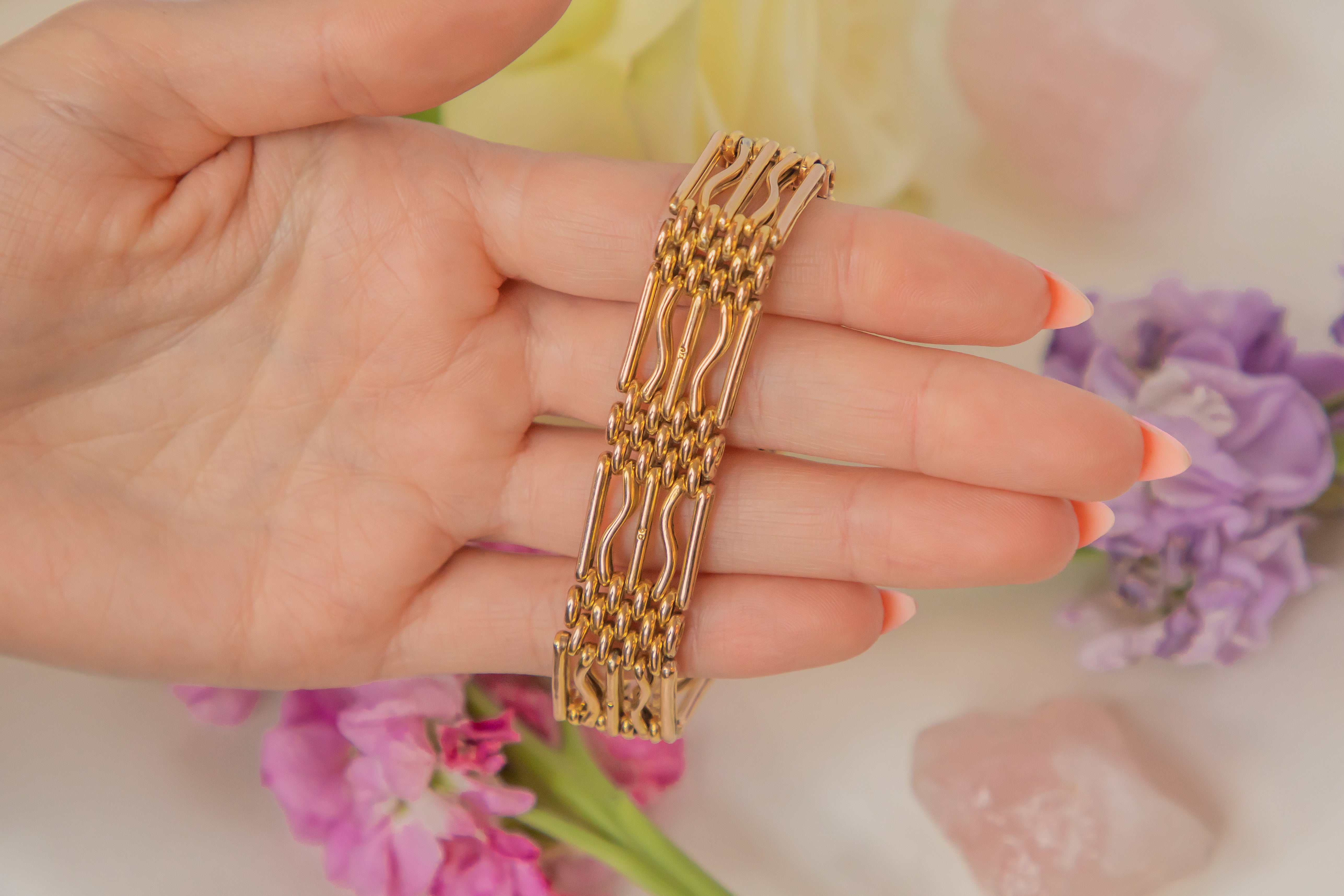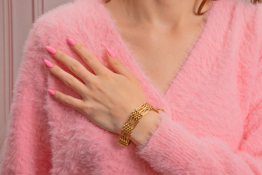 You will not regret making this antique 9ct Gold Gate bracelet the newest addition to your jewellery box! Oozing splendour from her every crevice, her richly saturated 9ct Gold links have a fluid movement, flowing effortlessly around your wrist.