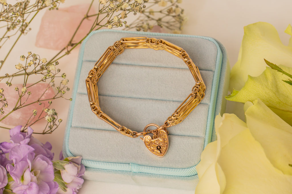 This Victorian bracelet's links alternate between smooth straight links and textured wavy links, all tied together by a perfectly engraved 9ct Gold heart Padlock. Not only is she heavenly to look at and wear, but she is also steeped in romantic sentiment, once used as a way to display faithfulness to a loved one who was away for extended periods. We can't think of a better way to gesture your love to someone than with this Victorian gate bracelet!