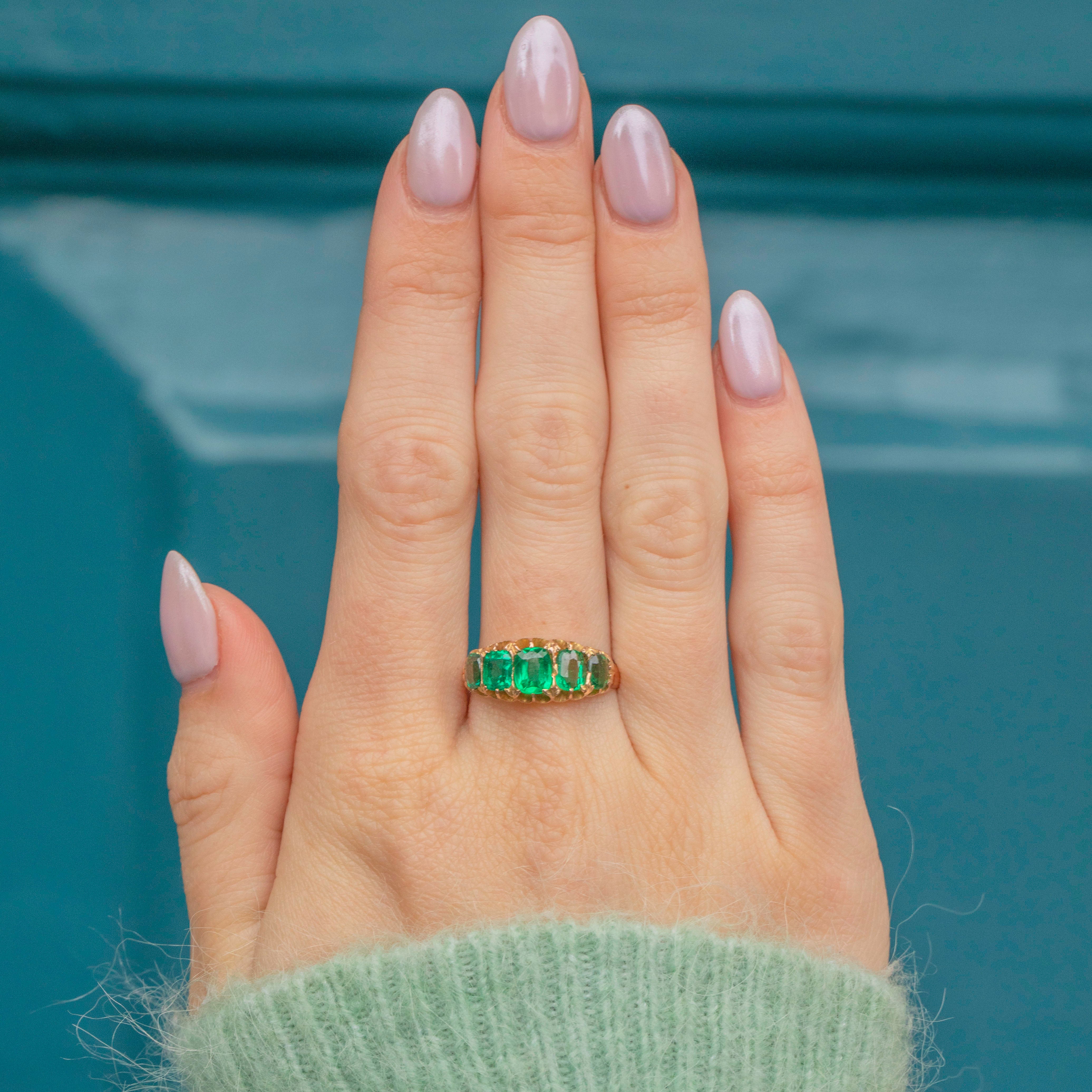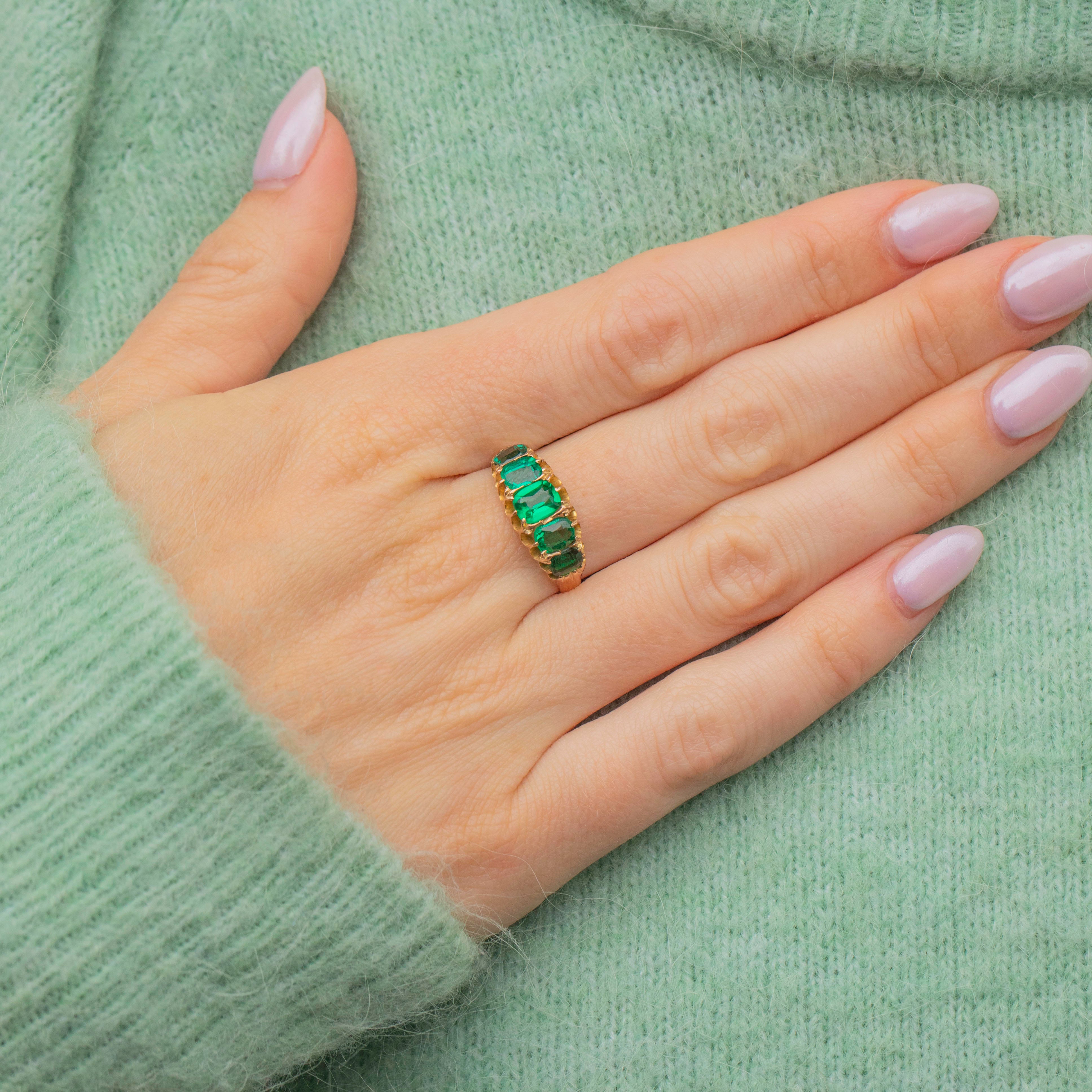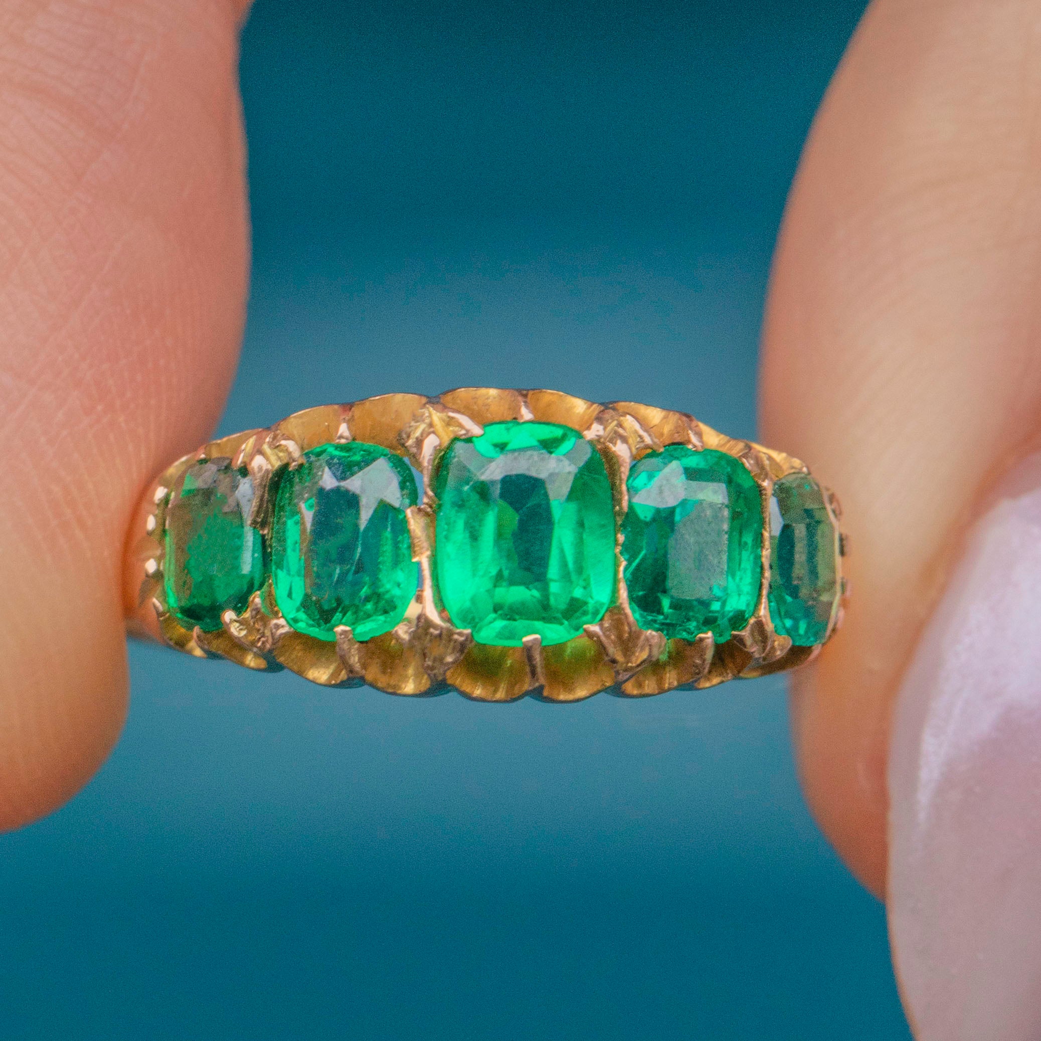 This antique 9ct Gold Green Paste five stone ring is a delight! A true conversation stater, this eye-catching Victorian 9ct Gold ring is bursting with character and charm.