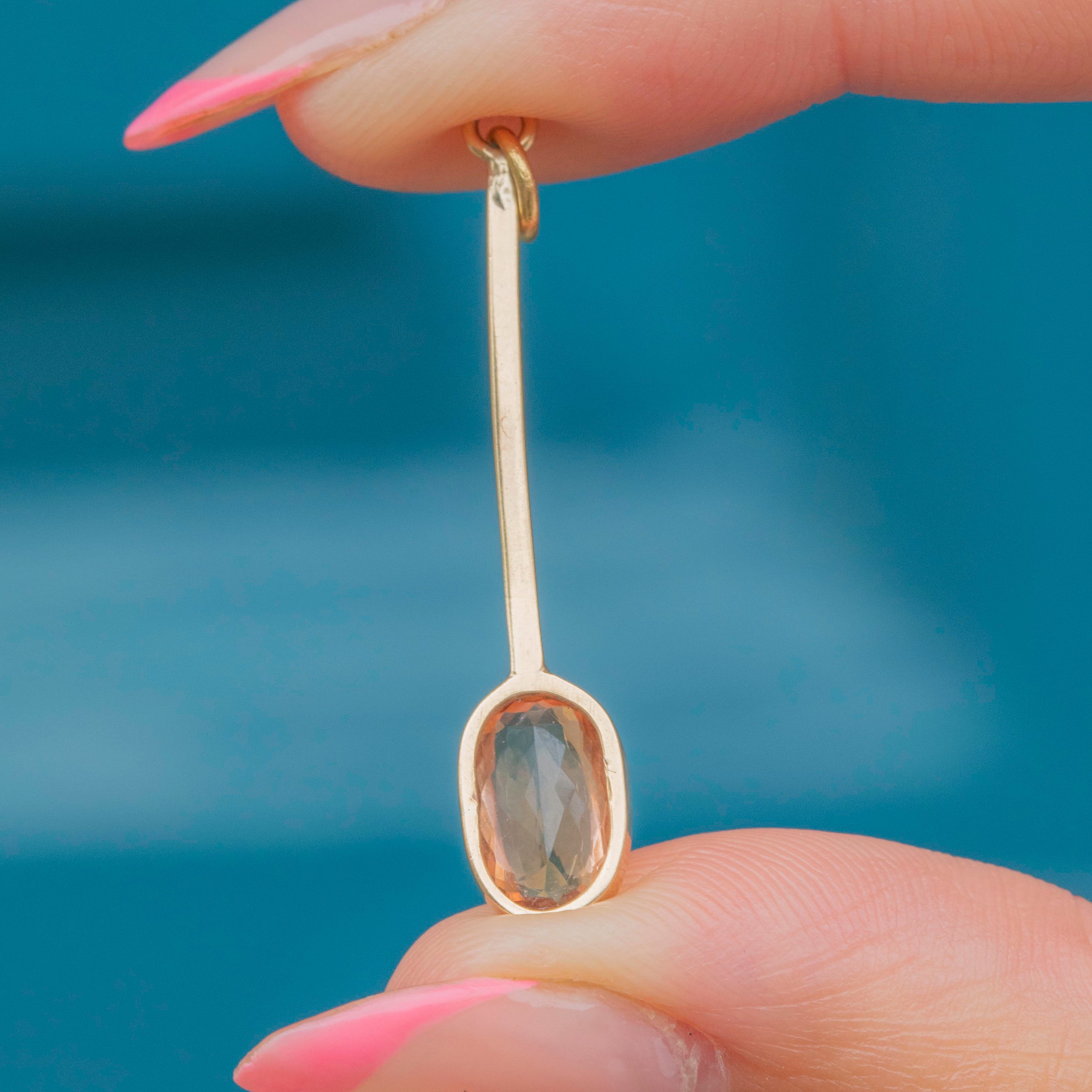 The Topaz is set in a smooth bezel, and when suspended from a fine Gold chain, the bar drop creates a sophisticated silhouette that will flatter your neckline. Endlessly appealing, this Victorian Imperial Topaz pendant will make a timeless addition to your collection!