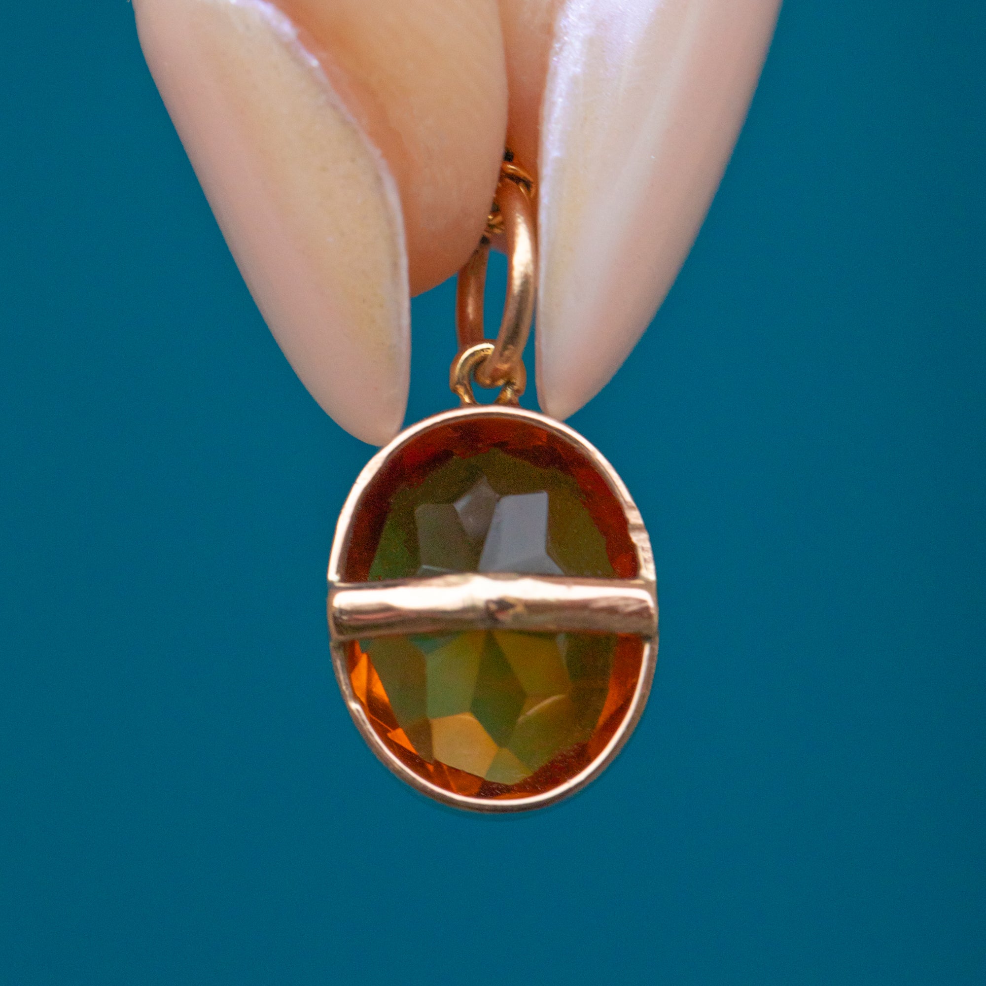 EXCELLENT. This antique 9ct Gold Madeira Citrine pendant is in excellent condition. The Citrine has crisp facets with no visible surface wear and is securely held within its bezel setting. With a securely soldered jump ring, you can suspend this tasty treat from a chain and wear it with absolute confidence!