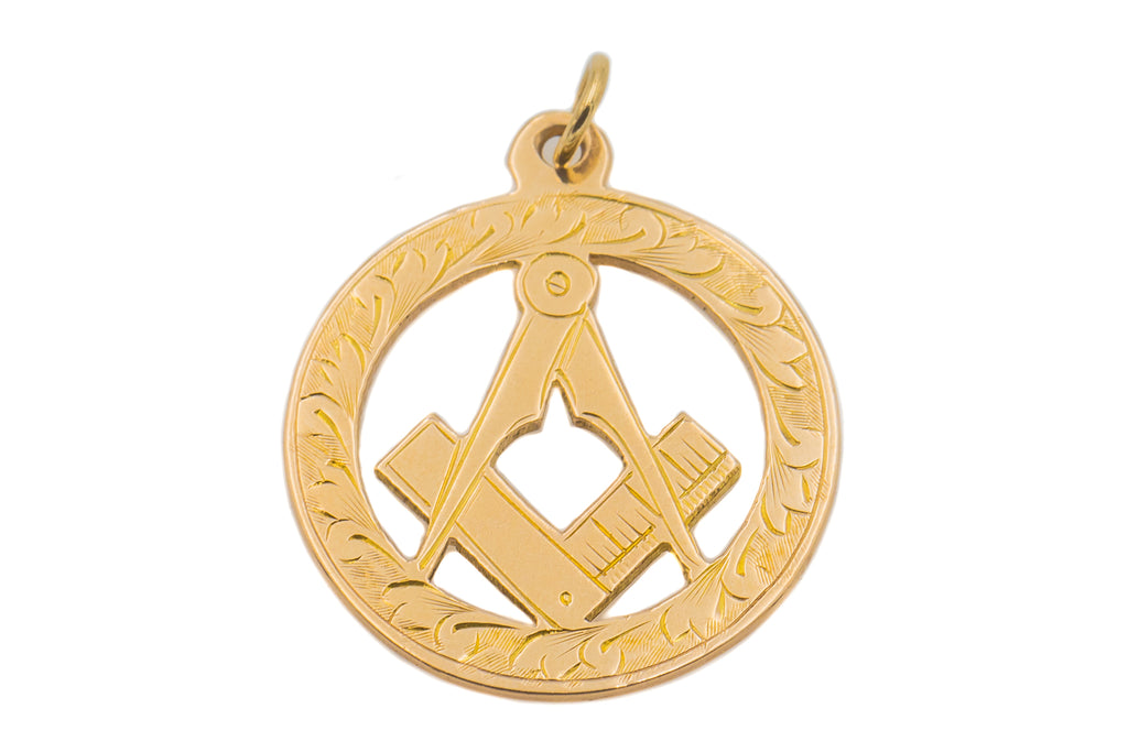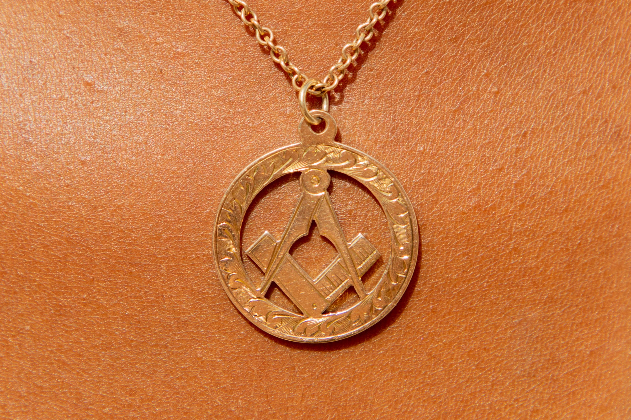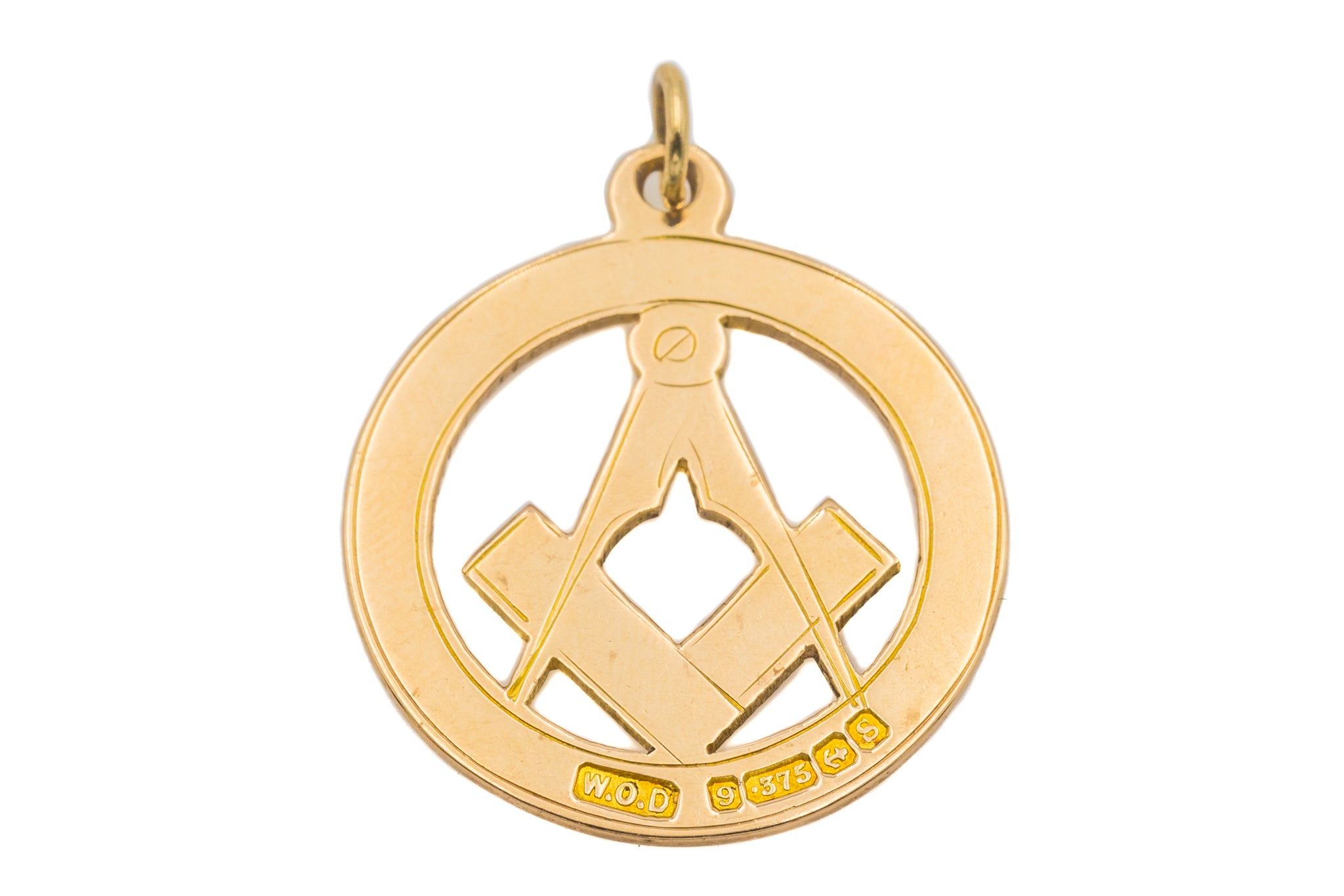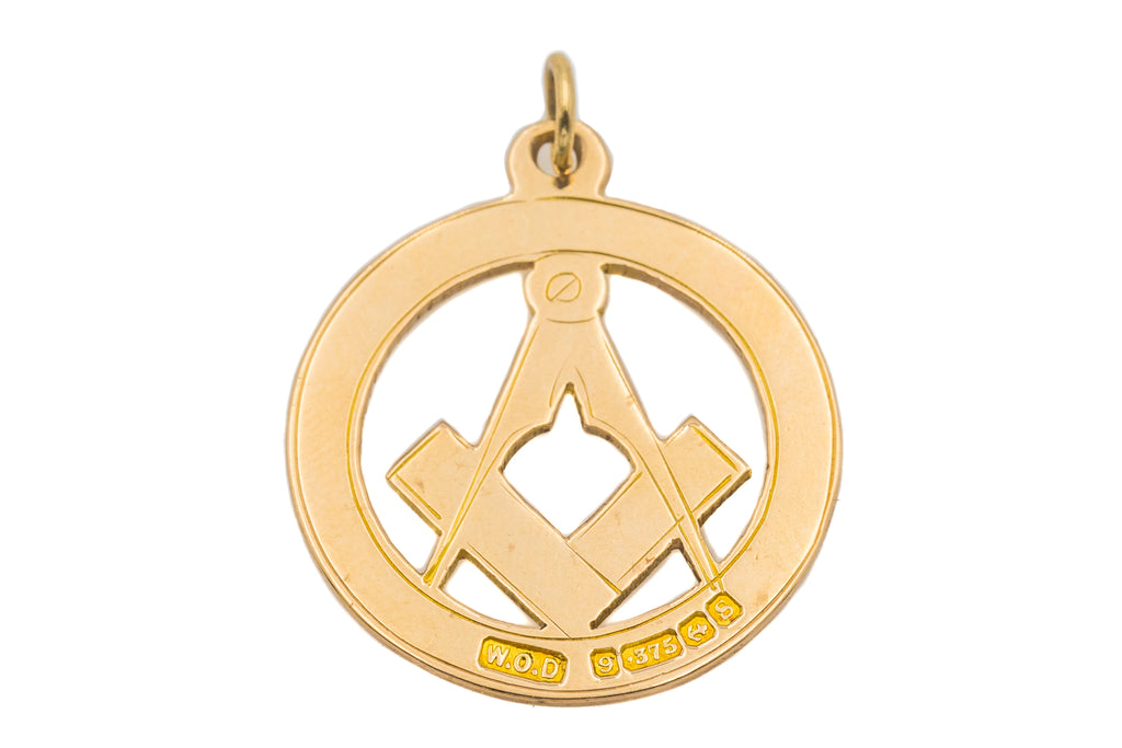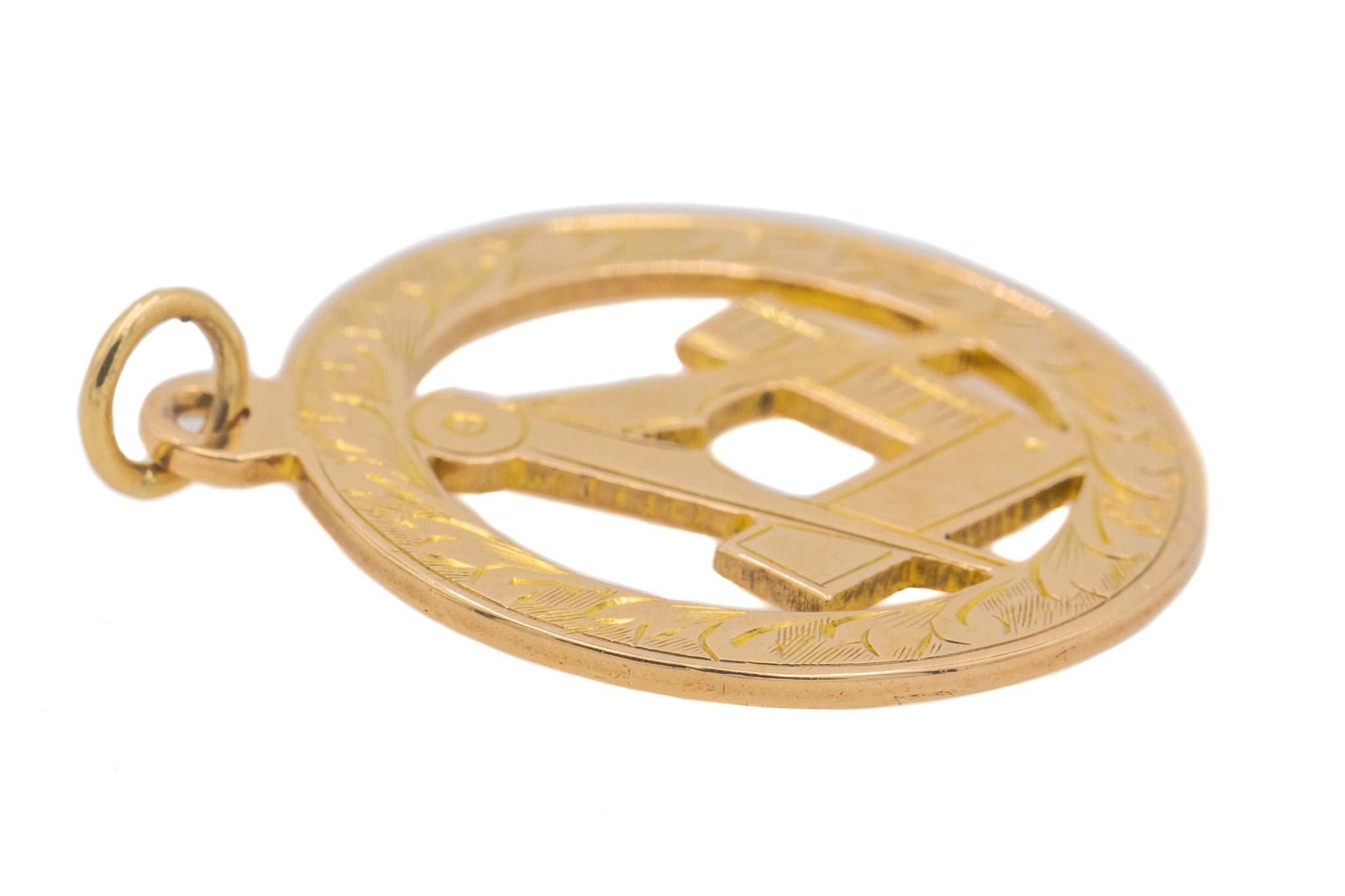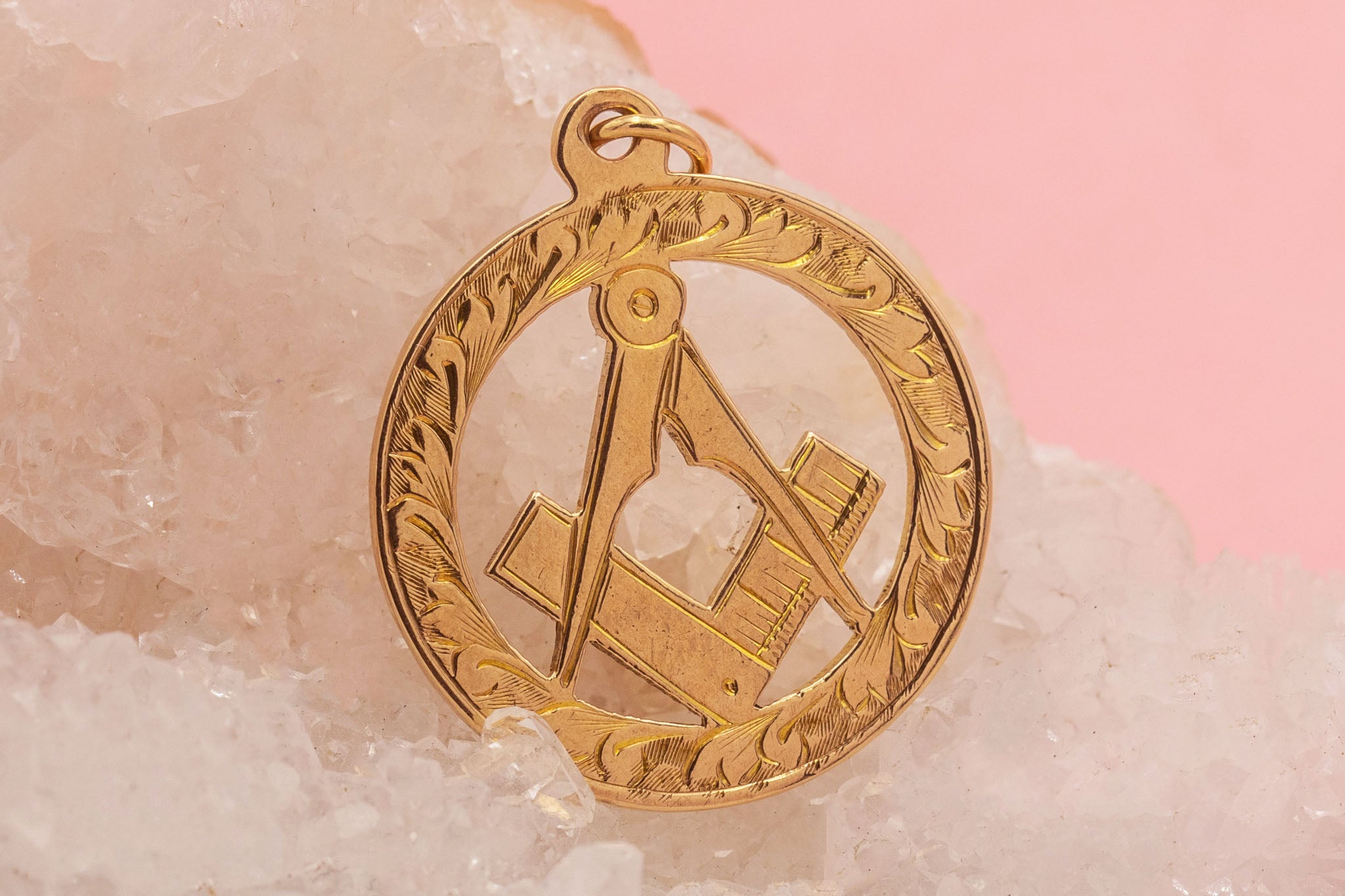 VERY GOOD. This antique 9ct Gold masonic compass pendant is in very good condition. The hallmarks are crisp and the front of the piece has been beautifully engraved. There is very minimal wear to the piece overall, and she can be worn with a Gold chain with ease!