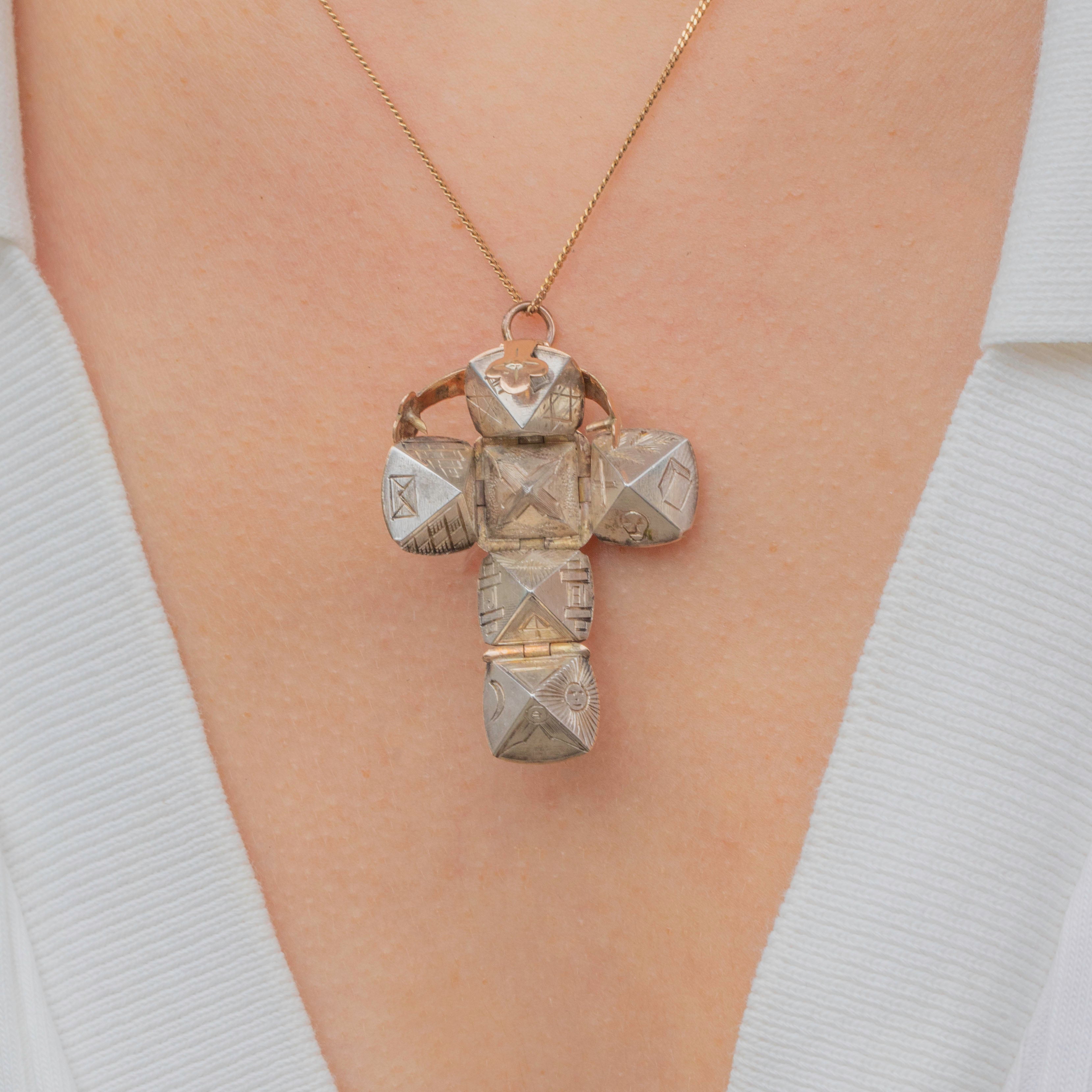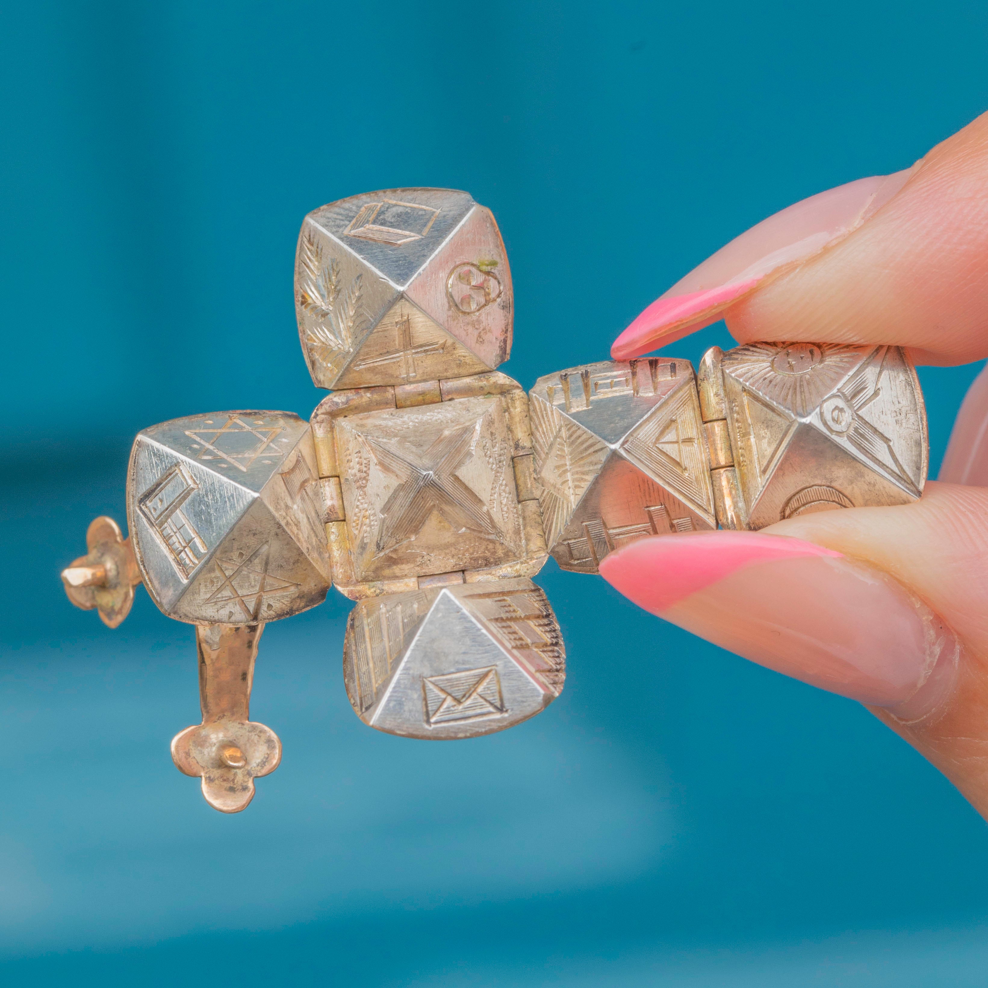 Open up this unique piece to reveal a cross with a myriad of curious engravings reflective of the Freemasonry beliefs popular at the time. This Victorian marvel holds mystery and history, leaving your mind to ponder the meaning of each etching. Antique and wondrous, this Victorian Masonic pendant is a special part of history.