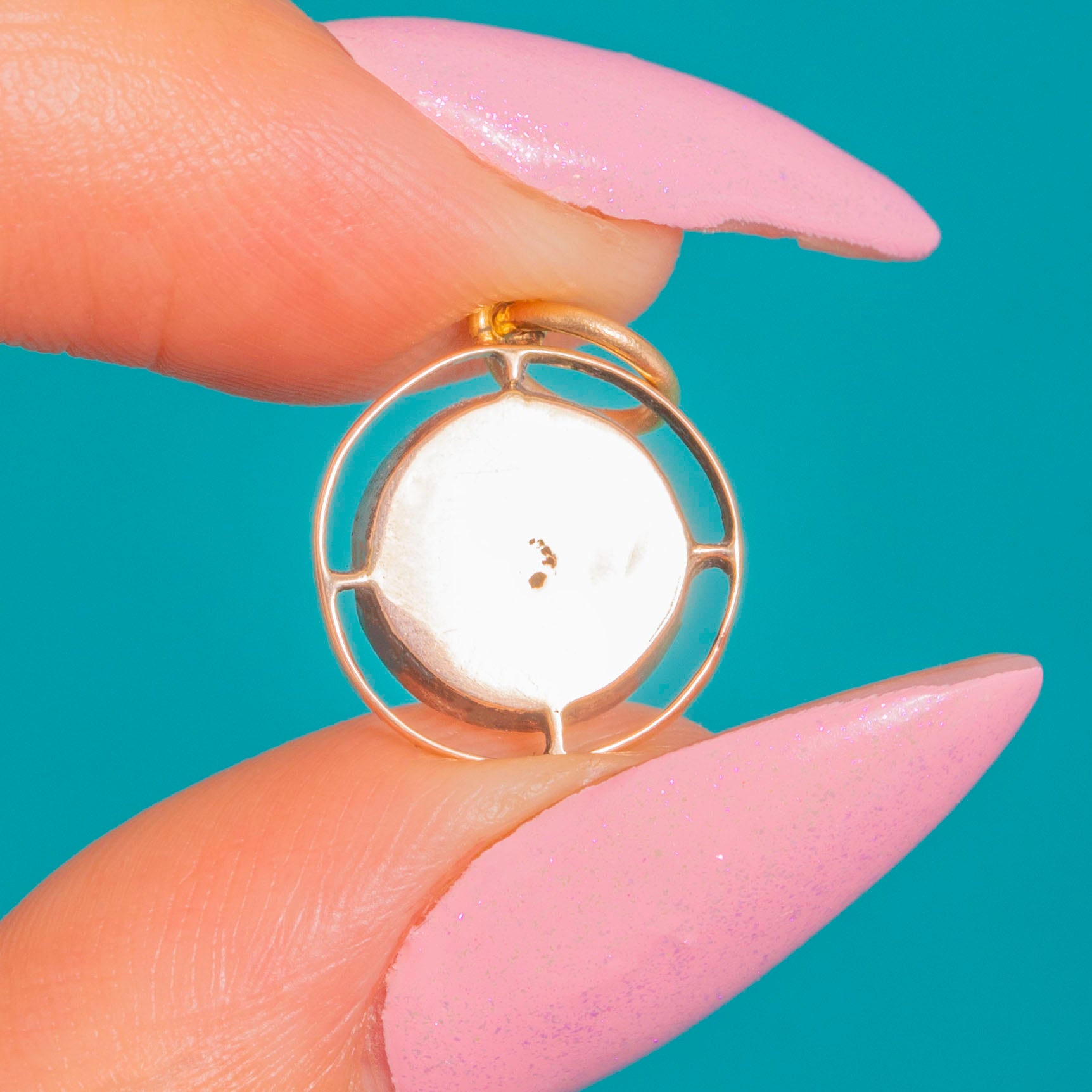 This antique Victorian Moonstone charm is a study in quiet elegance. Set in warm 9ct Gold, the round domed Moonstone shimmers with ethereal bluish-white adularescence and soft peachy flashes, its glow accentuated by a refined open circular bezel and airy gallery. Delicate, minimalist and timeless, it’s the perfect petite treasure to elevate everyday styling.