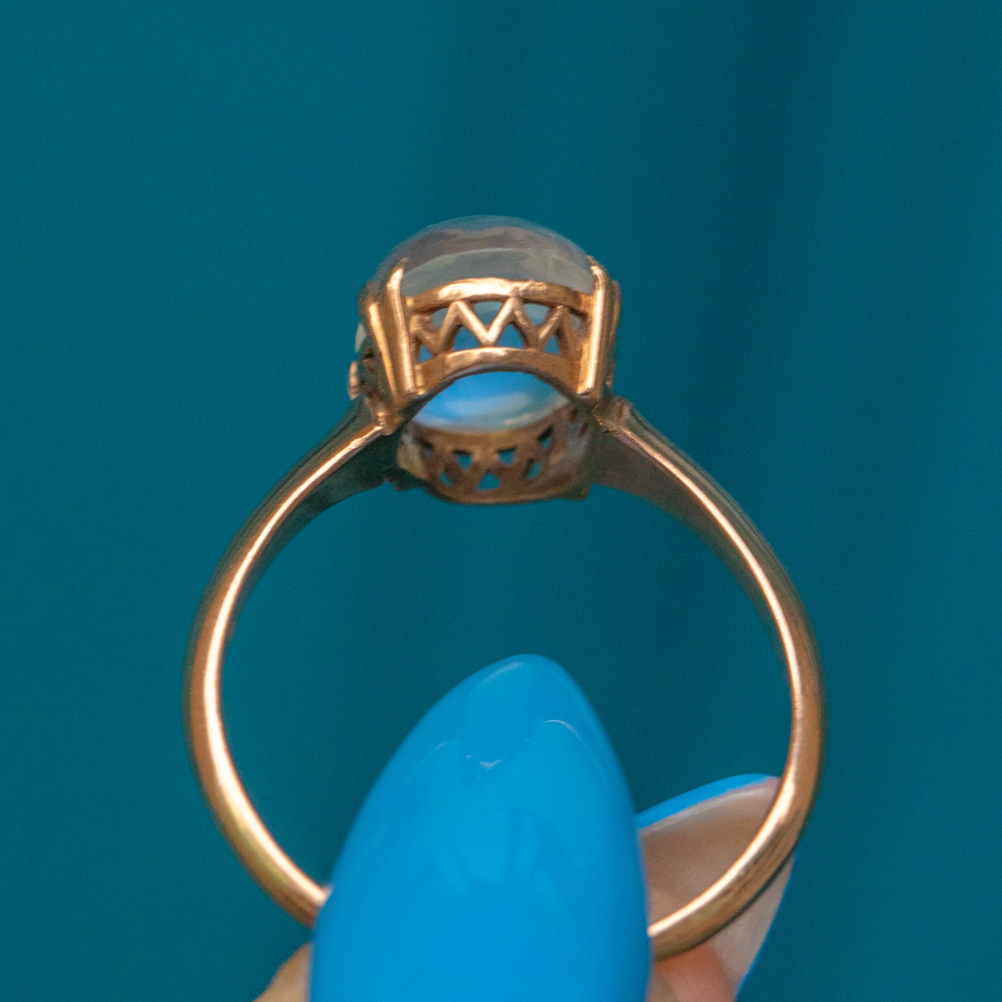 EXCELLENT. This antique 9ct Gold Moonstone cabochon ring is in wonderful condition. Her Moonstone is radiant, with some minor surface wear only noticeable under a jeweller's loupe. She sits securely within her 9ct Gold claw settings and band, which is free from any visible signs of wear. In brilliant condition, she is a must have!
