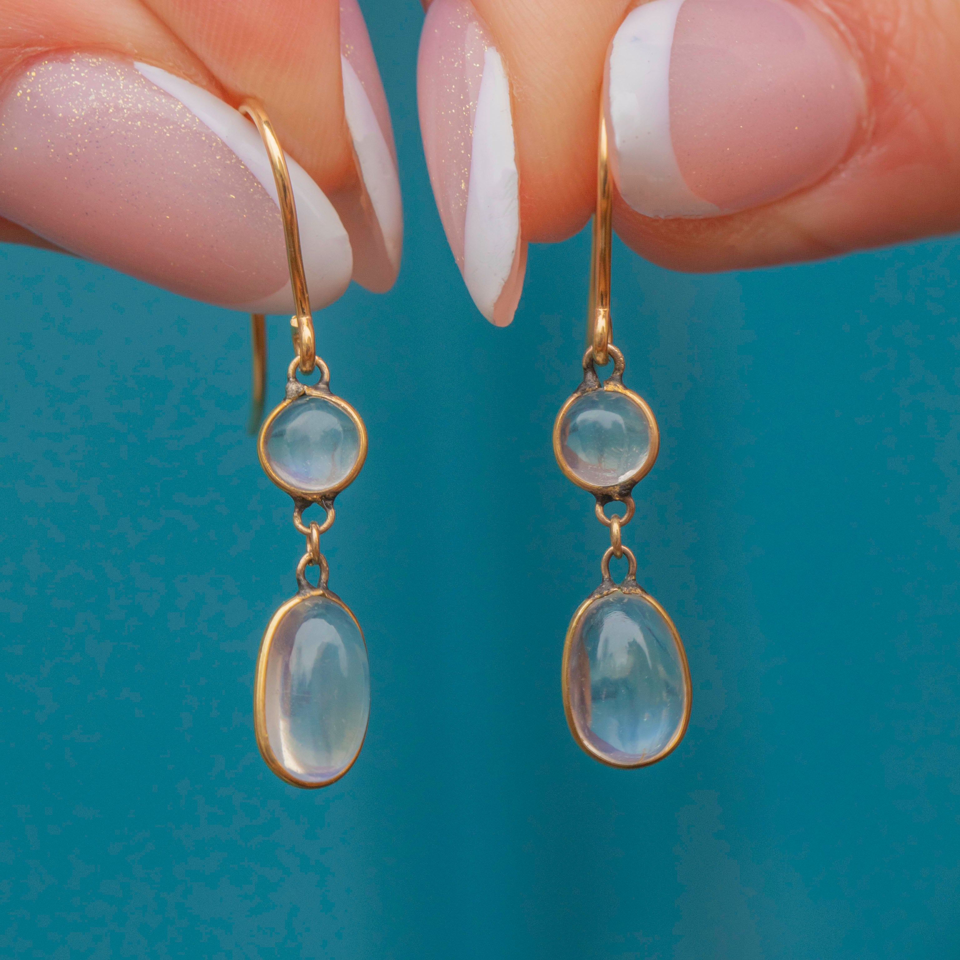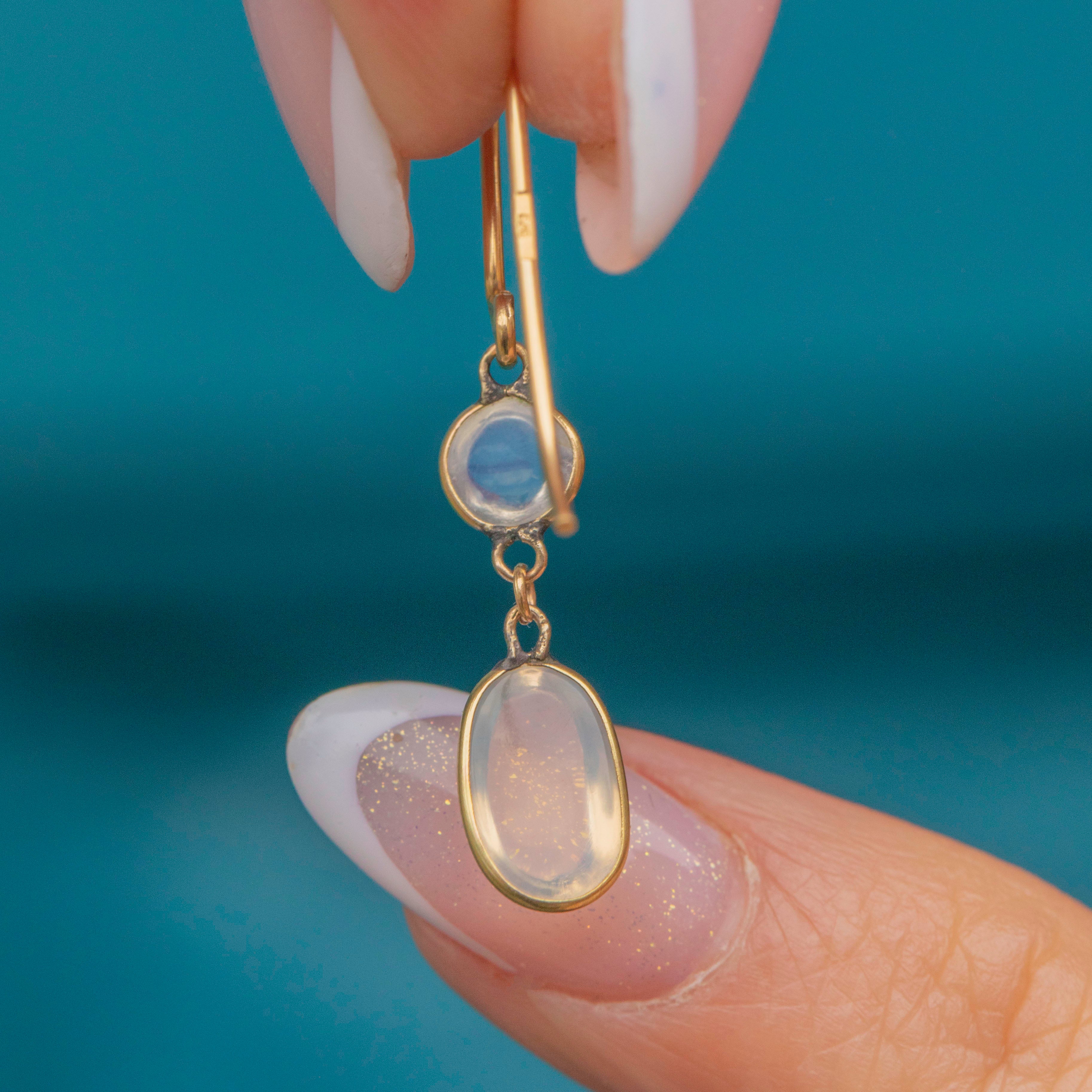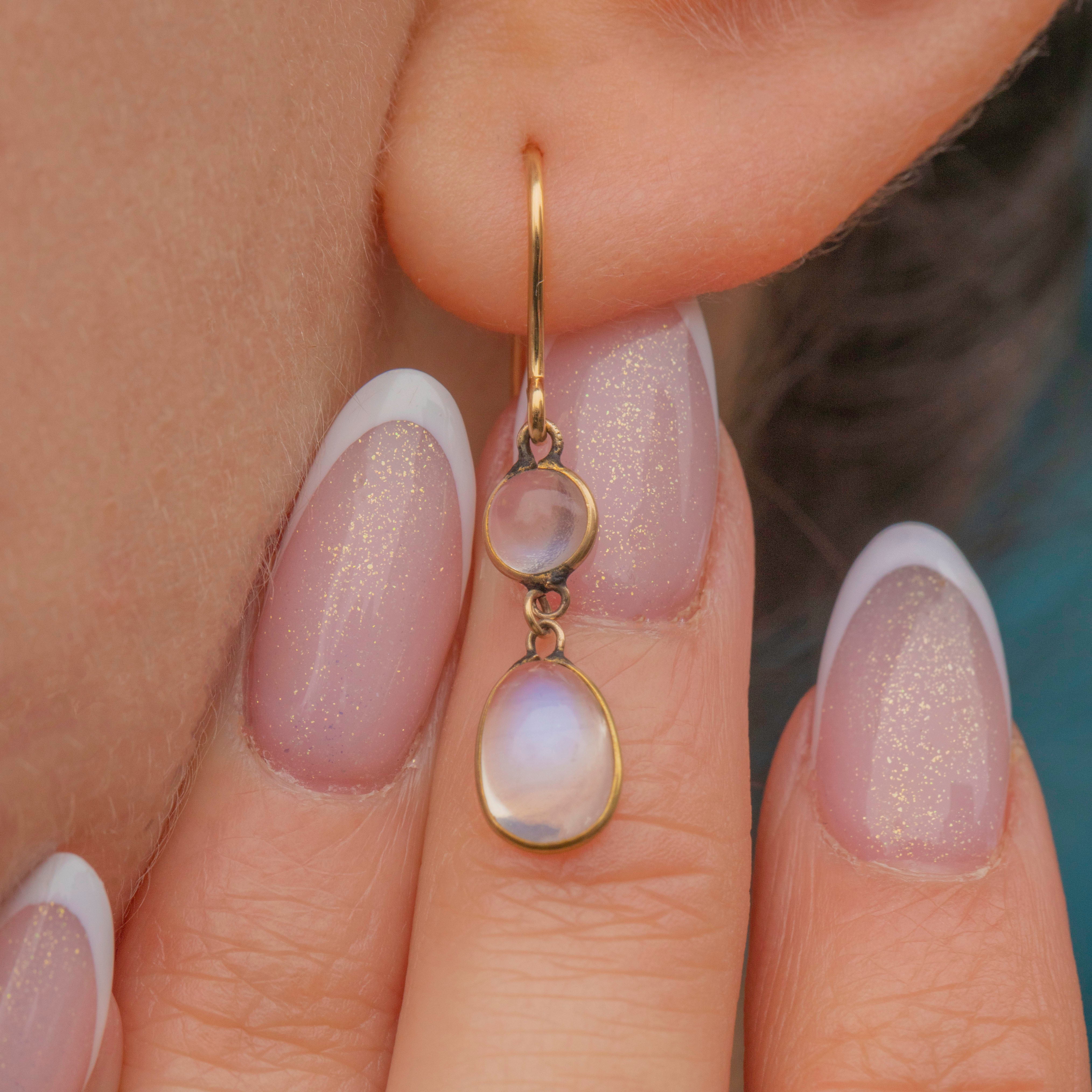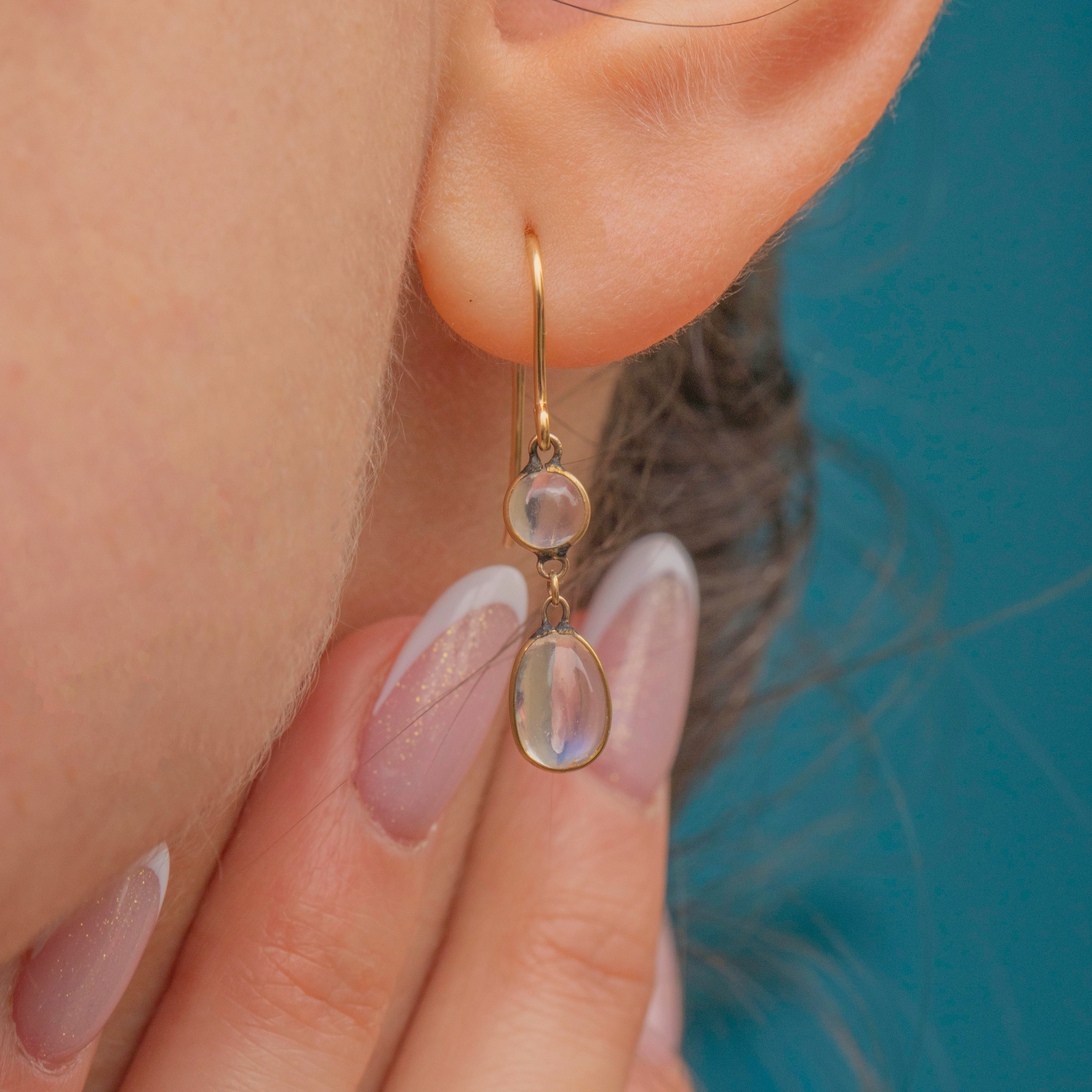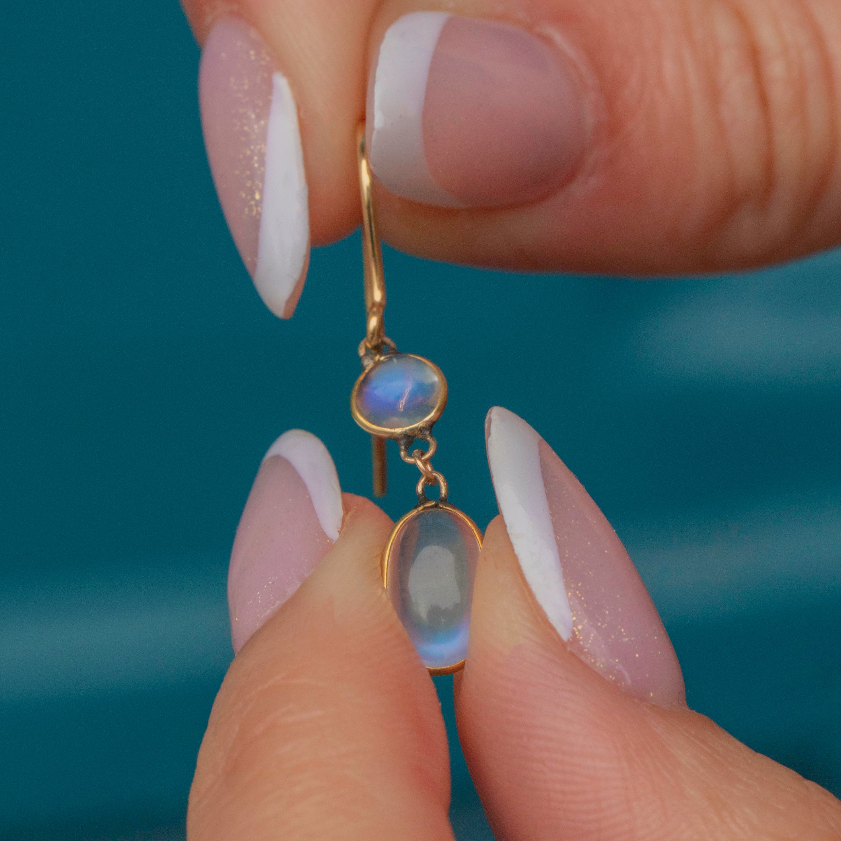 Admire the adularescence within each plump Moonstone cabochon as they swish and sway in the light. Ethereal and endlessly wearable, these antique earrings fall elegantly along the jawline!