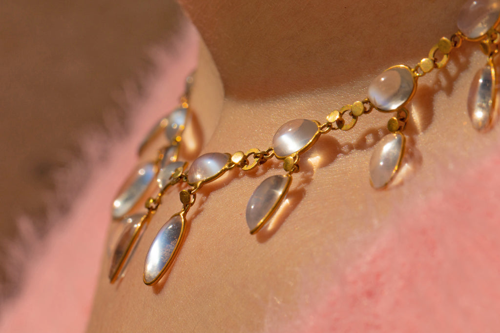 We adore how this antique fringe necklace looks around the neck, providing a beautiful statement! Each Moonstone has an ethereal glow coming from within; this piece is steeped in Victorian elegance, a true reflection of the era itself.