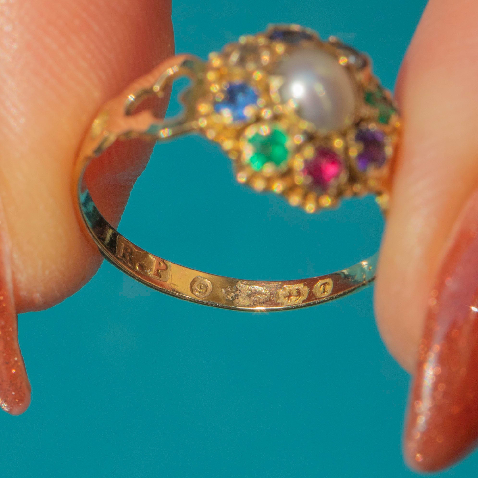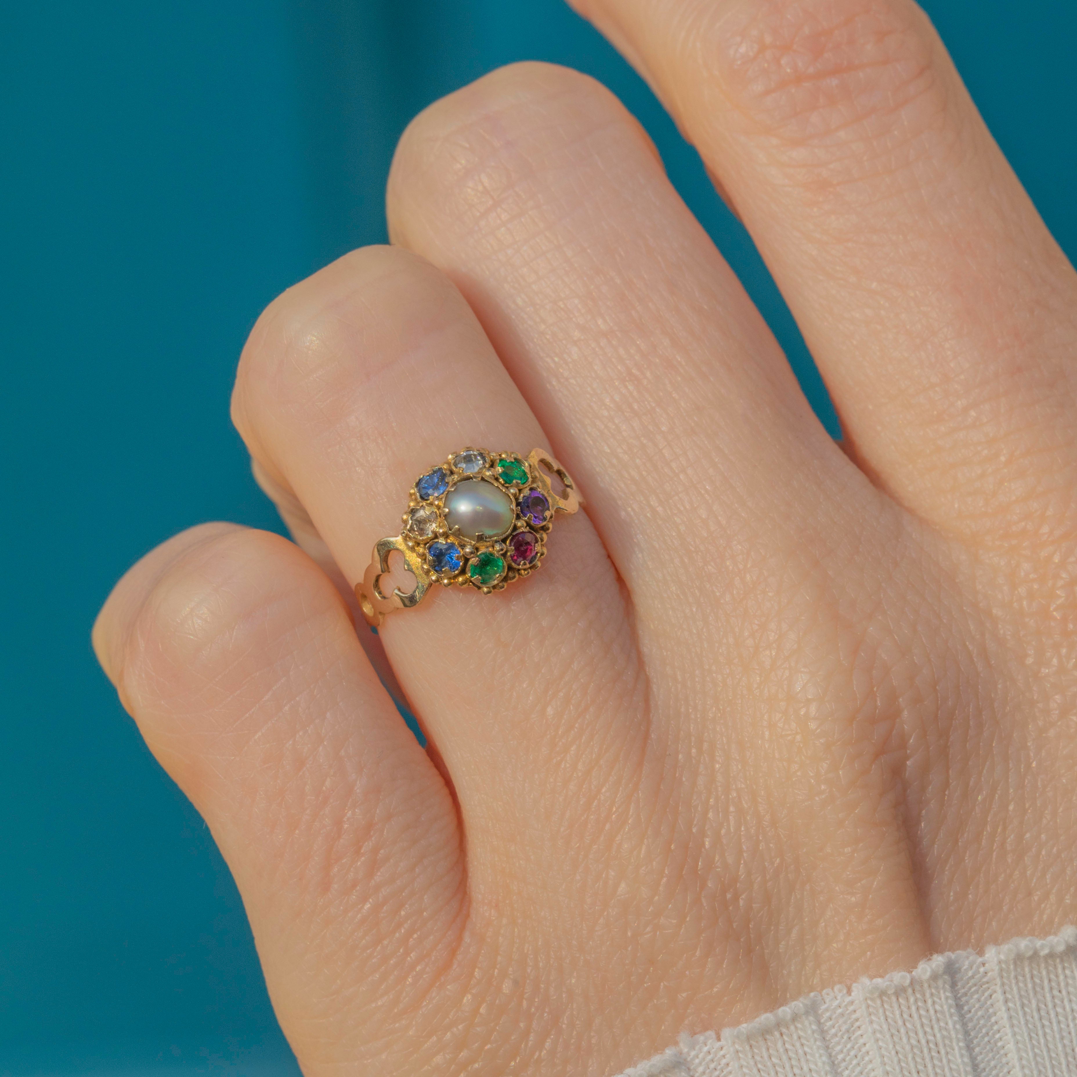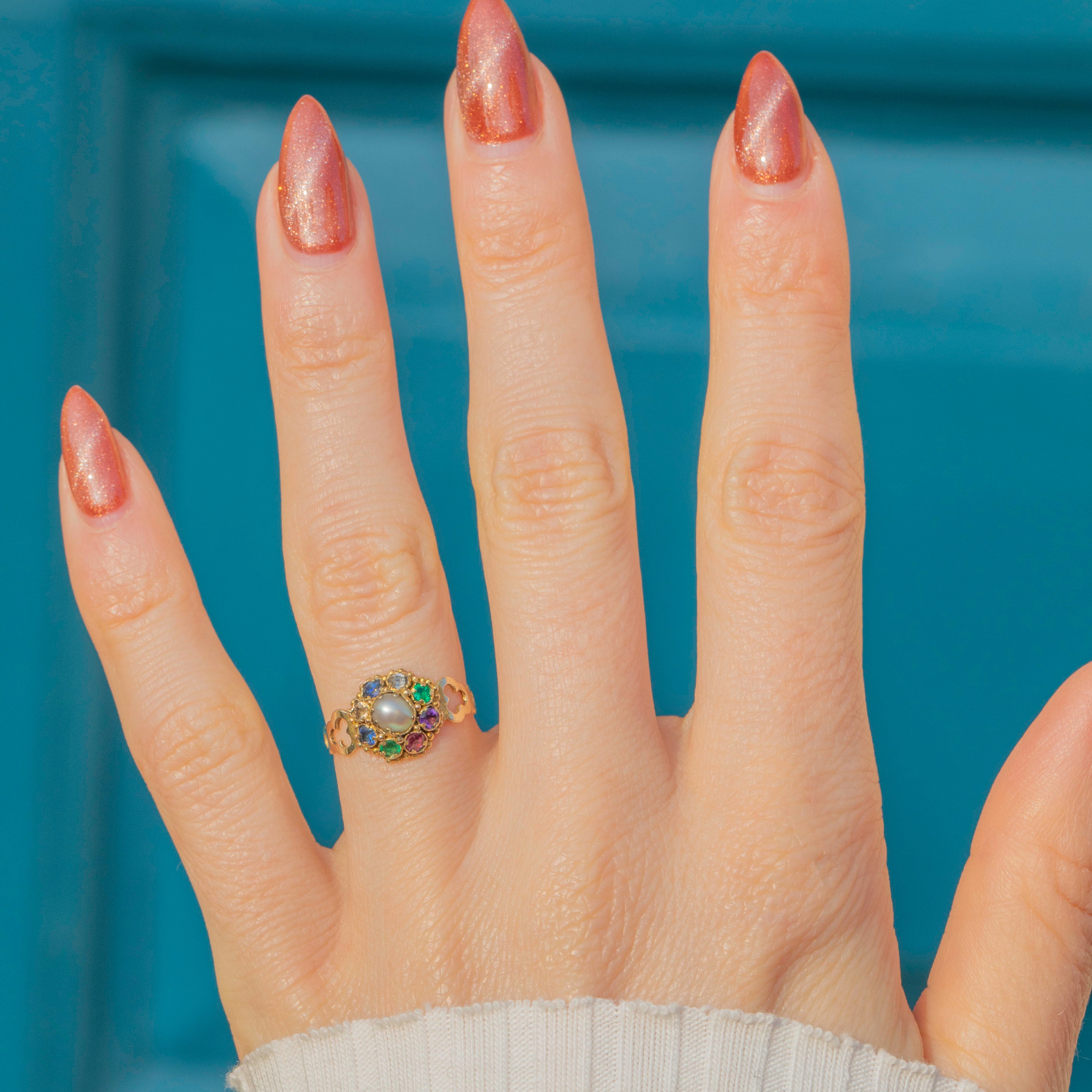 The Victorians were renowned for their use of symbolism in their jewellery, and it was likely that this ring drew inspiration from the Indian Navaratna ring. The ring is home to the following gemstones: Ruby, symbolising the sun, Diamond - Venus, Emerald - Mercury, Garnet - Rahu, Pearl - the moon and blue Sapphire - Saturn.