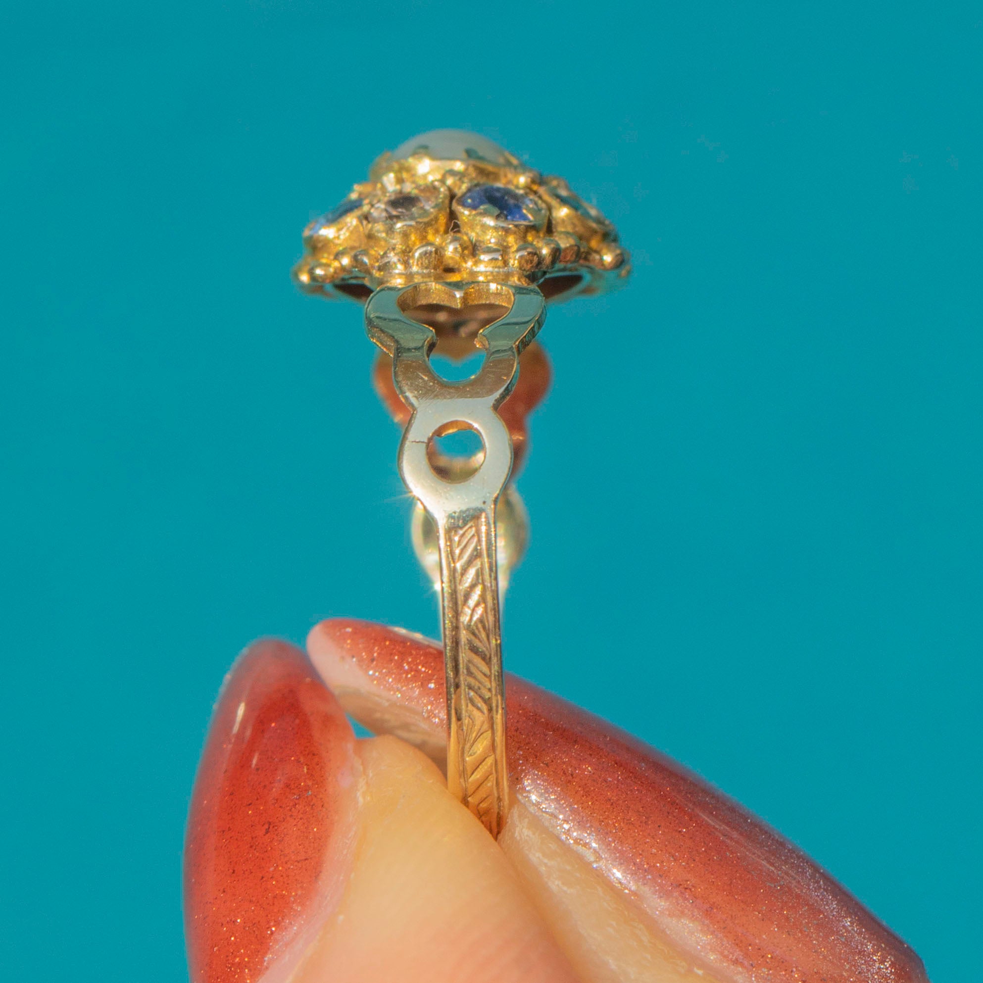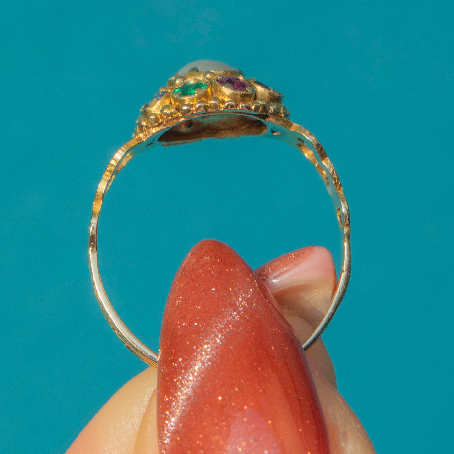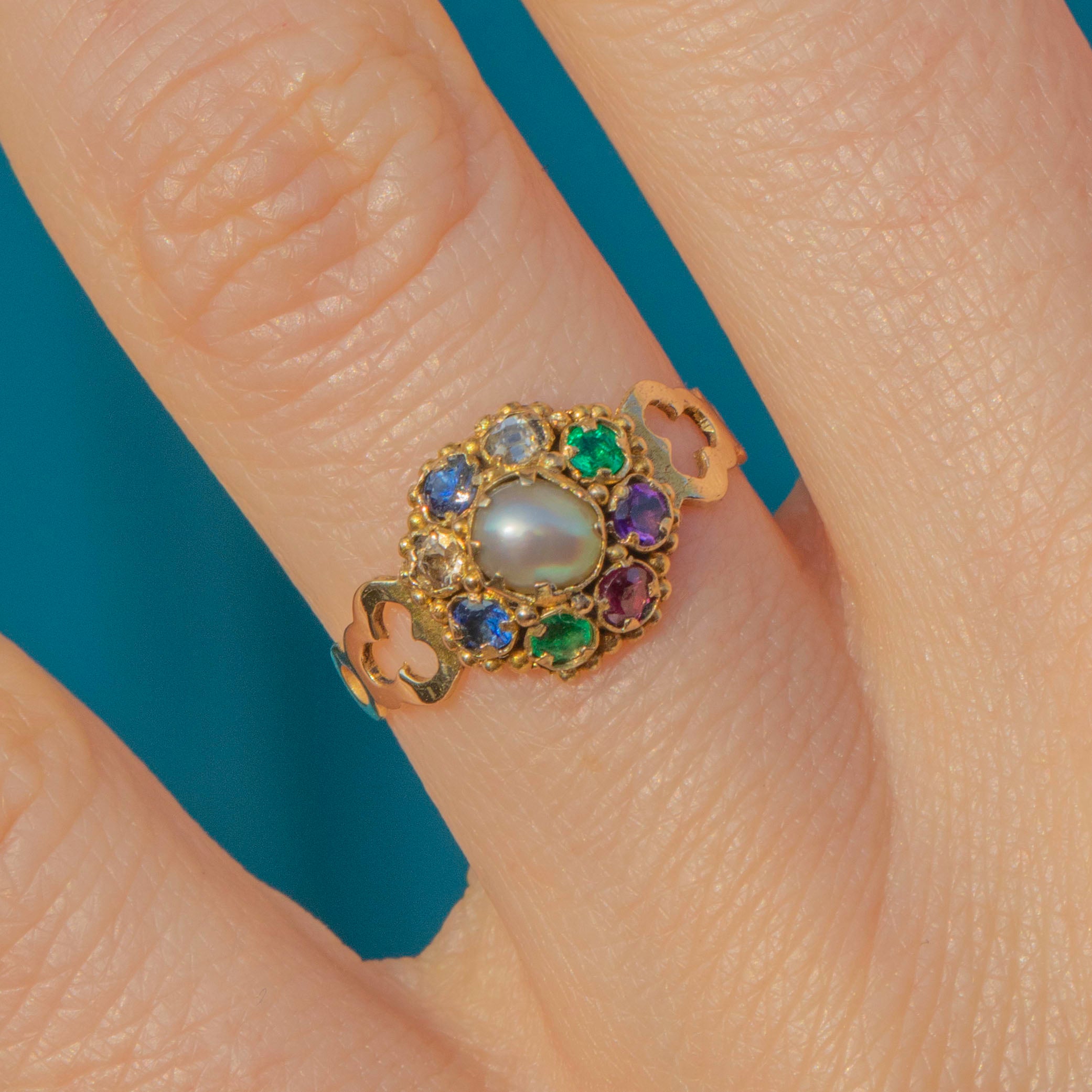 The Victorians were renowned for their use of symbolism in their jewellery, and it was likely that this ring drew inspiration from the Indian Navaratna ring. The ring is home to the following gemstones: Ruby, symbolising the sun, Diamond - Venus, Emerald - Mercury, Garnet - Rahu, Pearl - the moon and blue Sapphire - Saturn.