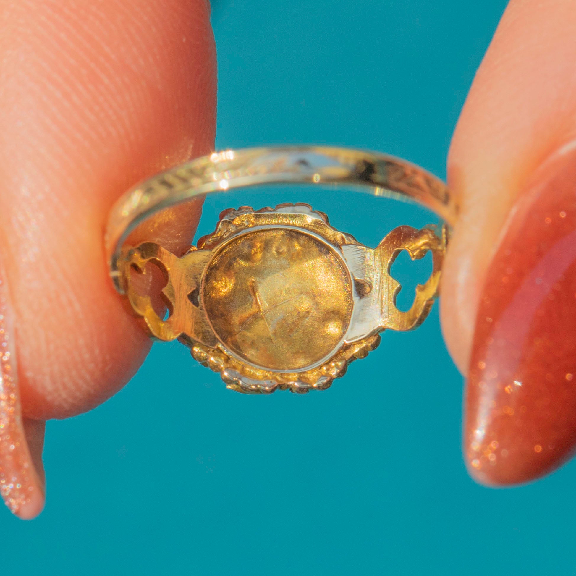 What's more, this ring is also acrostic, spelling the word dearest! Acrostic rings featuring gemstones to spell out romantic words to be gifted as tokens of love. This Victorian acrostic ring is a fine example, further enhanced by buttery 9ct Gold, granulated details, and open-work shoulders, creating a decorative and feminine piece!