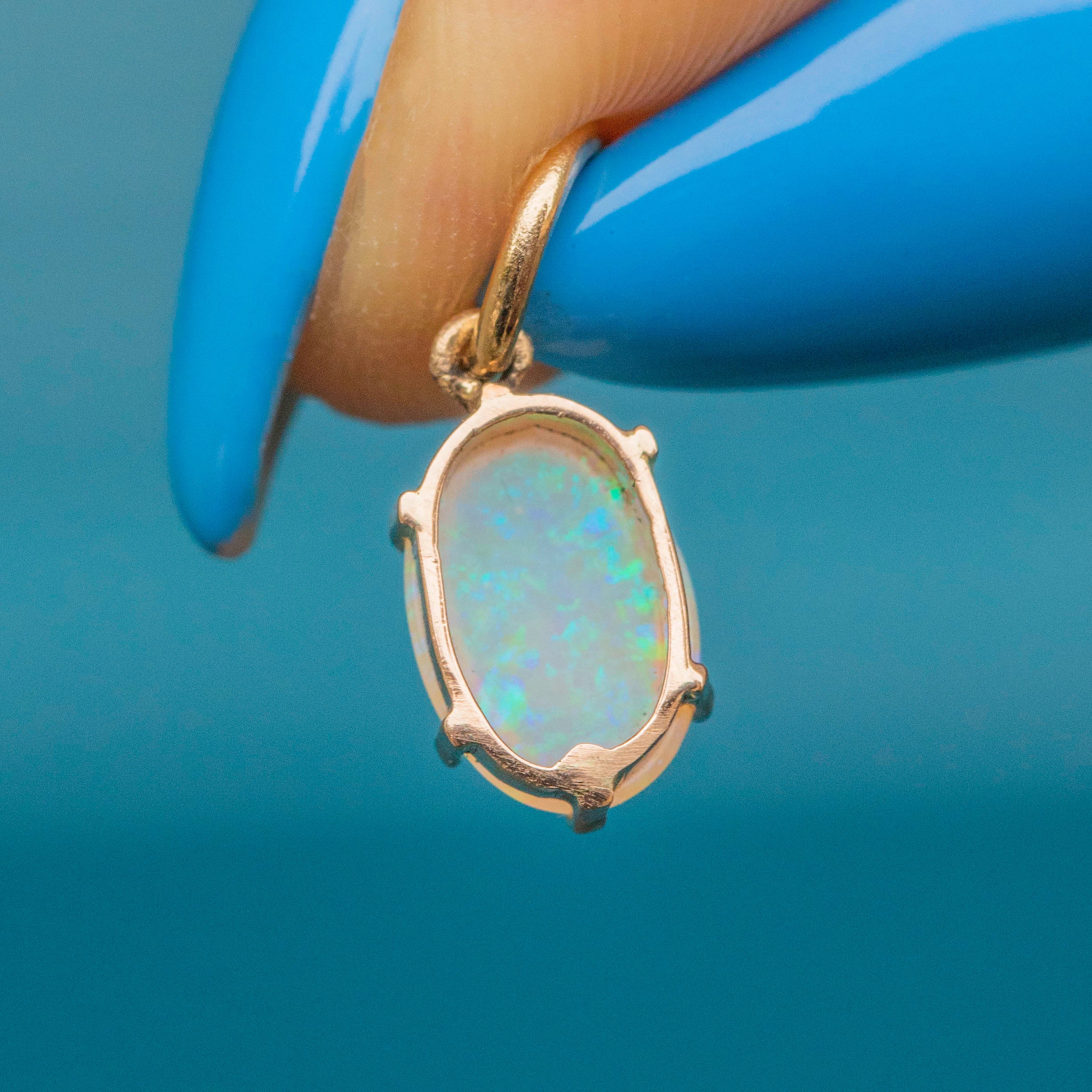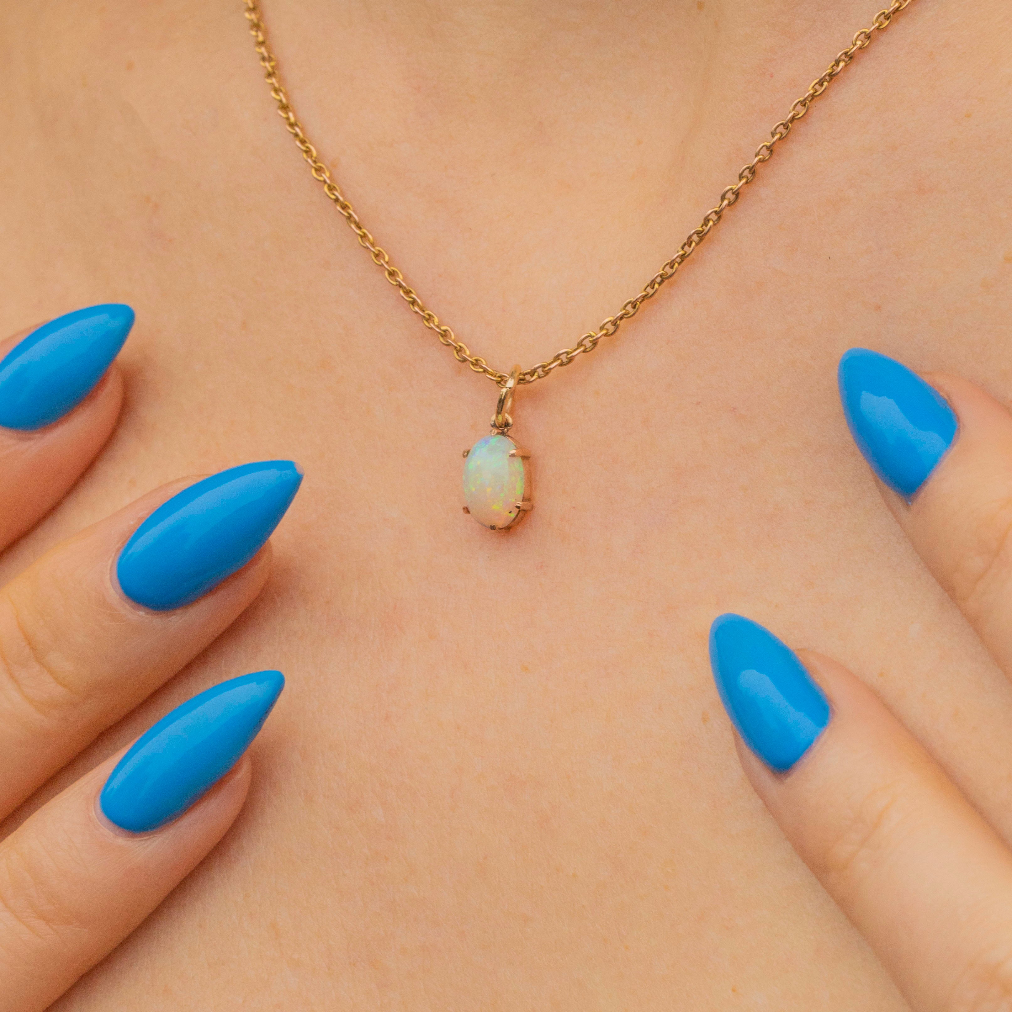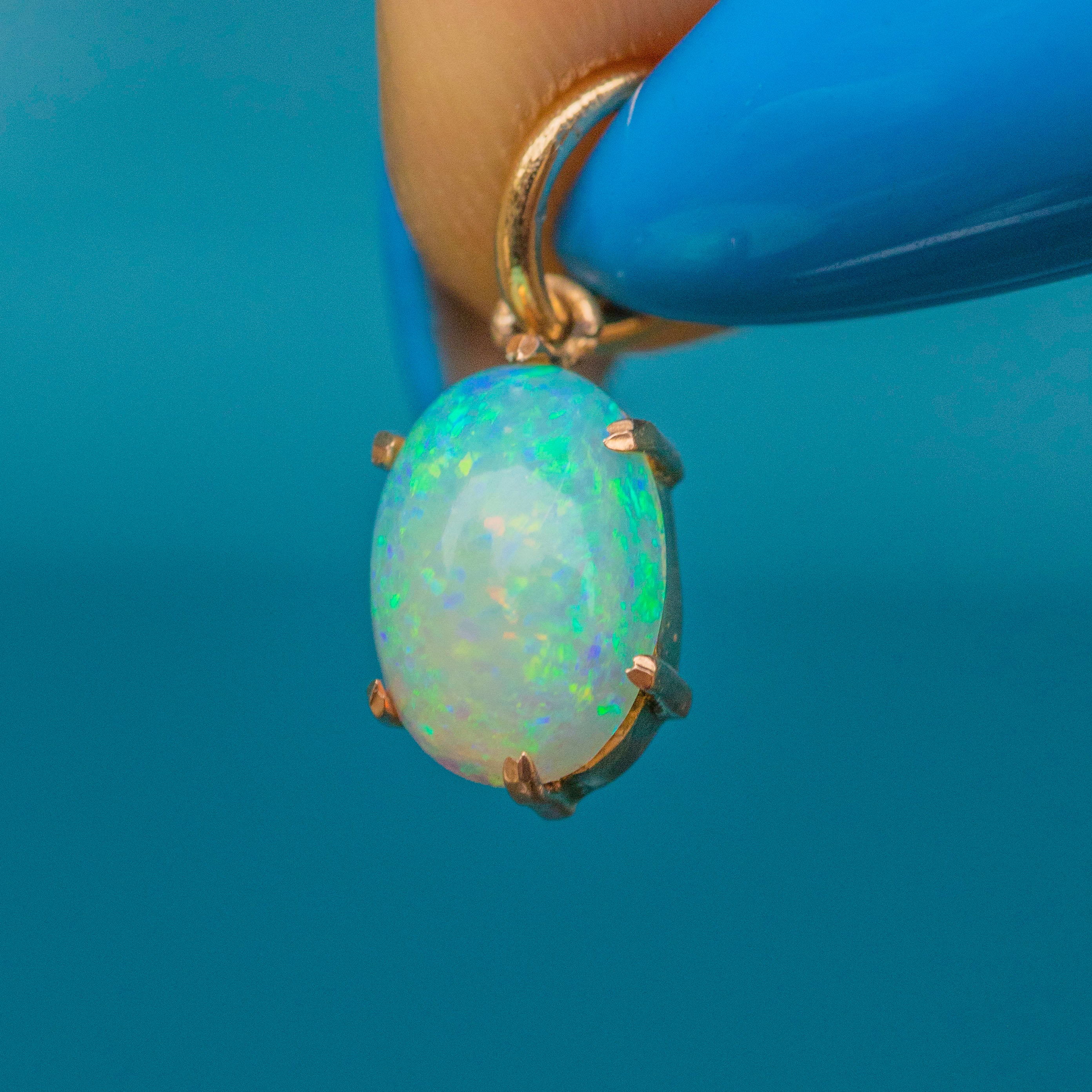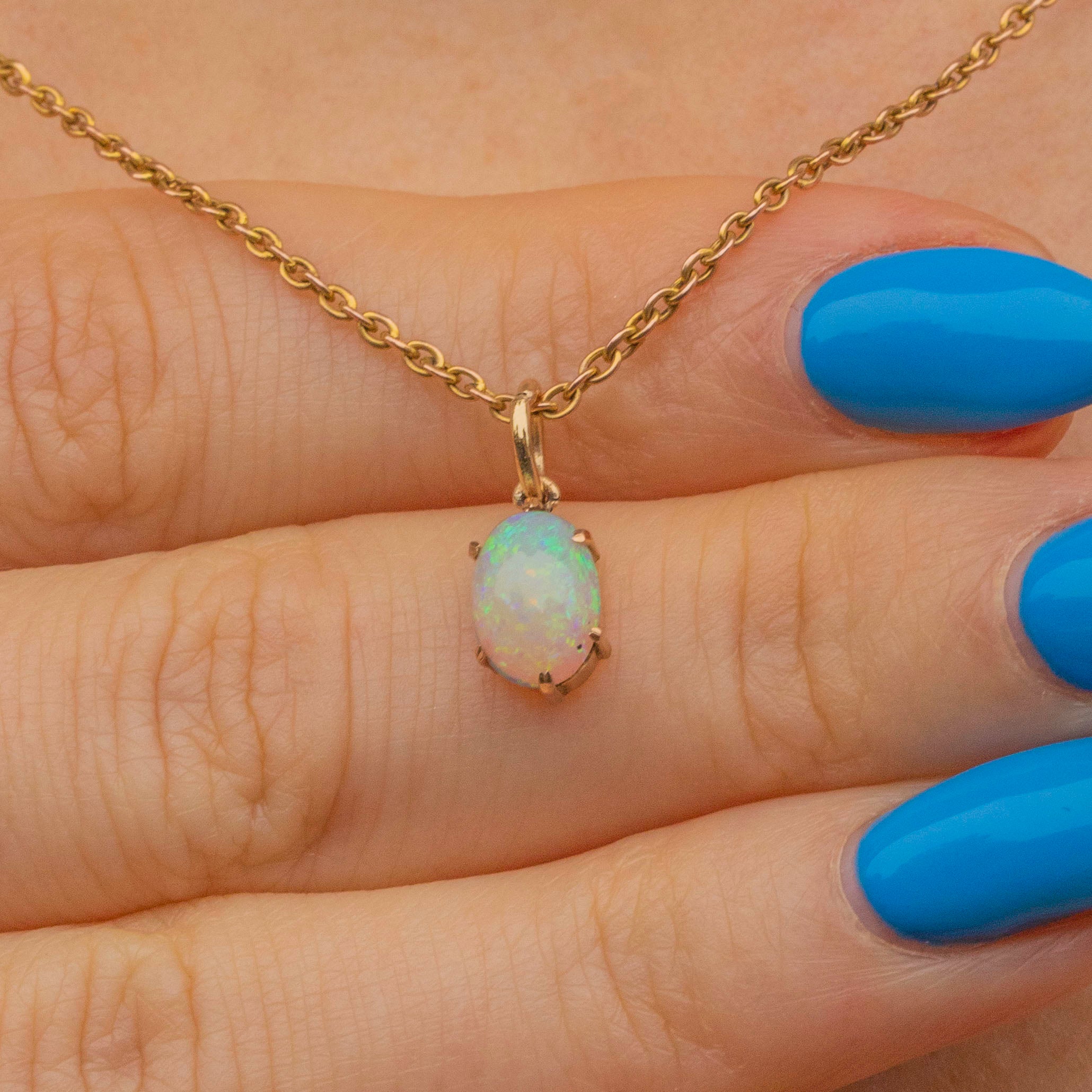 EXCELLENT. We are pleased to present this antique 9ct Gold Opal charm in excellent condition! Her Opal is a natural beauty, completely solid and in superb condition. She offers the most spectacular firework display of colour which is bound to enchant, with no damage to her smooth cabochon cut. All four claws are present and undamaged, with the 9ct Gold possessing a glossy finish. Complete with a soldered jump-ring, this Victorian Opal pendant is bound to set your collection apart from the rest!