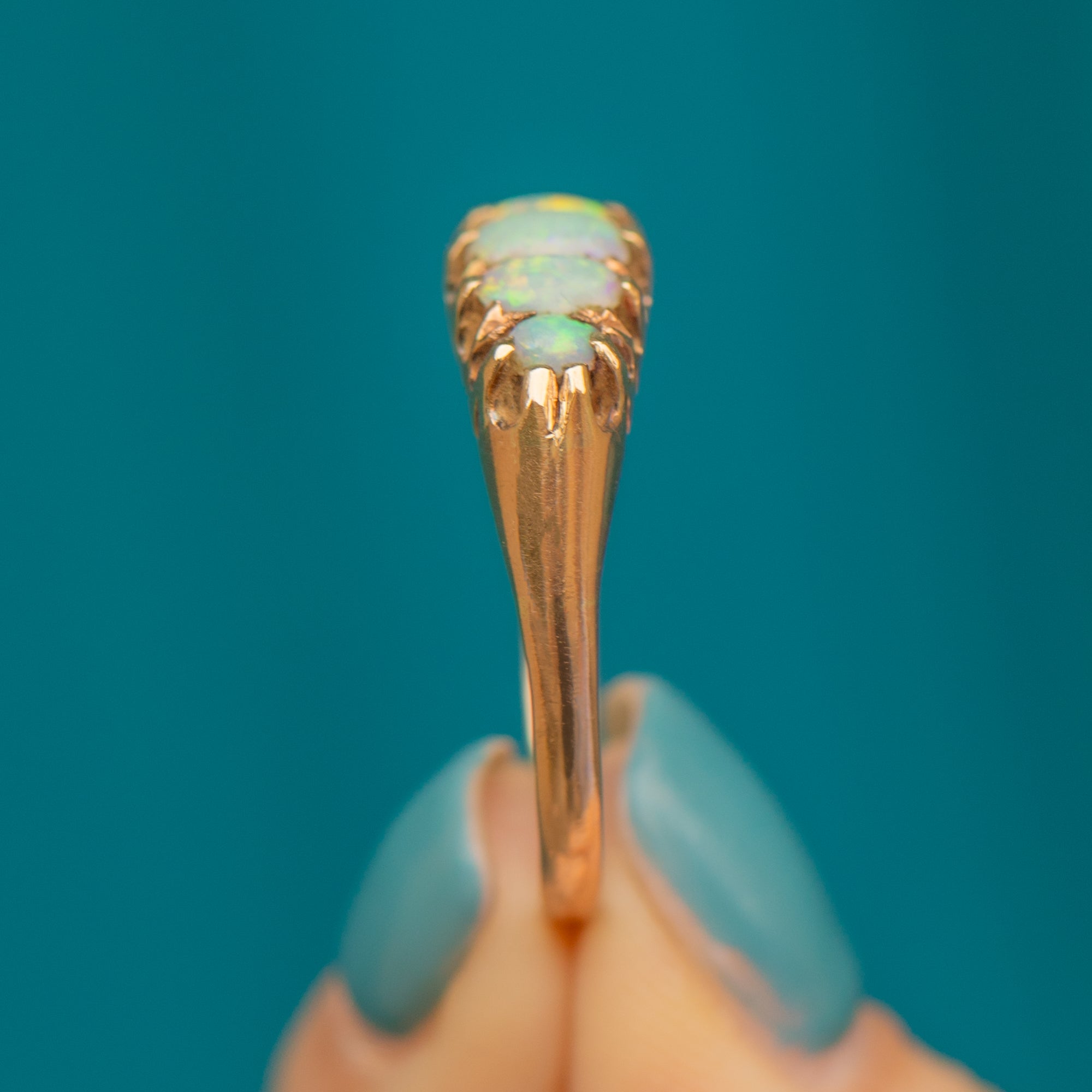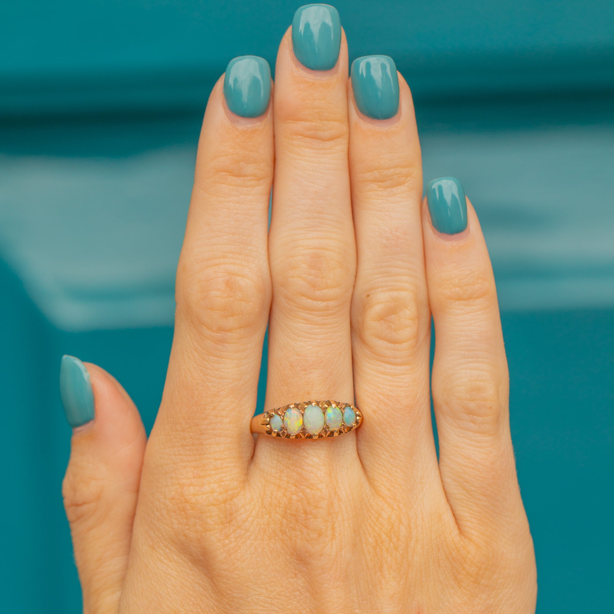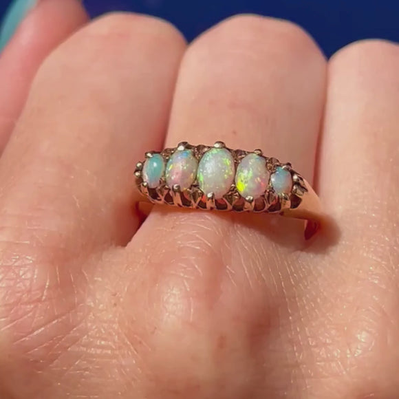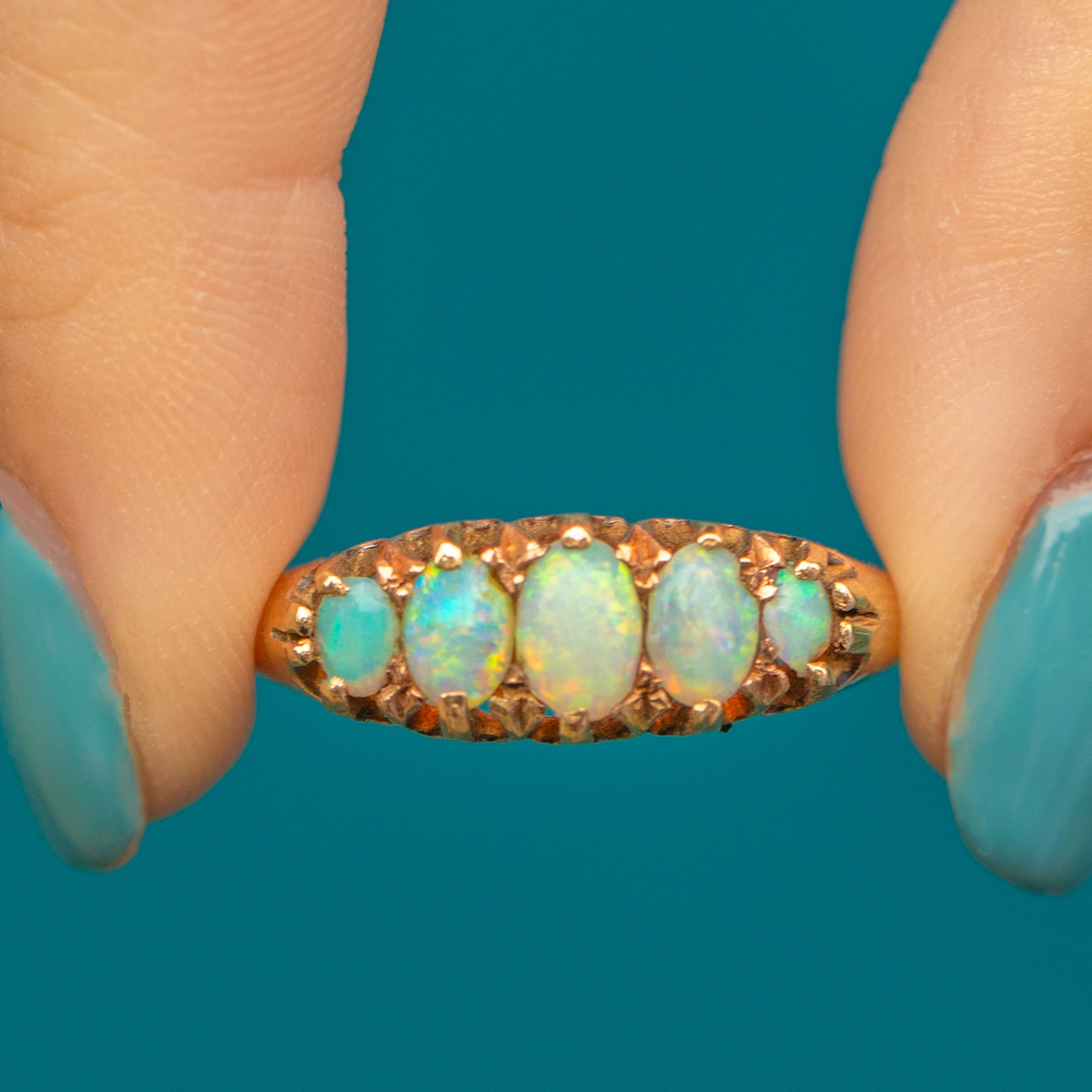 Introducing a timeless treasure, this Victorian 9ct Gold Opal Five Stone Ring, with a combined carat weight of 0.71ct will make a luxurious addition to your ring stack! The Opals boast a firework display of colours, from mesmerising blues to lush greens and vibrant oranges.