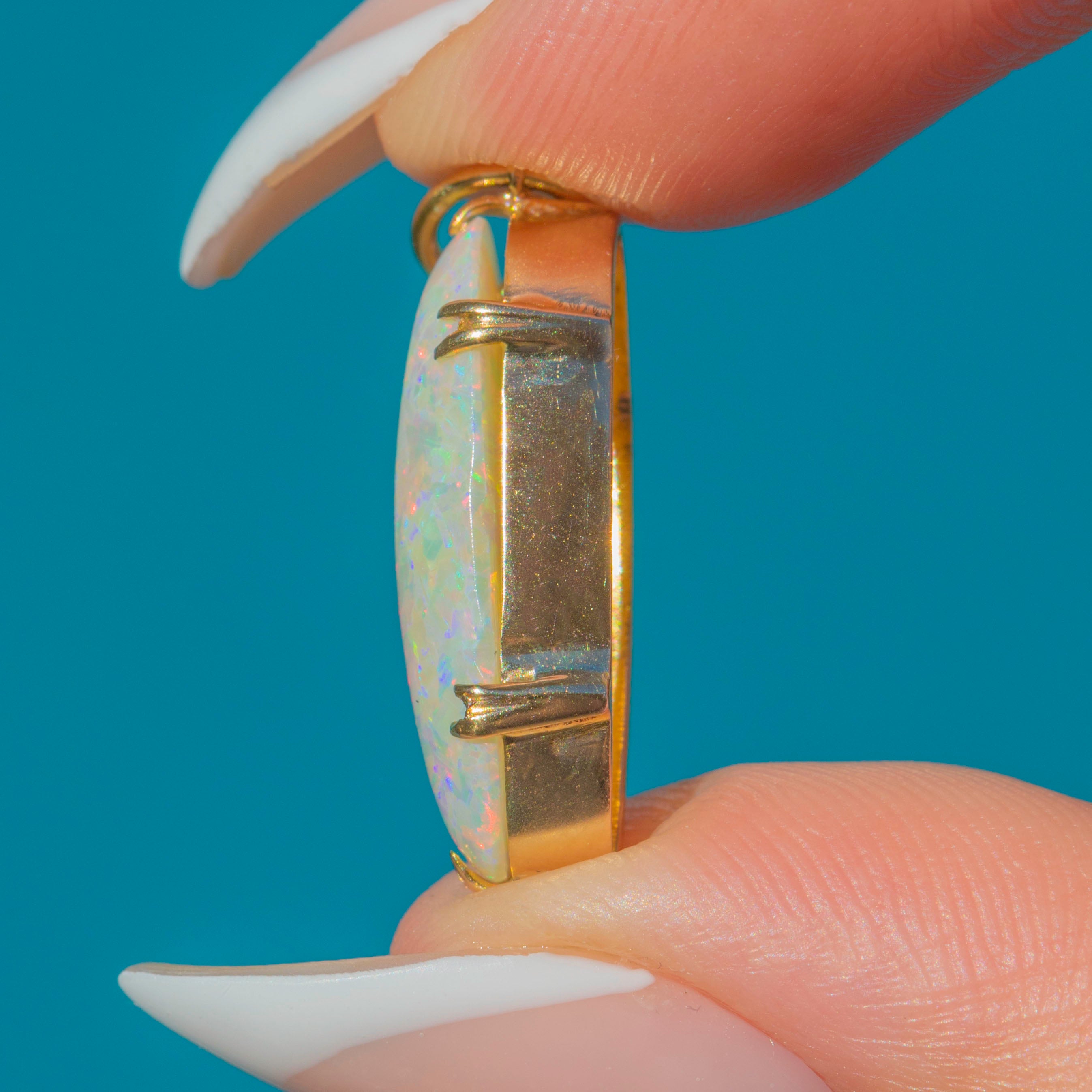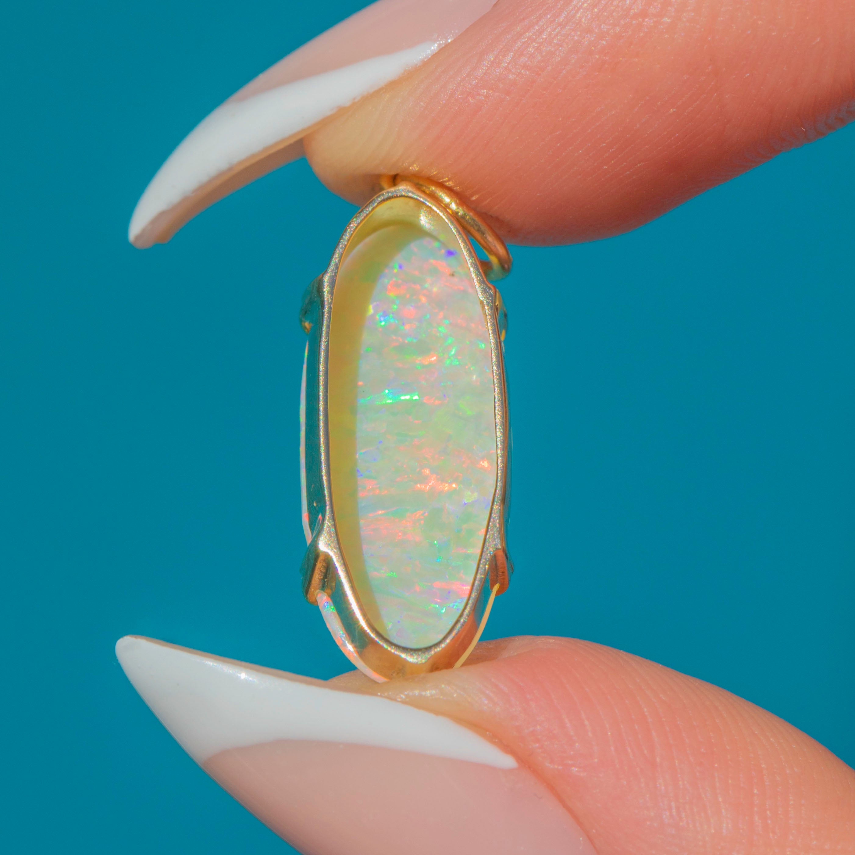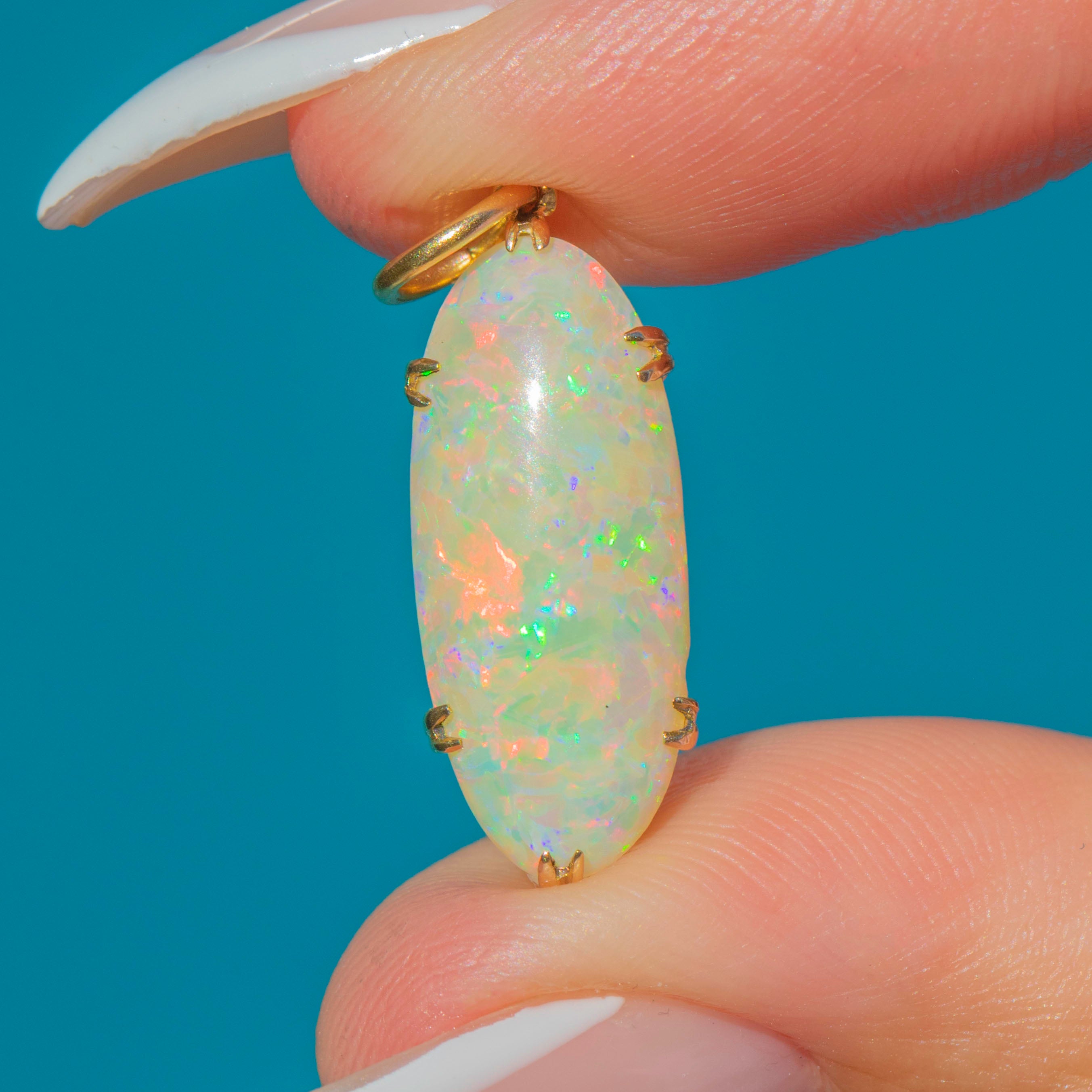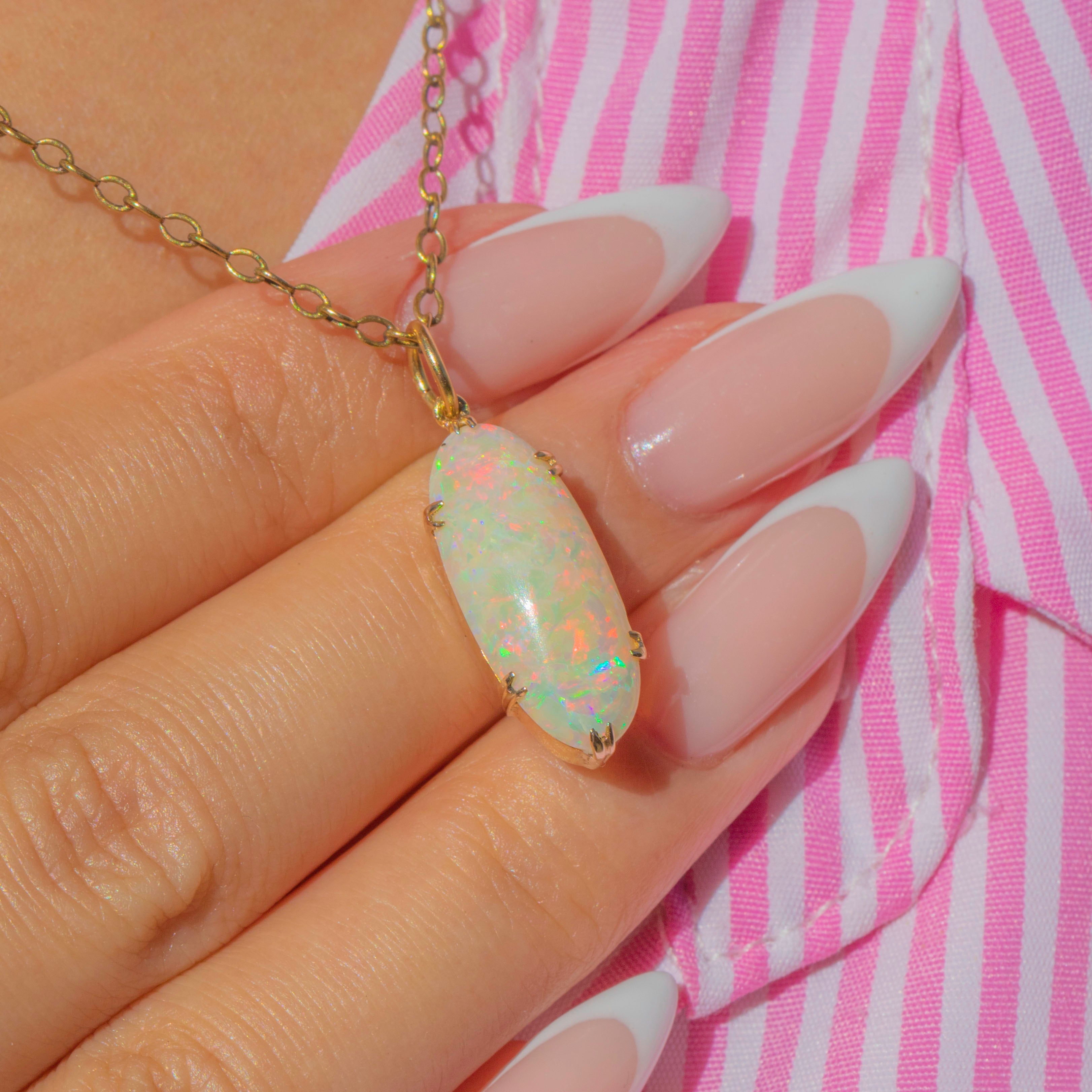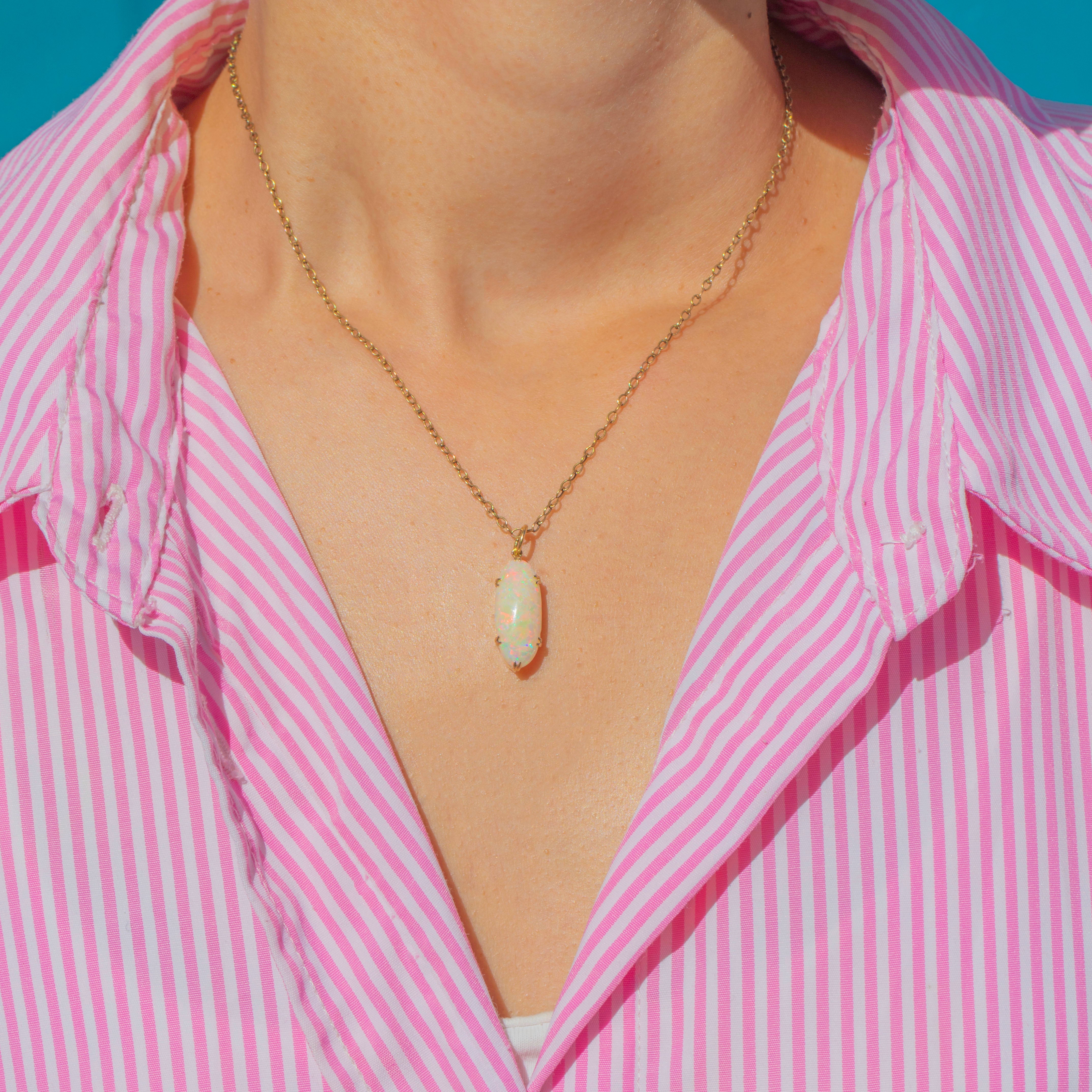 This Antique pendant features a striking oval Opal, full of colour and vibrancy. The Opal glows with an array of pastel hues, shimmering with flashes of green, pink, and blue as it catches the light.