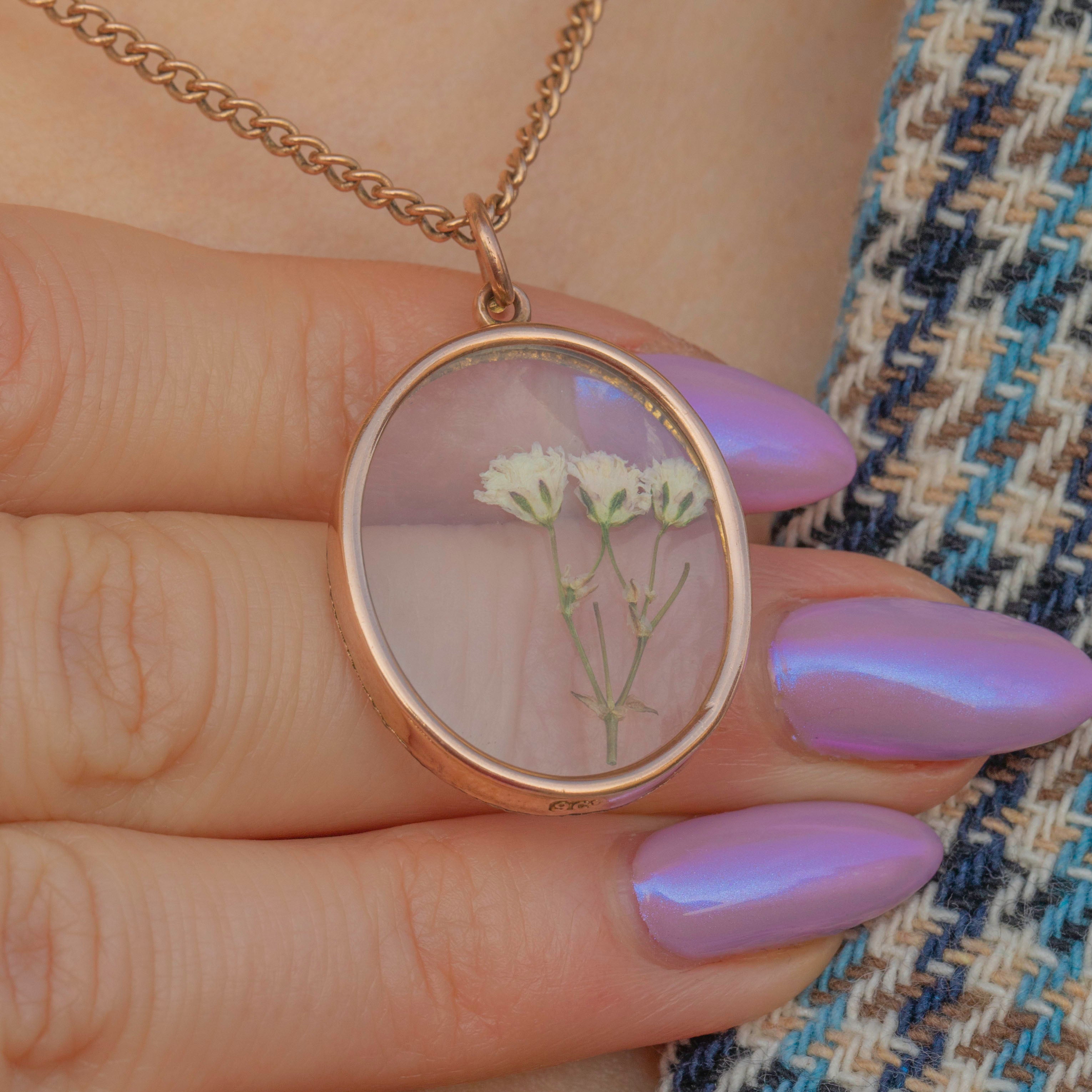 Antique 9ct Gold Oval Pressed Flower Locket, Engraved Border