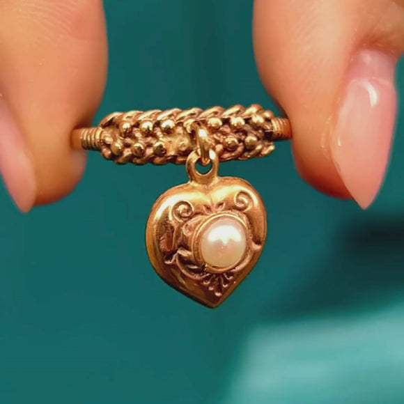 VERY GOOD. This antique 9ct Gold Pearl heart drop ring is in very good condition. The Gold is buttery throughout and the band has retained its form impeccably over the years. The heart has remained puffy and free from dings and is securely affixed to the band. The Pearl has a wonderful sheen and has retained its natural nacre. There are some subtle signs of wear to the back of the band, however this cannot be seen when worn. All in all, a superb and highly unique piece of Victorian jewellery ready to be worn and adored for many more years to come!