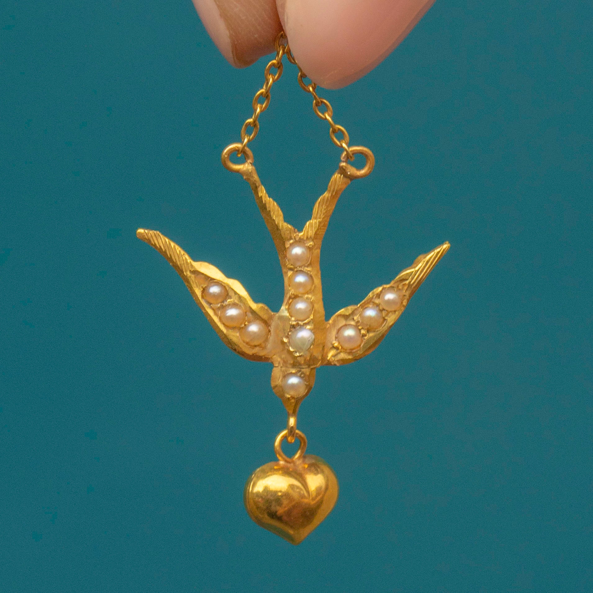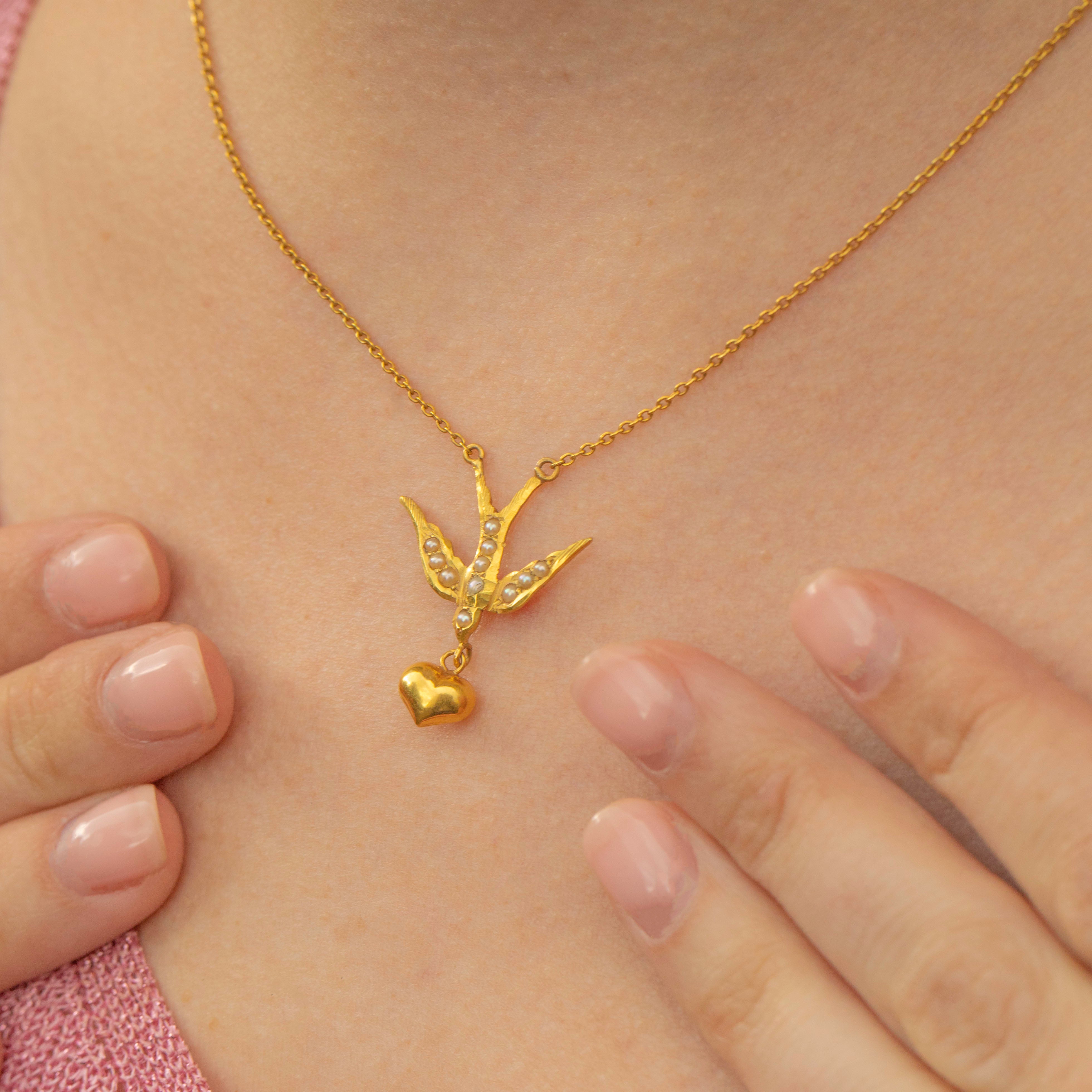 EXCELLENT This antique 9ct Gold Pearl swallow heart necklace is in excellent condition. Her swallow is perfectly formed and securely suspended from her well-preserved 9ct Gold chain. The glowing Pearls are all held securely in their settings, allowing for confident and dependable wear. You will want to take this sweeping swallow with you wherever you go!