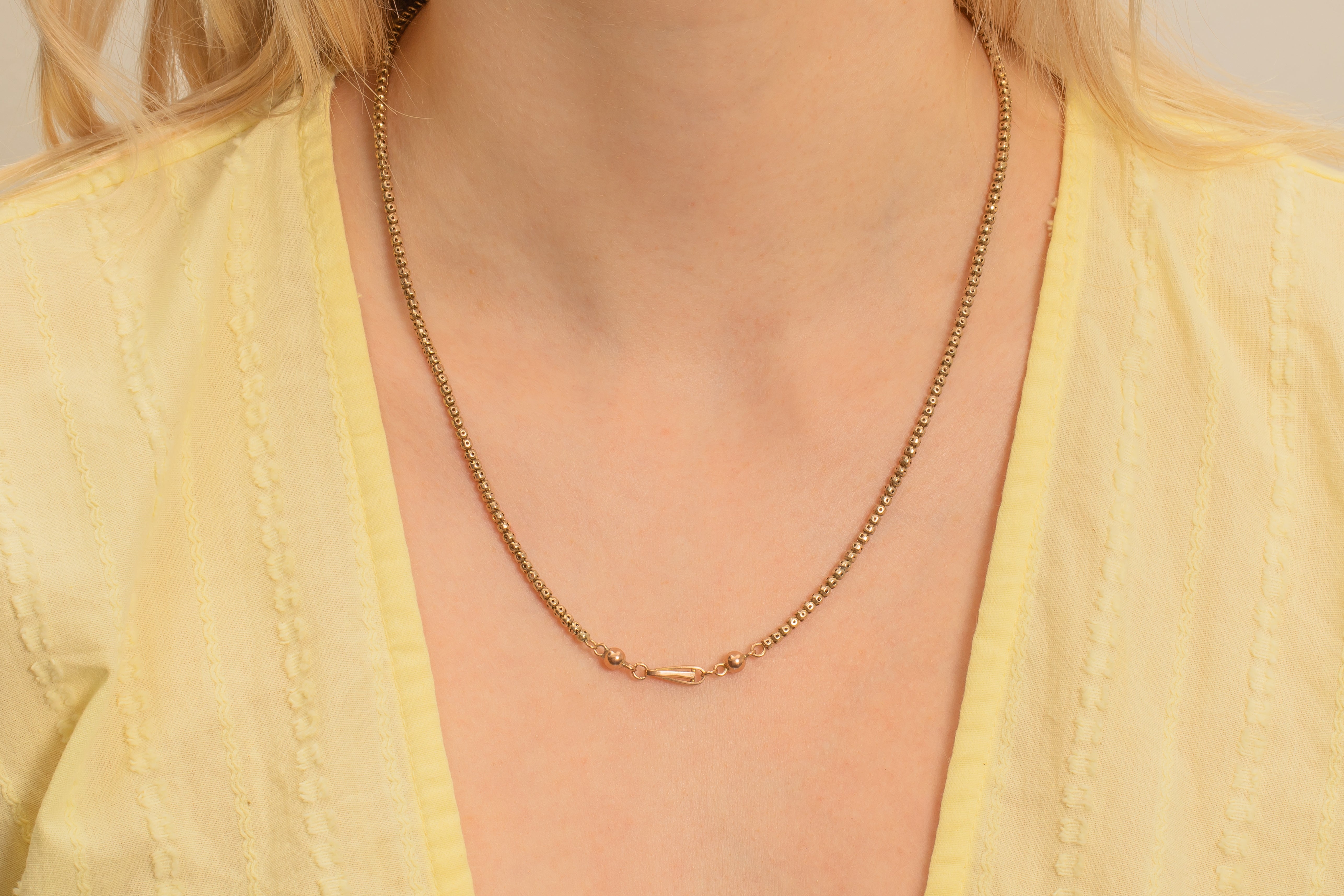 EXCELLENT. This antique 9ct Gold pierced chain is in excellent condition! Each pierced link is uniform and securely interlinked with the central ball and fetter detailing firmly affixed to the chain. The bolt ring is in perfect working condition so you can wear this piece with pride and confidence.