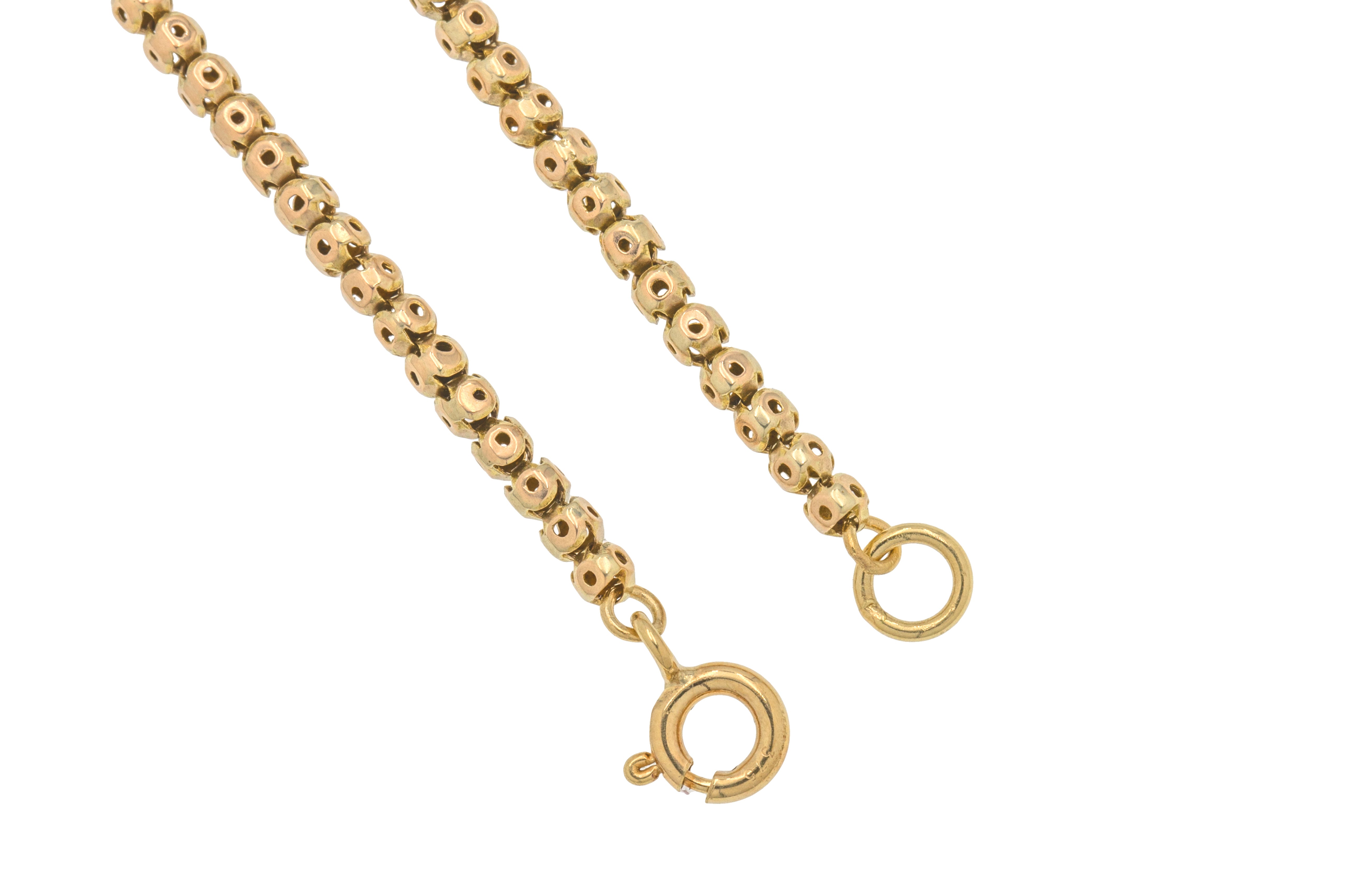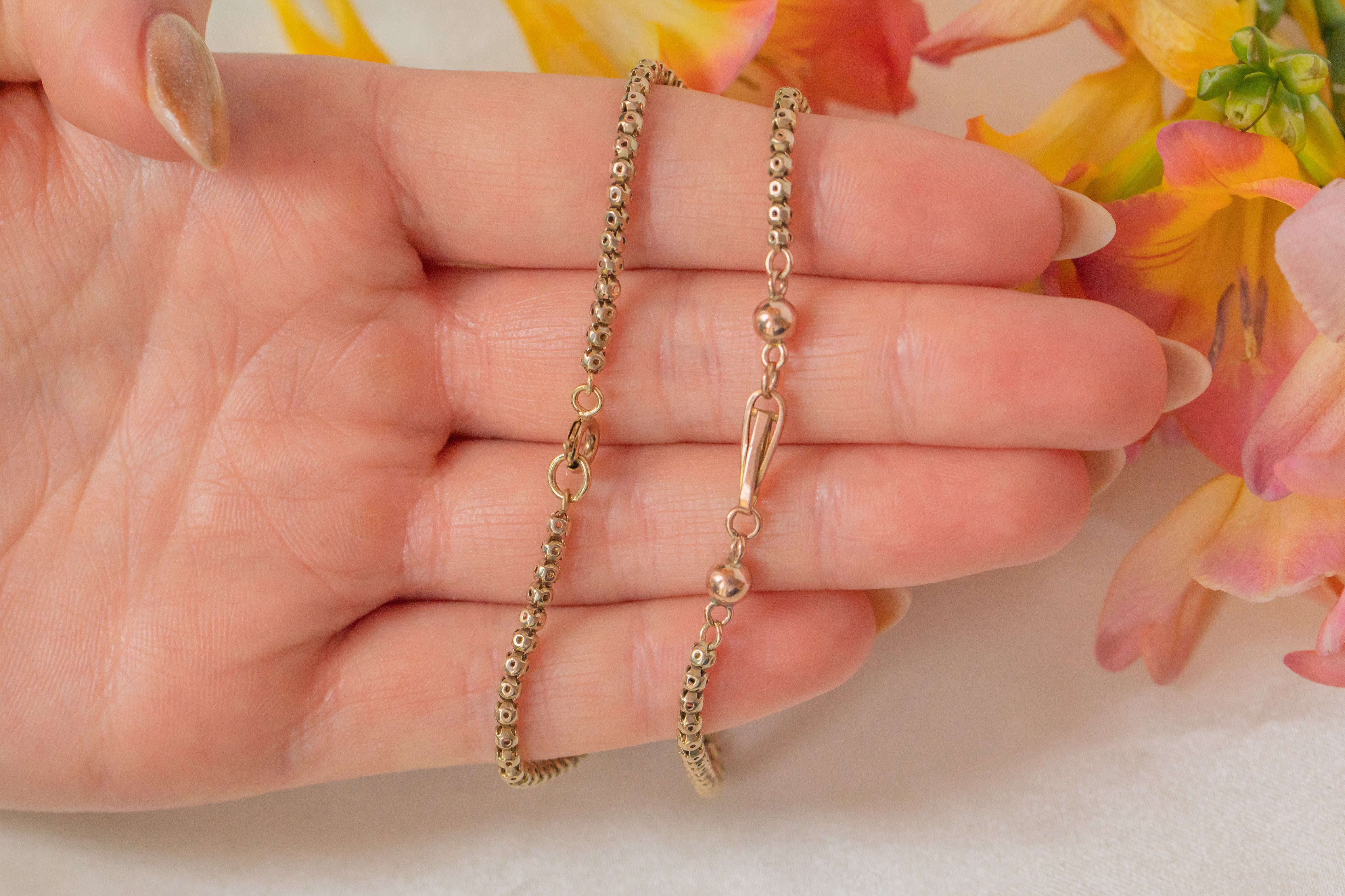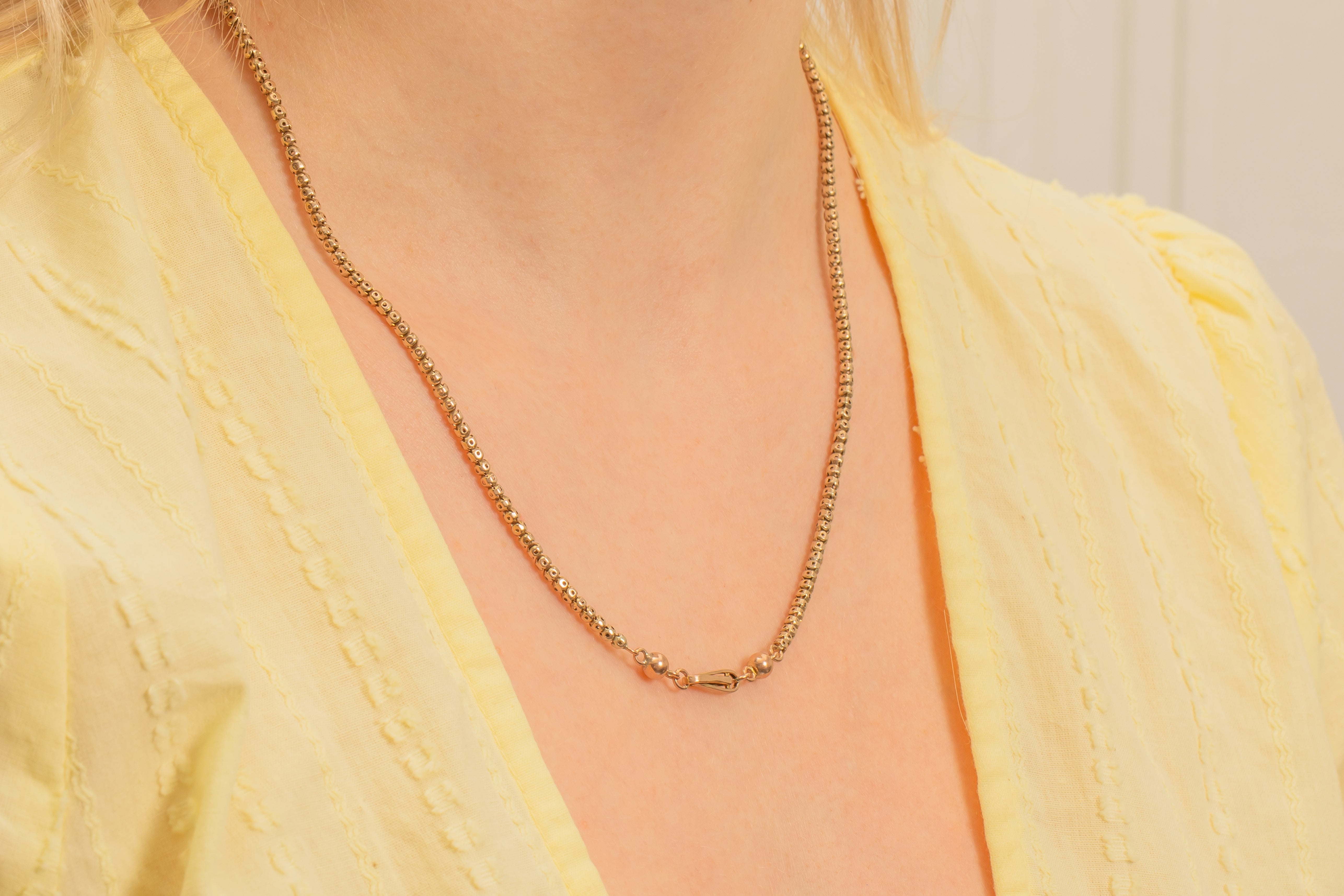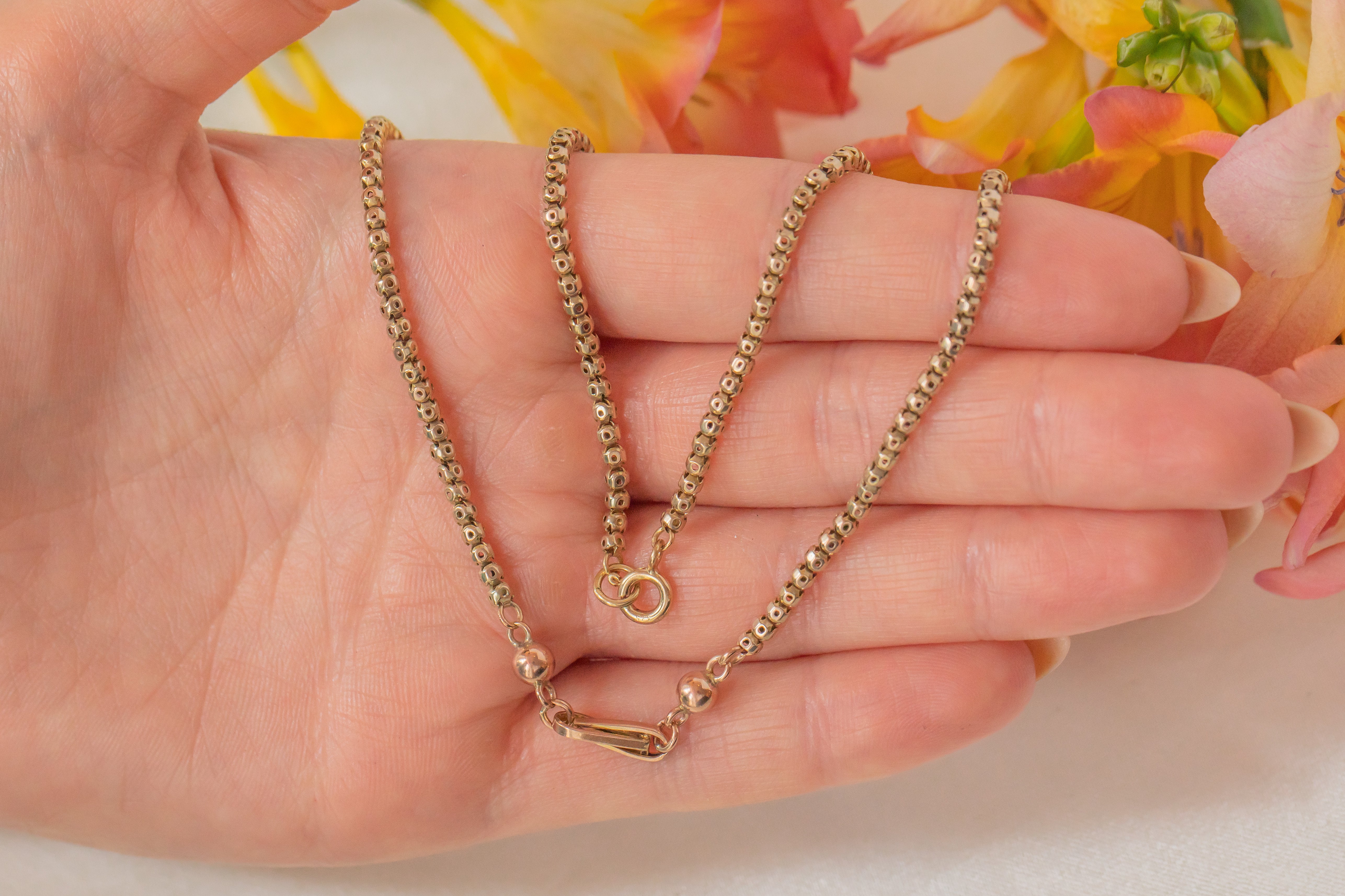 This antique 9ct Gold pierced chain, complete with charming ball and fetter details, is one you don't want to miss! Composed of honey-hued 9ct Gold, each rounded box link is pierced to perfection.