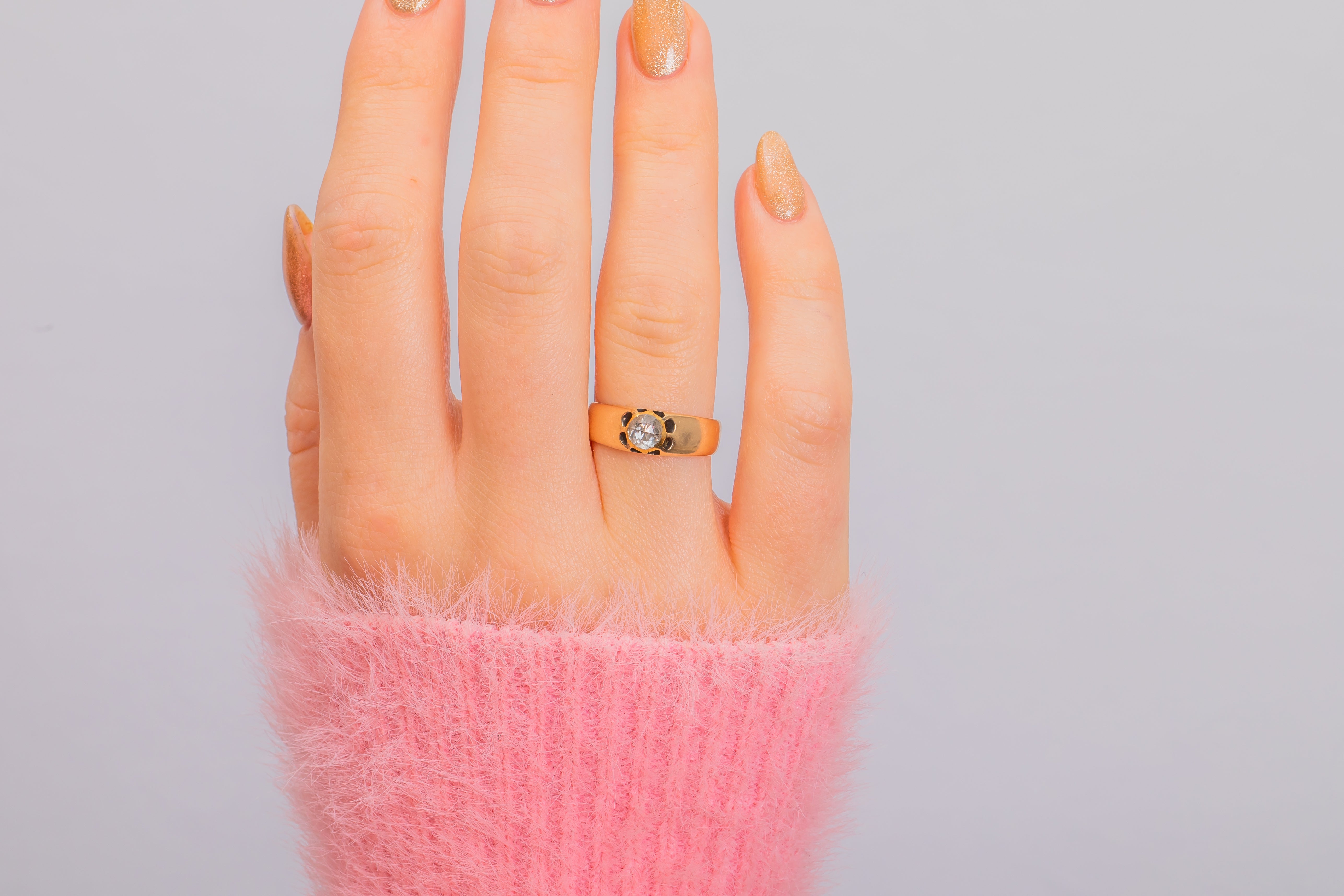 The chunky 9ct Gold band is glossy throughout, possessing a lovely maple hue and pretty settings. A wonderful size, she is slender enough to wear alongside your other favourite rings or as a stand alone piece!