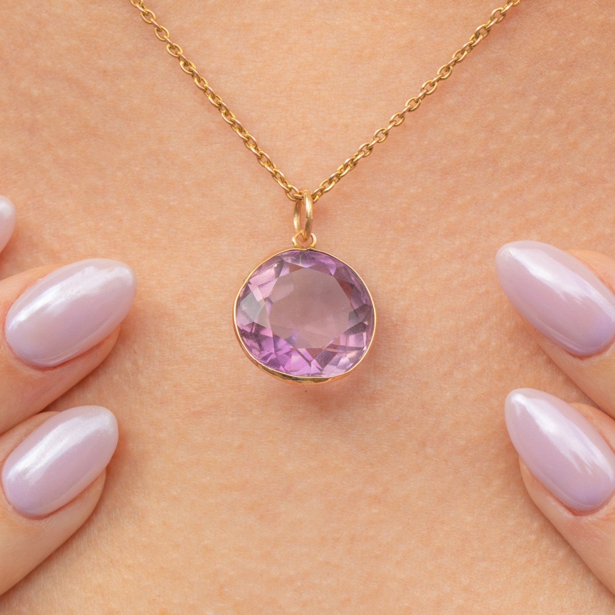 VERY GOOD. This antique 9ct Gold Rose De France Amethyst pendant is in very good condition. The Amethyst has a gorgeous lavender hue, and while she does have a few minor scuffs, it is not evident during wear. She also has a small inclusion, adding to her unique charm. The bezel is smooth and holds the Amethyst securely, fitted with a sturdy jump ring that suspends the pendant elegantly.