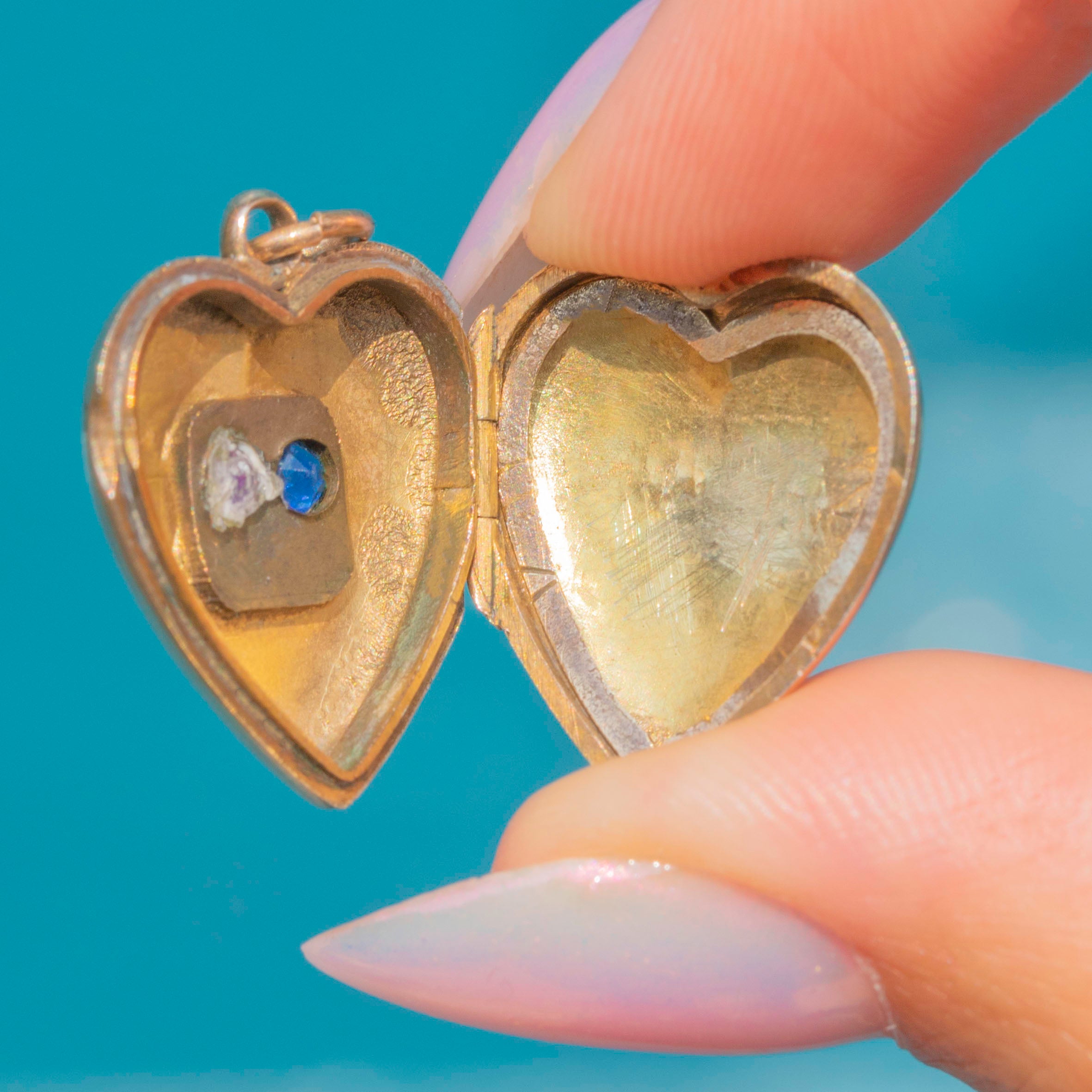 This antique 9ct Gold Ruby Pearl heart locket will capture your affections! Featuring a pretty Seed Pearl, scarlet Ruby and midnight blue Sapphire Paste inlaid into an ivy leaf engraving, this antique locket encapsulates the romantic essence of Victorian designs.