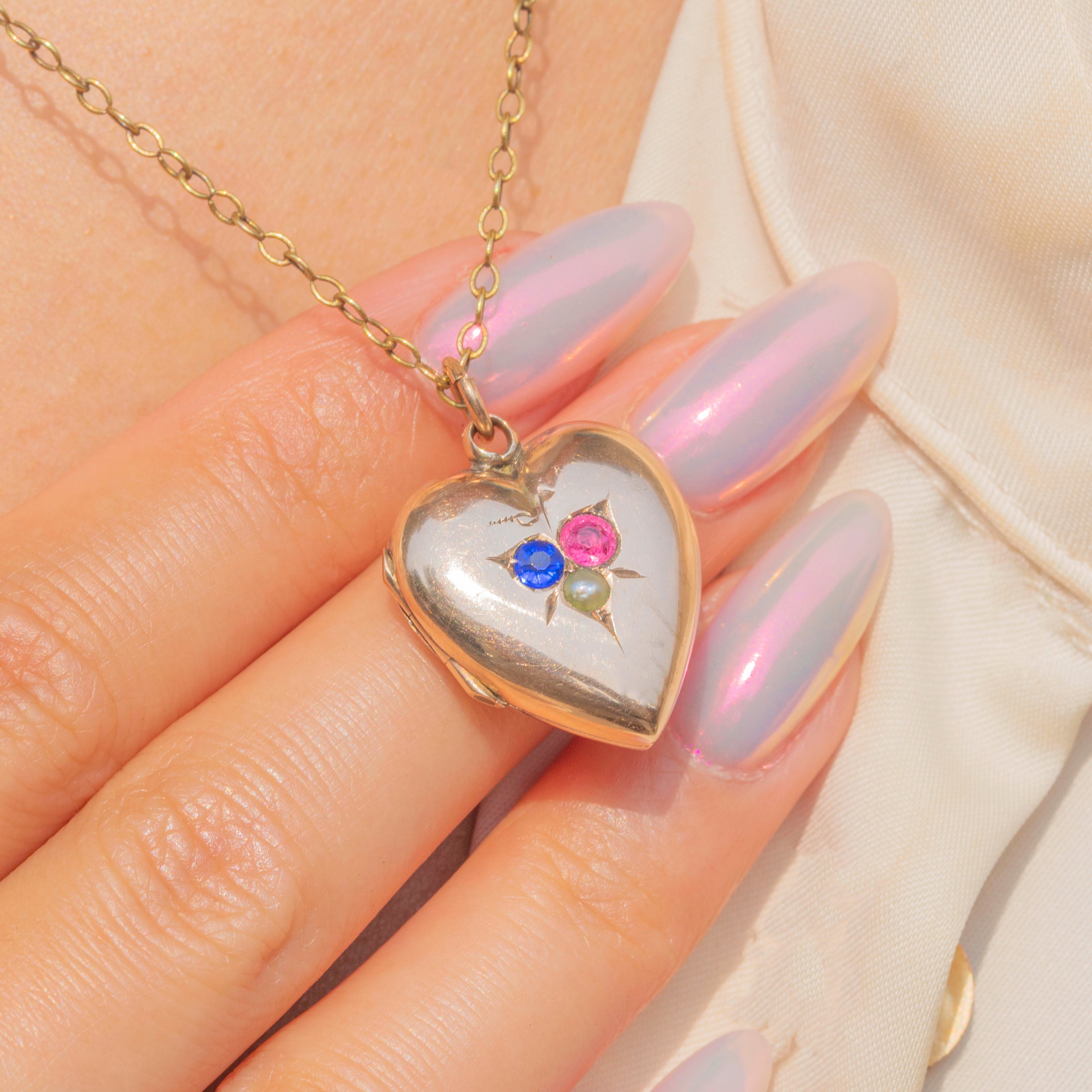 VERY GOOD: This antique 9ct Gold Ruby Pearl heart locket is in fabulous condition throughout. The 9ct Gold has accrued a delightful Gold sheen from age with the most minor wear commensurate with age. All of the gemstones are secure in their settings, and while there is some wear to them, they still sparkle beautifully!