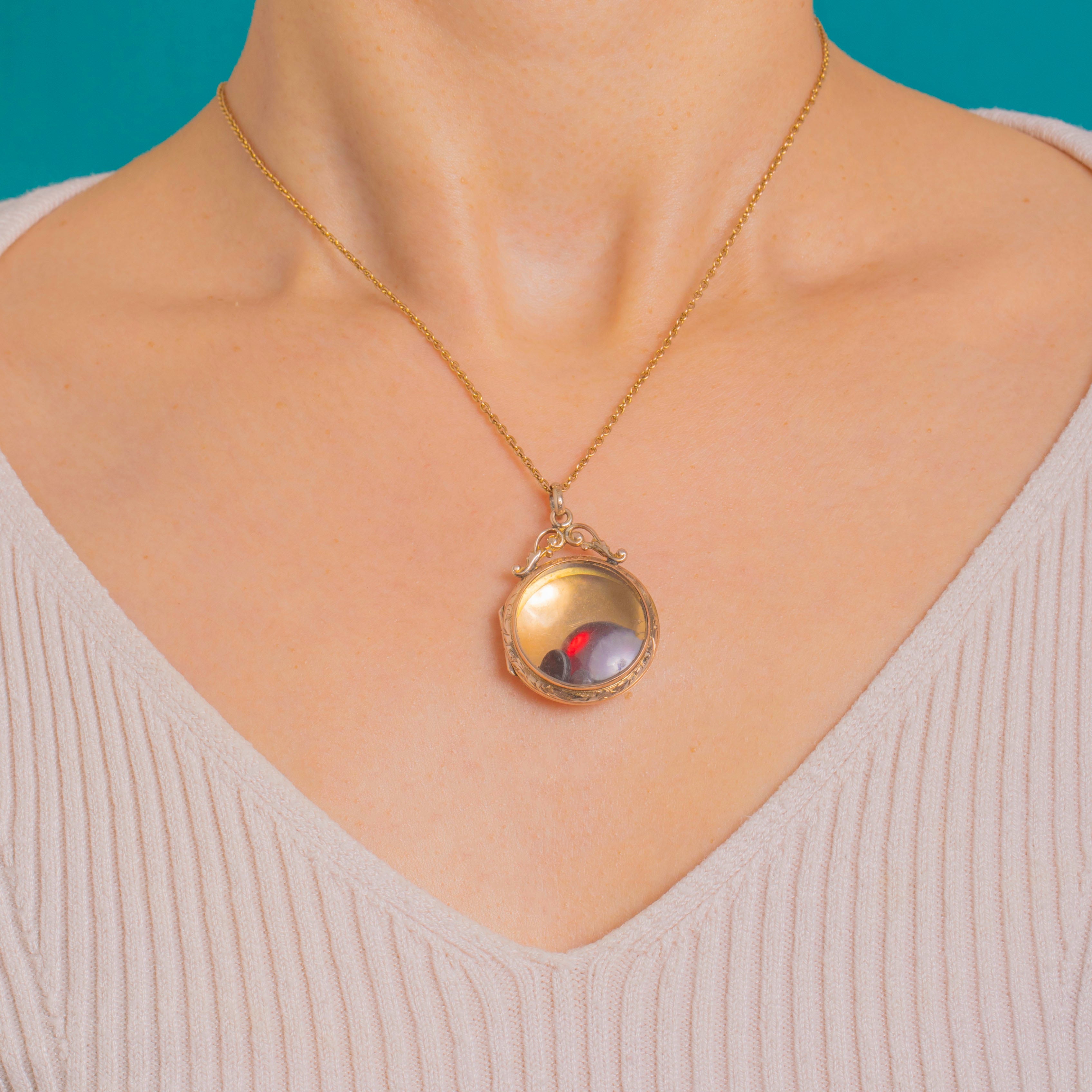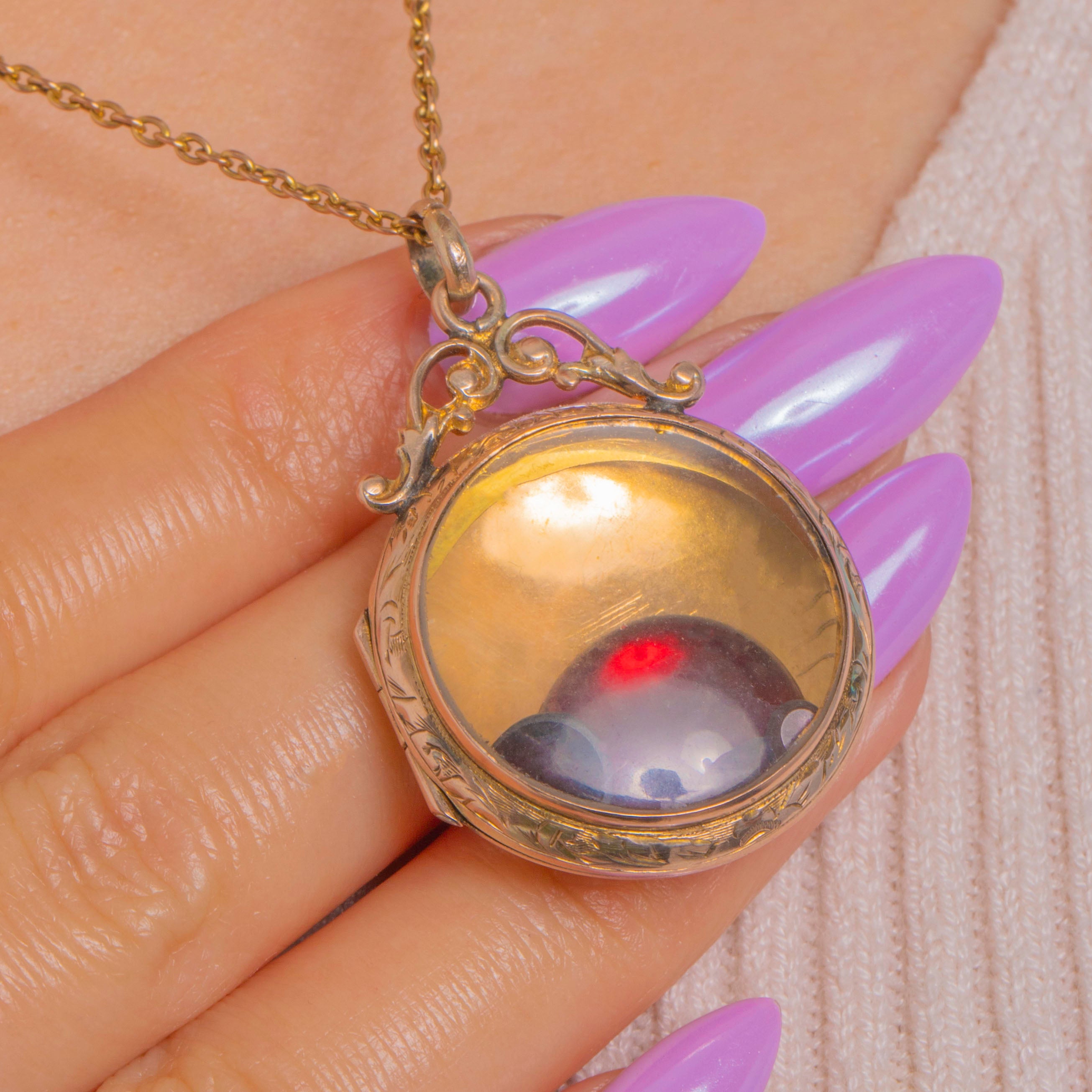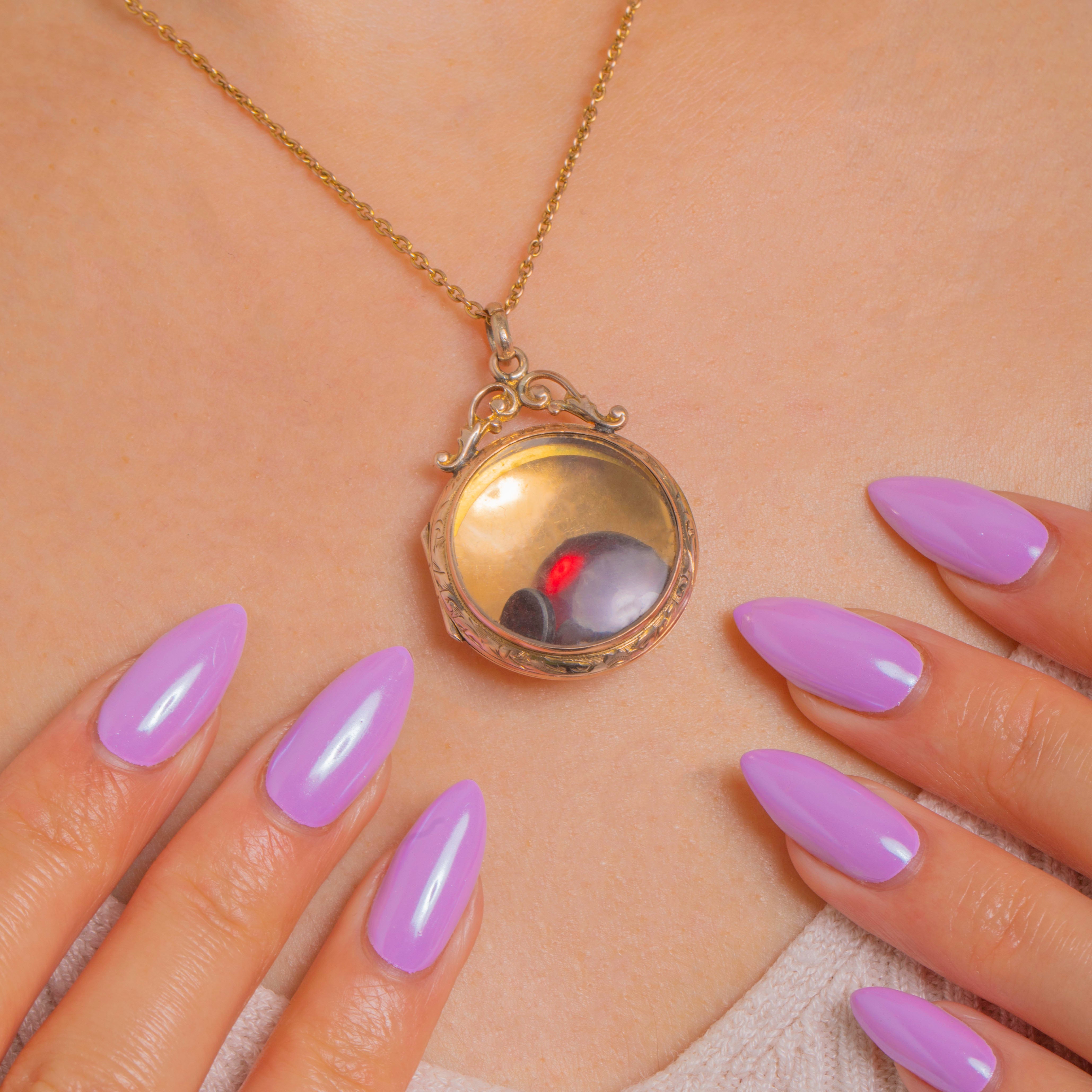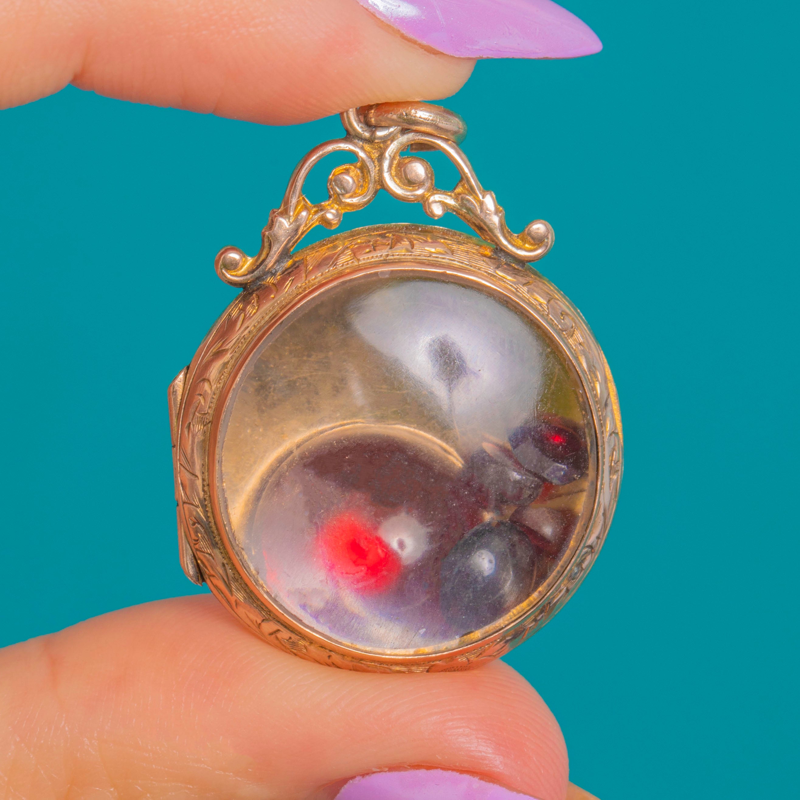 This Victorian shaker locket in 9ct Gold is an enchanting keepsake, showcasing a clear domed glass front within an engraved foliate bezel and an ornate scroll bail. Romantic and refined, the loose Garnet cabochons dance within the chamber, catching the light with every movement for a playful yet elegant sparkle.