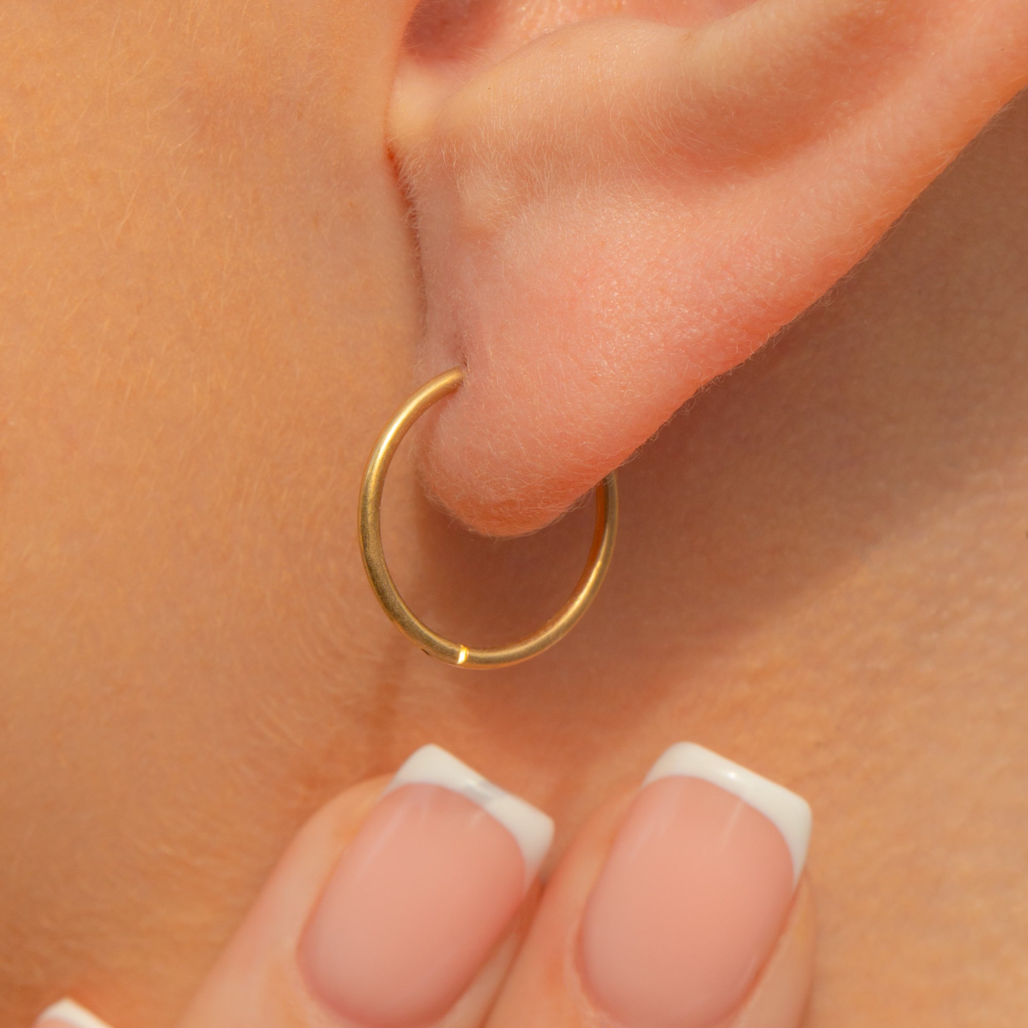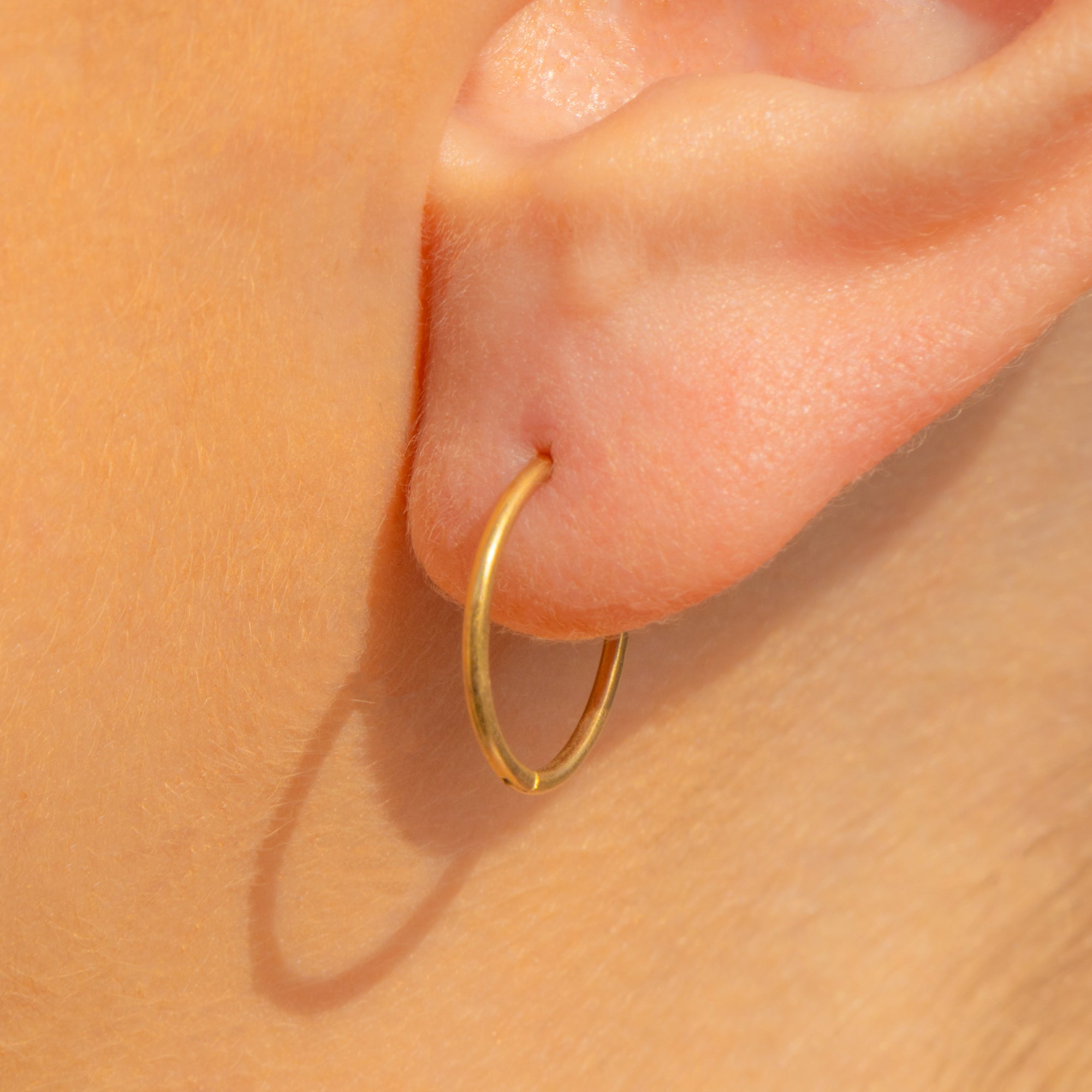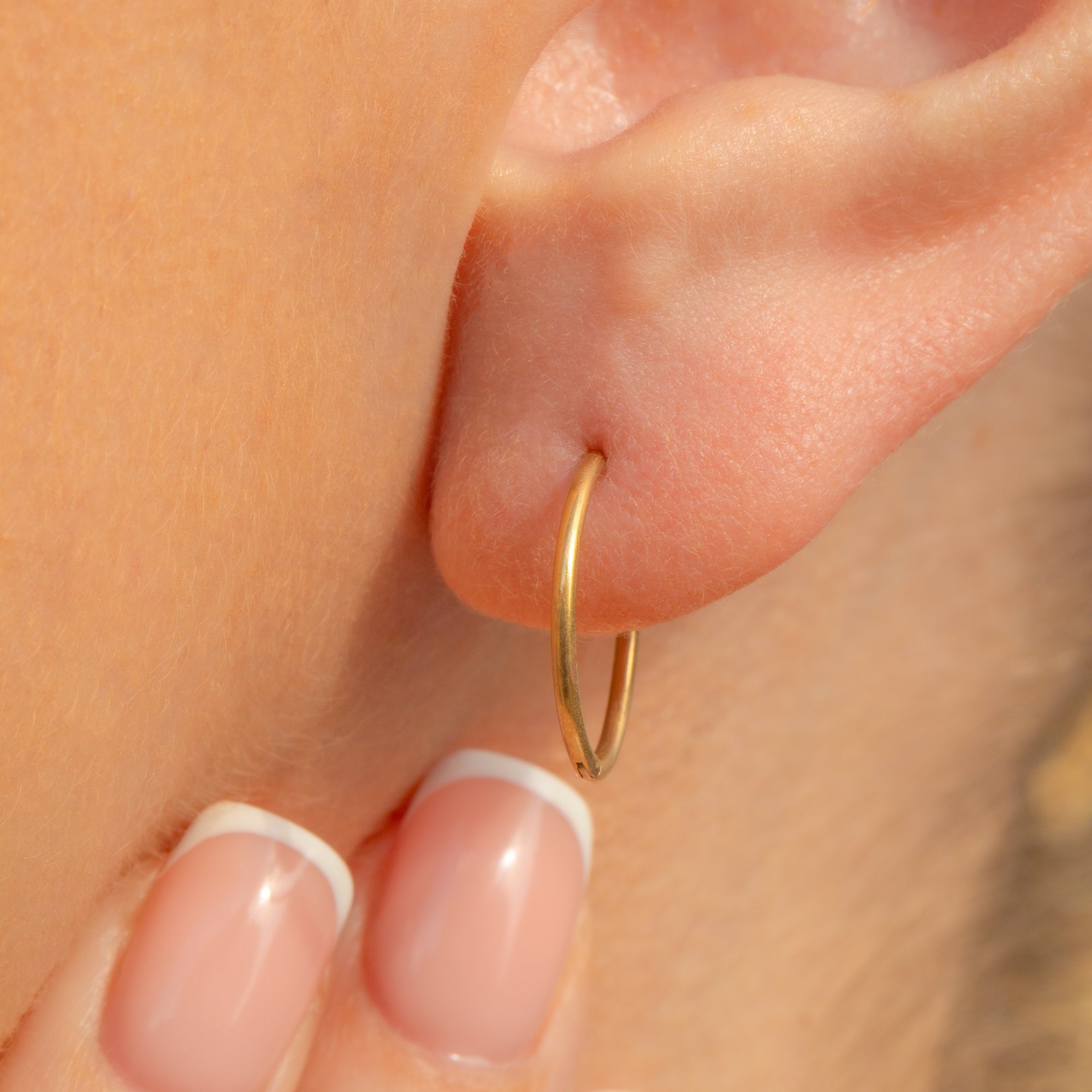 VERY GOOD-EXCELLENT. We are pleased to present these antique 9ct Gold sleeper hoops in very good to excellent condition! They have a glossy Gold hue throughout and have retained a perfectly round shape. One of the '9ct' stamps has obscured but the other is still legible and we can confirm they both test as 9ct Gold. Due to their delicate design they need to be handled with care but once in the ear they lock in to place securely. There timeless beauty makes them the ultimate addition to your antique jewellery collection!