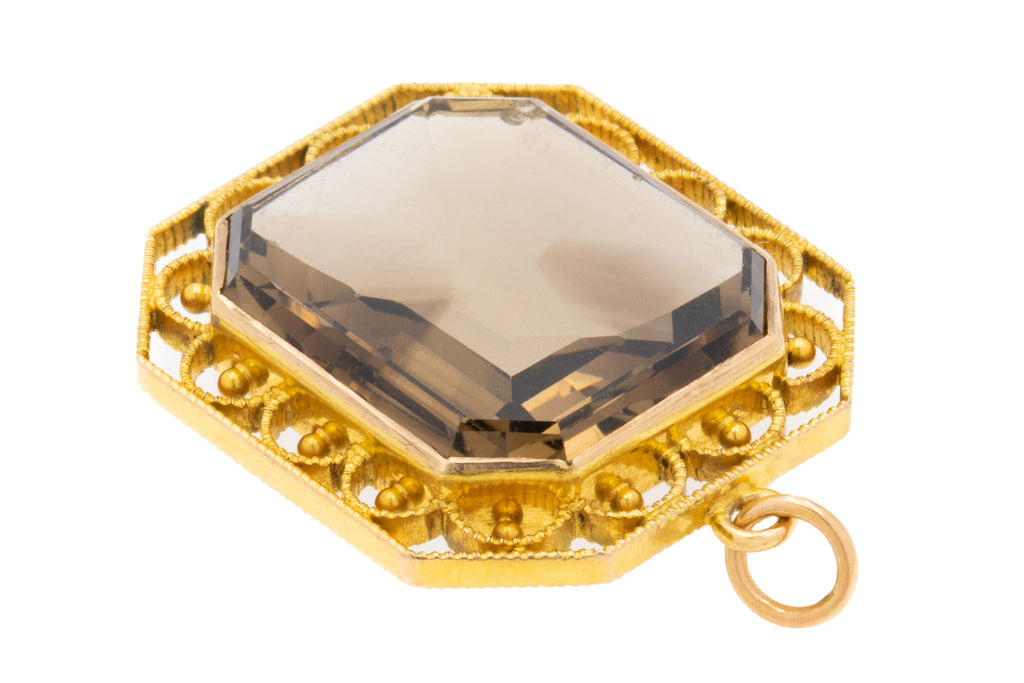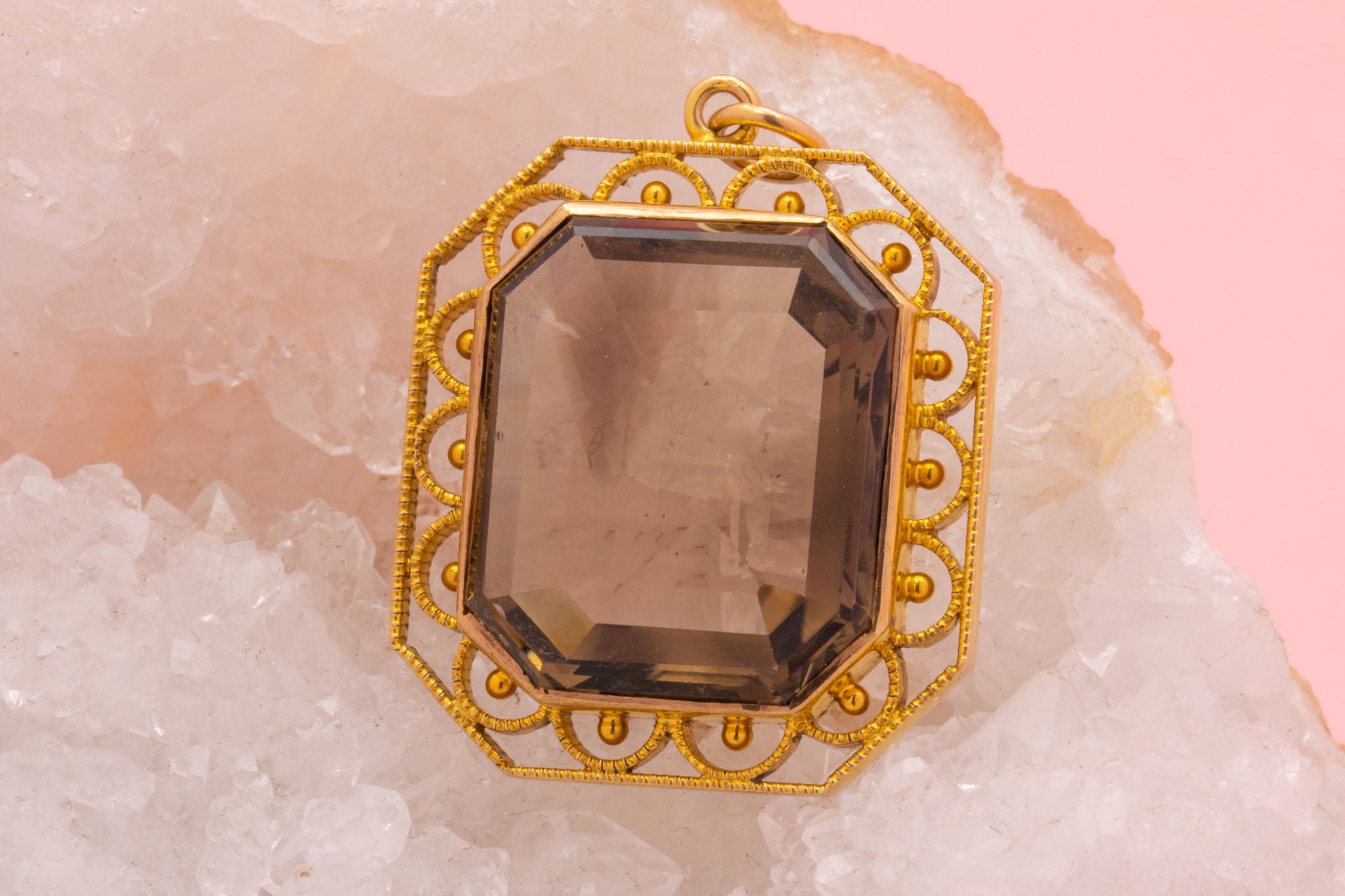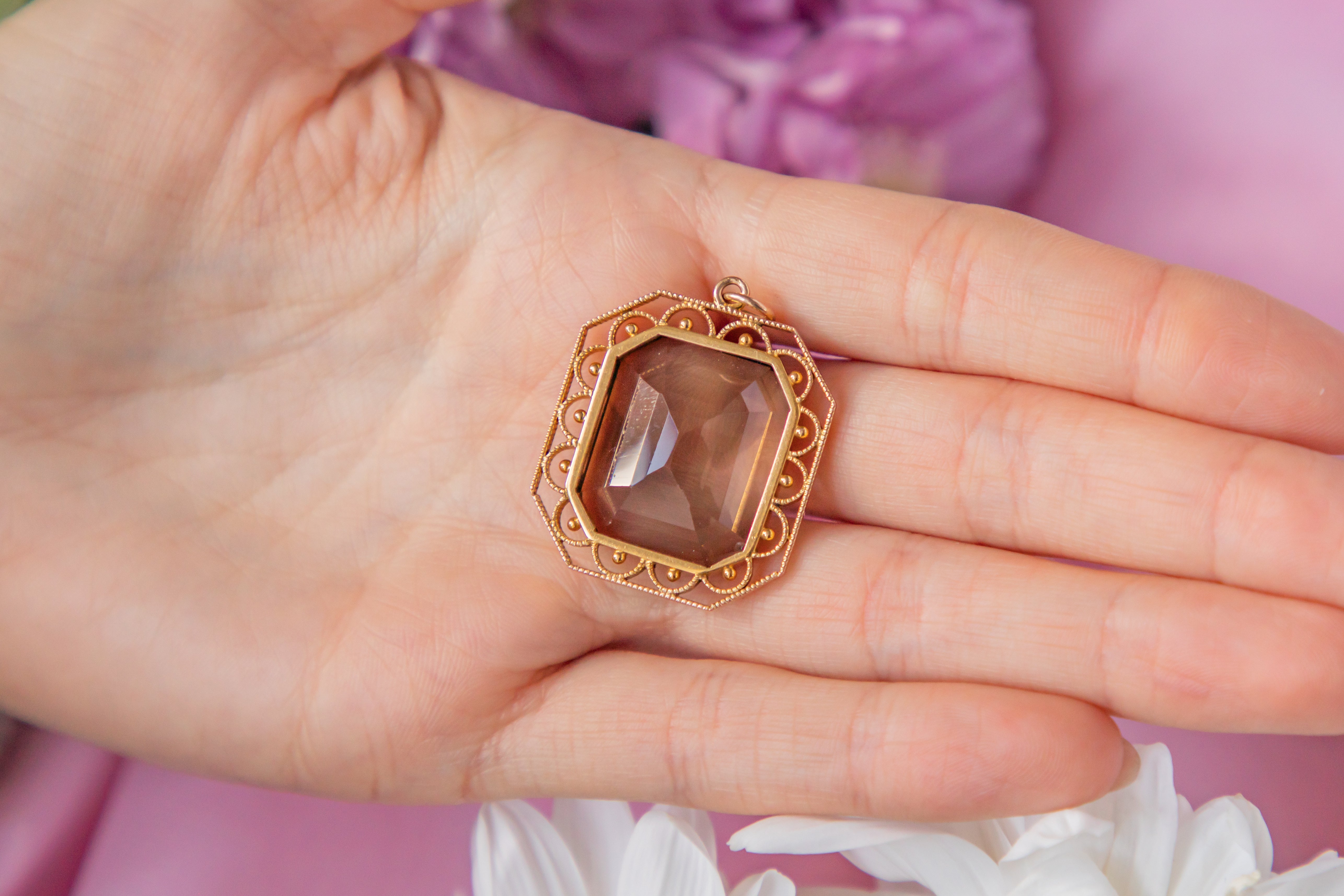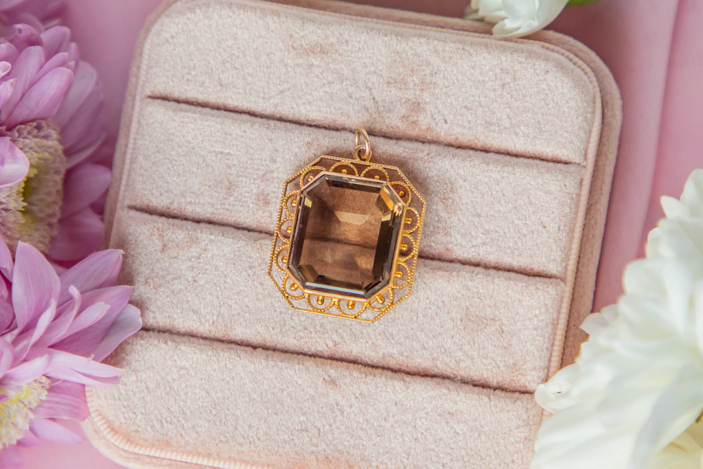 This antique 9ct Gold Smoky Quartz pendant is a work of art! We adore how the autumnal hues of her Smoky Quartz beautifully compliment her rich 9ct Gold. Encased in an ornate filigree border, complete with studded detailing, she's truly charming.