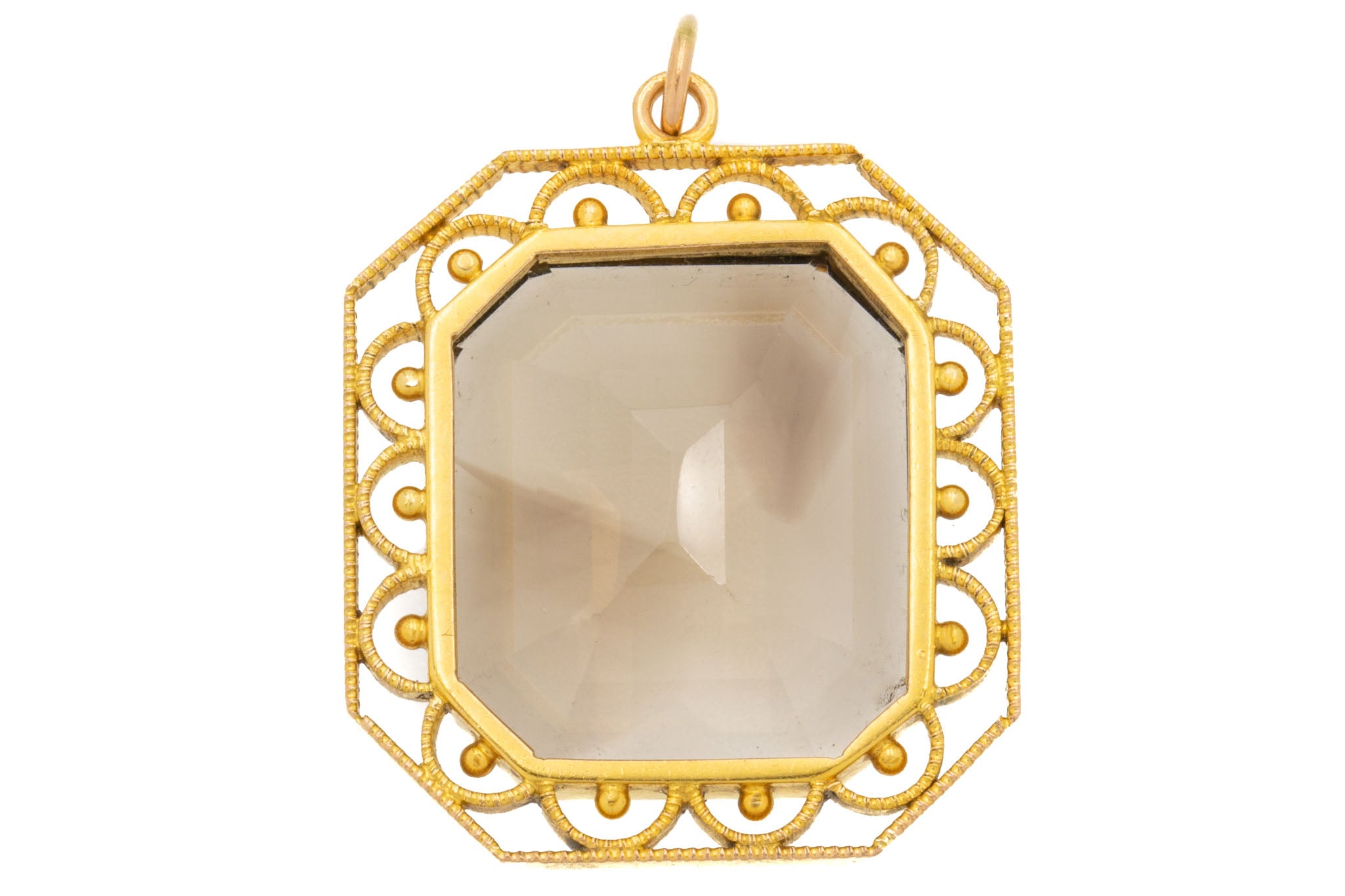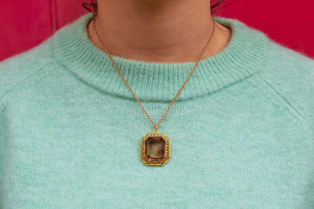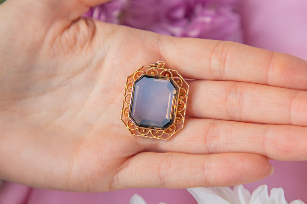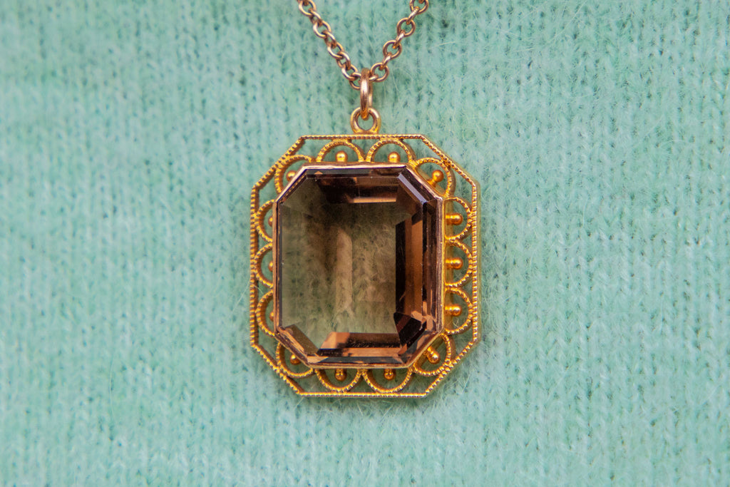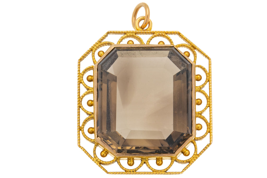 This antique 9ct Gold Smoky Quartz pendant is a work of art! We adore how the autumnal hues of her Smoky Quartz beautifully compliment her rich 9ct Gold. Encased in an ornate filigree border, complete with studded detailing, she's truly charming.