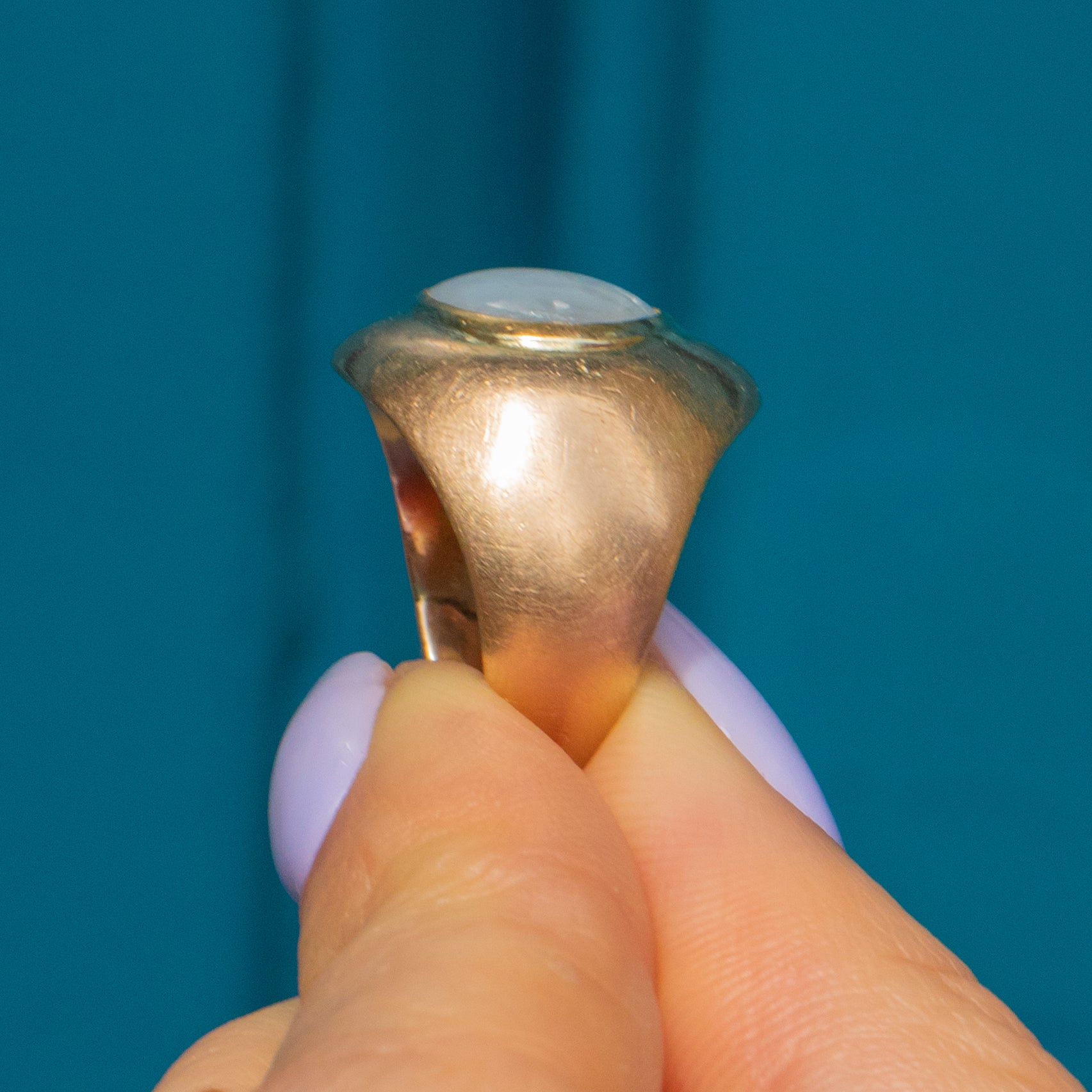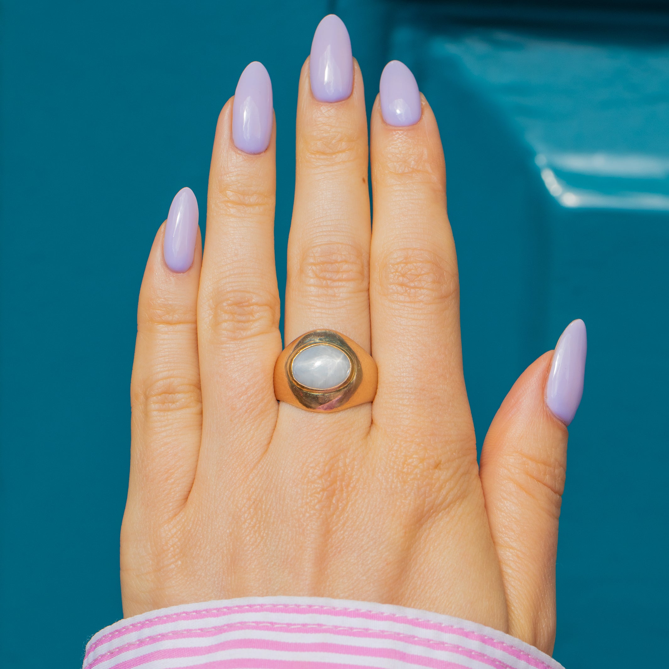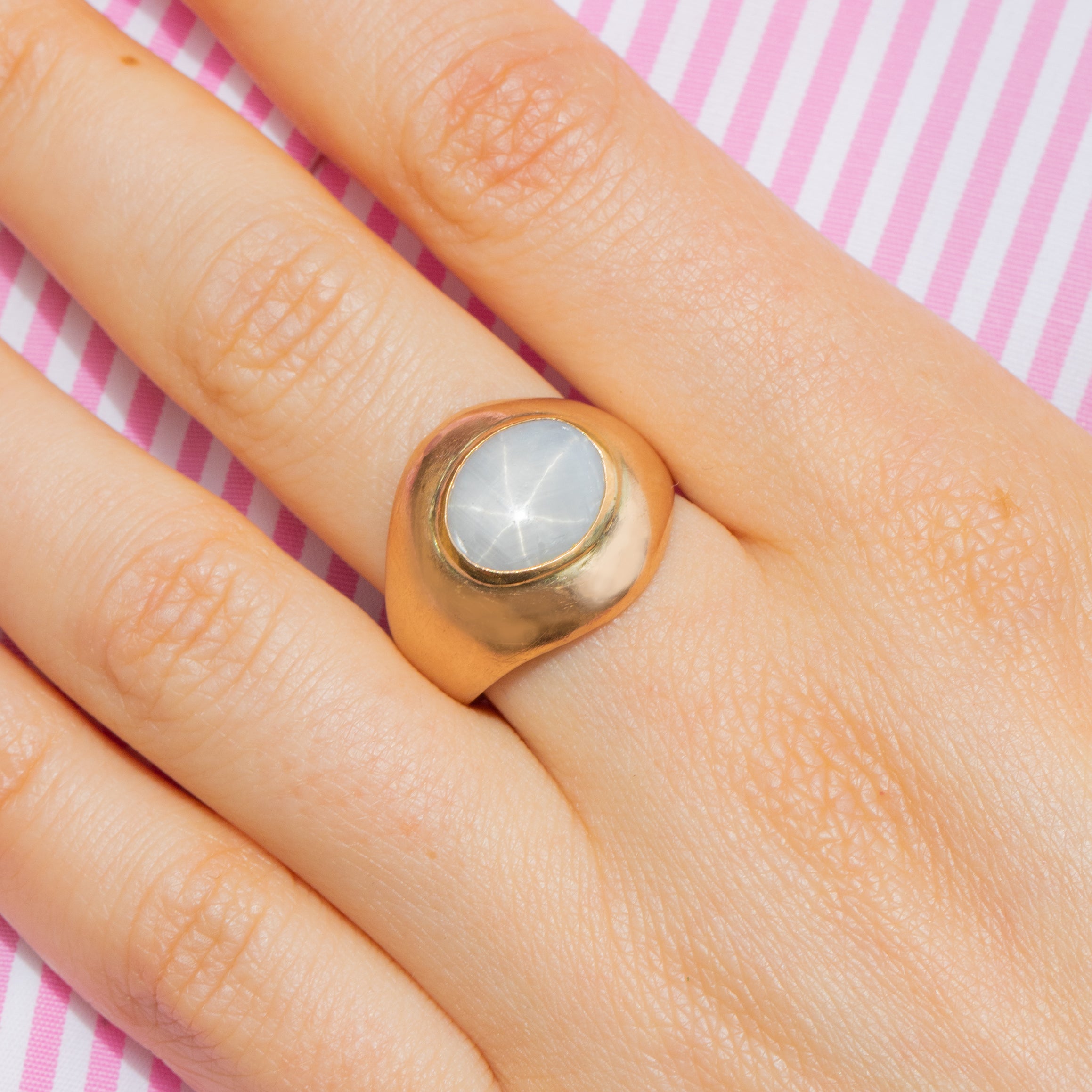 What a spectacular piece this chunky antique 9ct Gold star Sapphire signet ring is! With a 3.75ct galactic cabochon star Sapphire, the impressive ring face possesses a pool of pastel tones and a strong star running across her surface beneath the light!