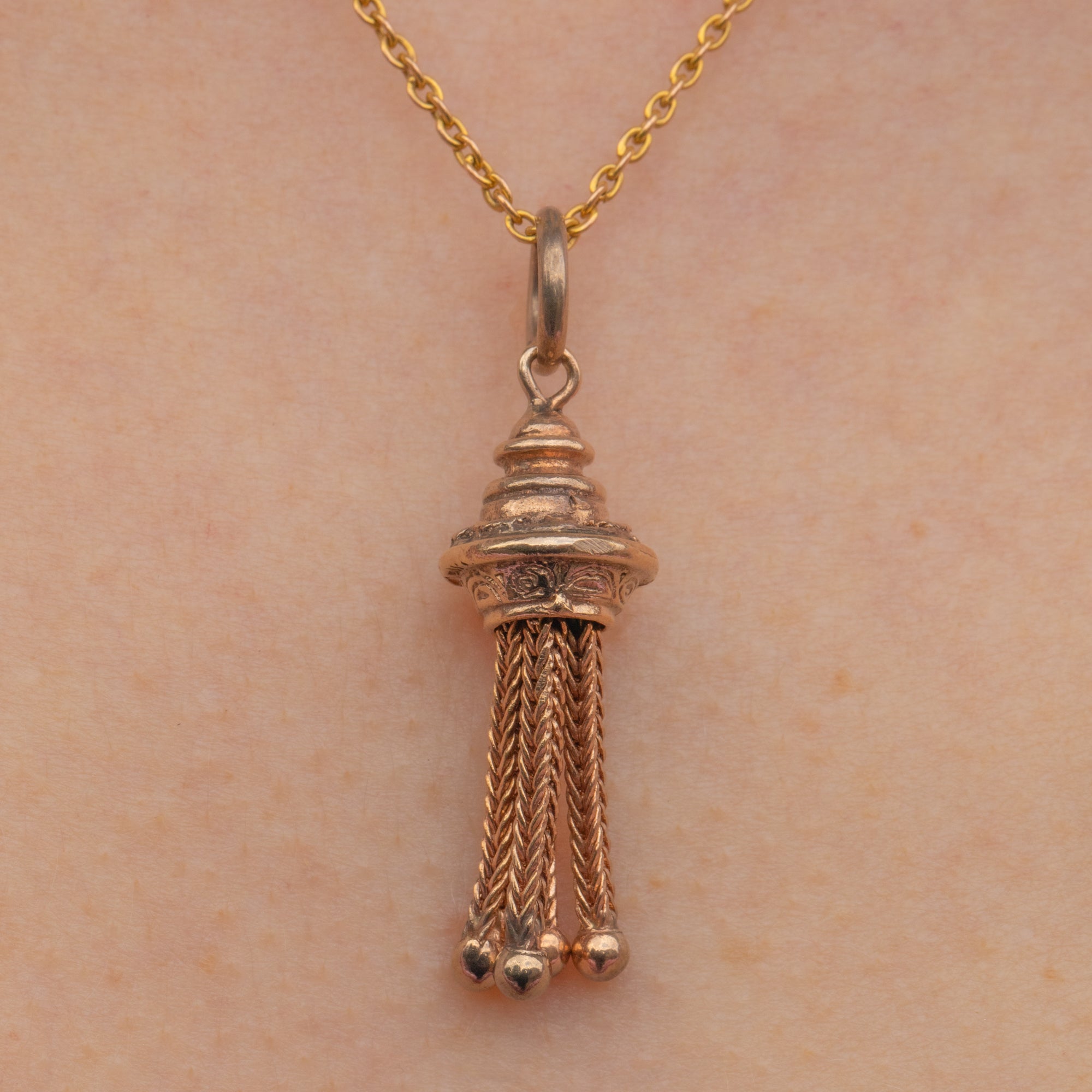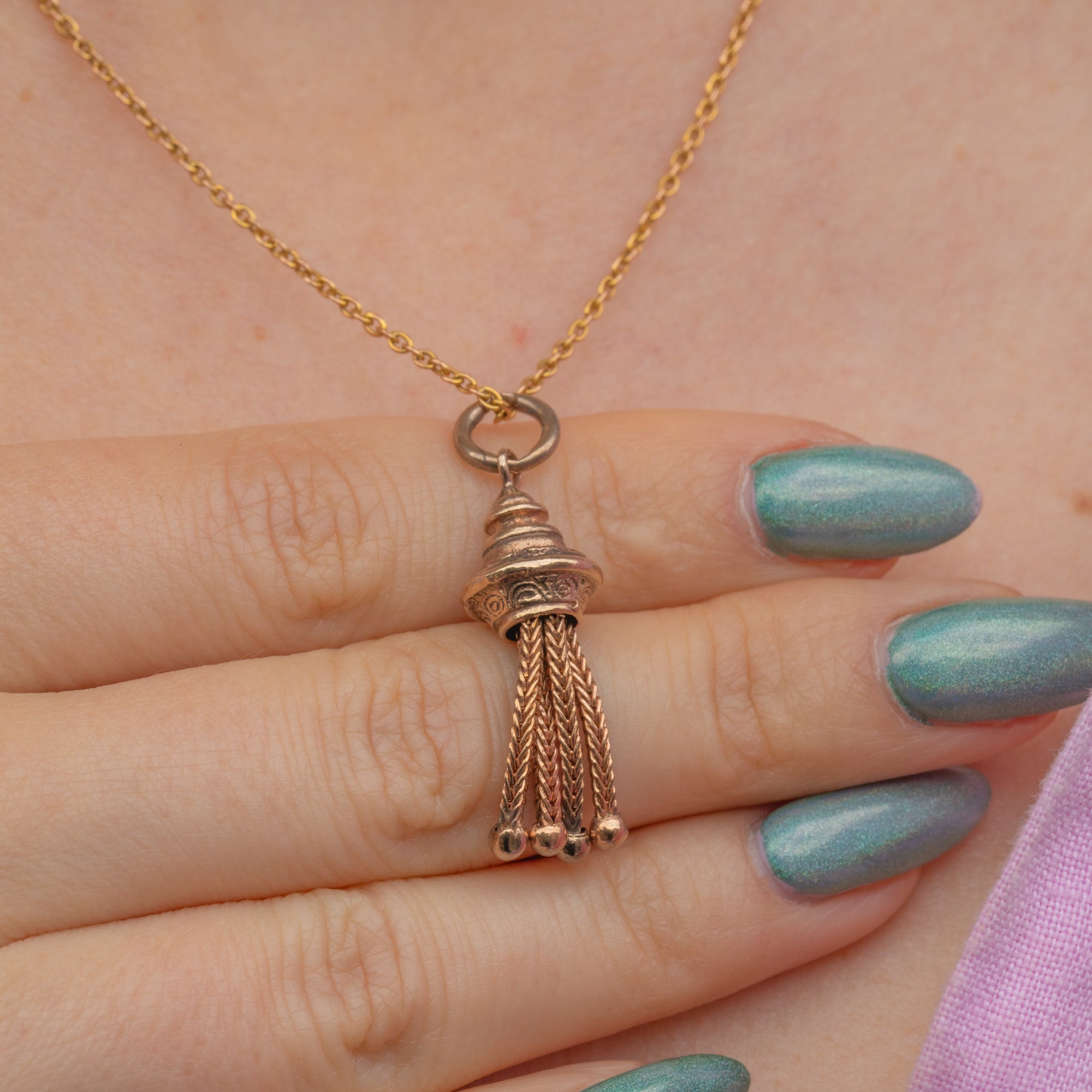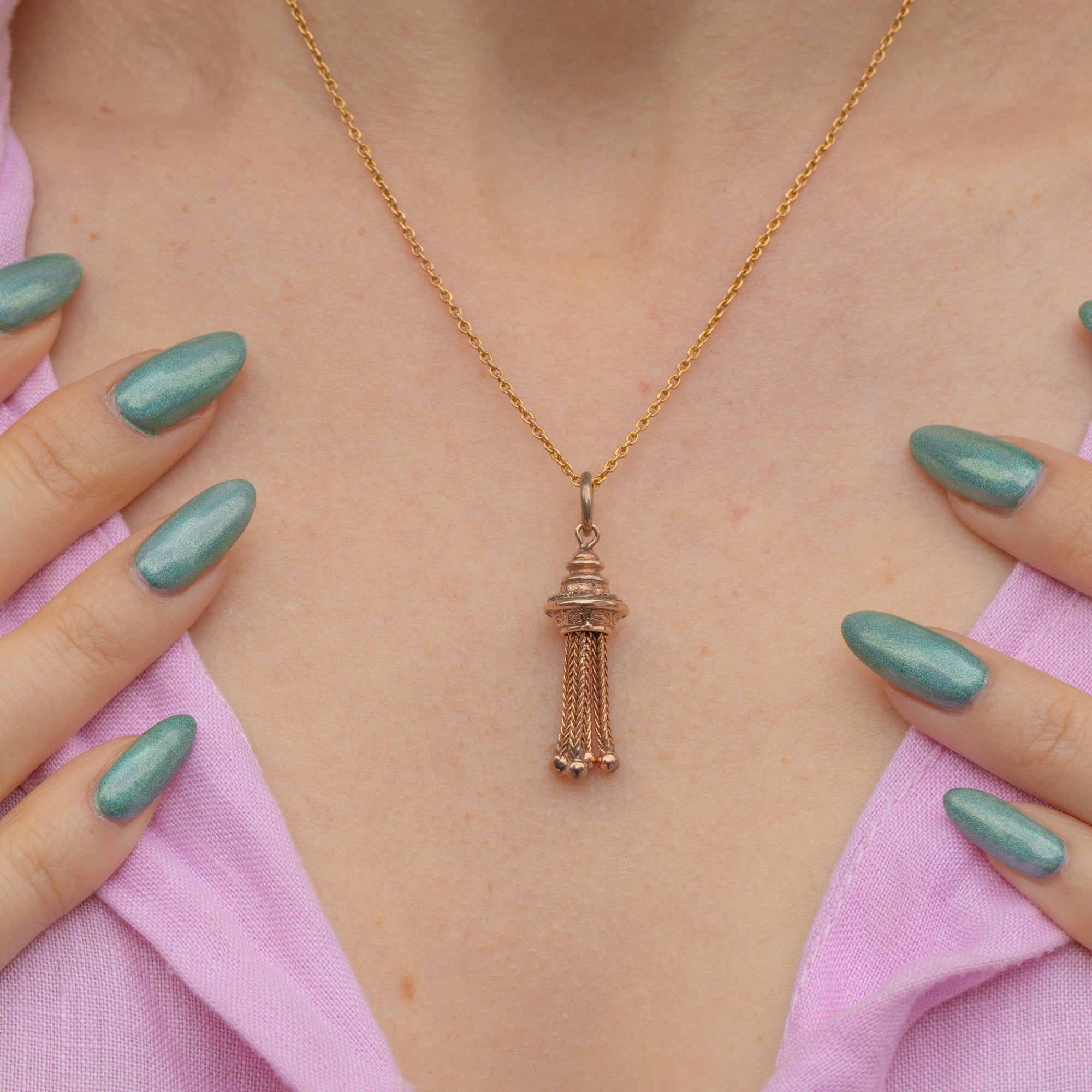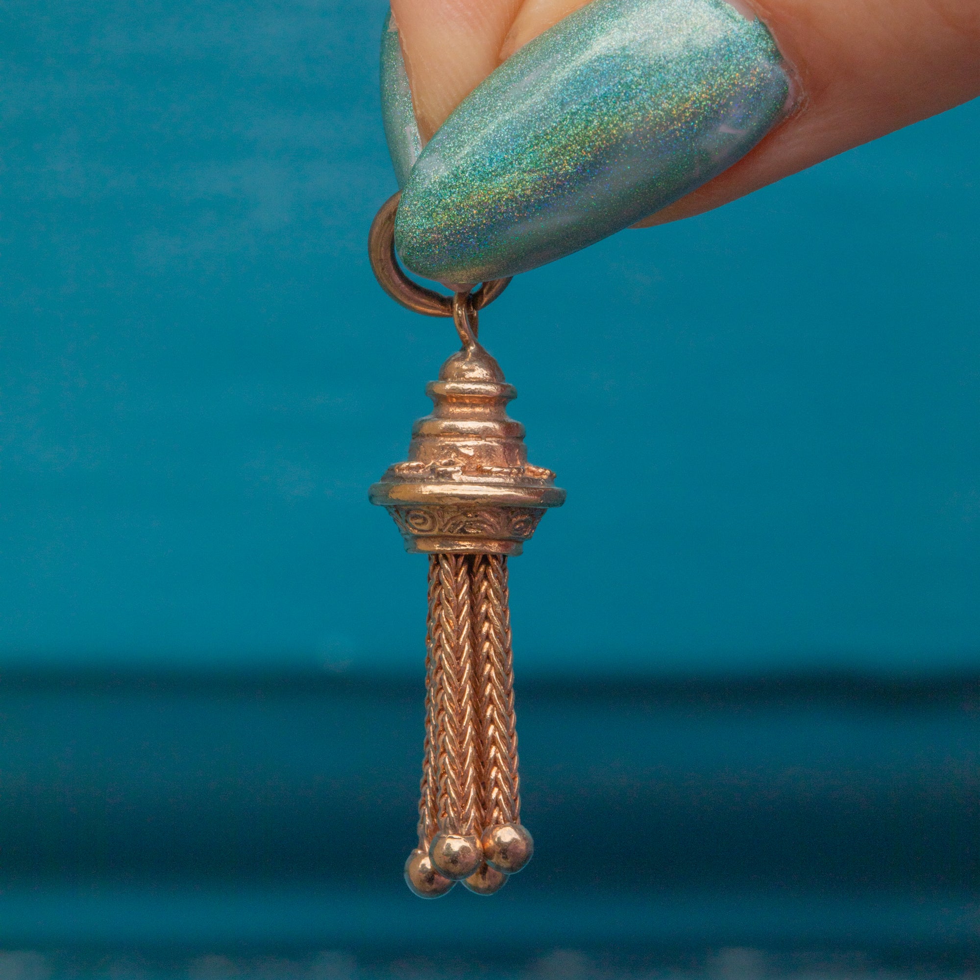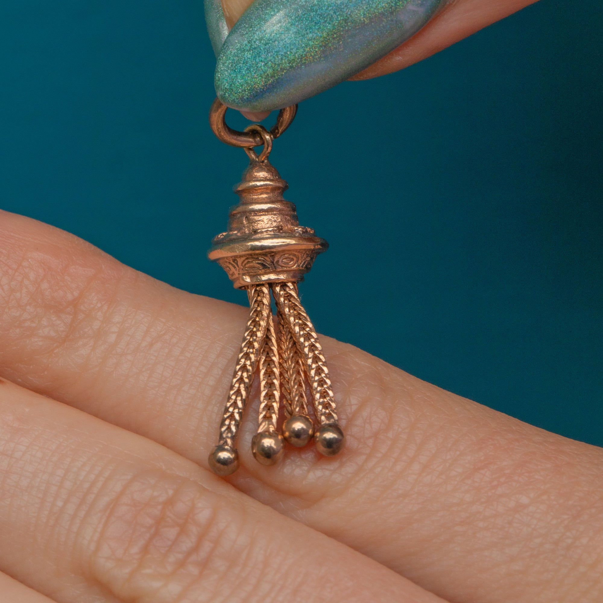 This impressive antique 9ct Gold tassel pendant is a must-have for your collection. Adorned with ornate engravings and rope detailing that flows around the dome, she is bursting with Victorian charm.