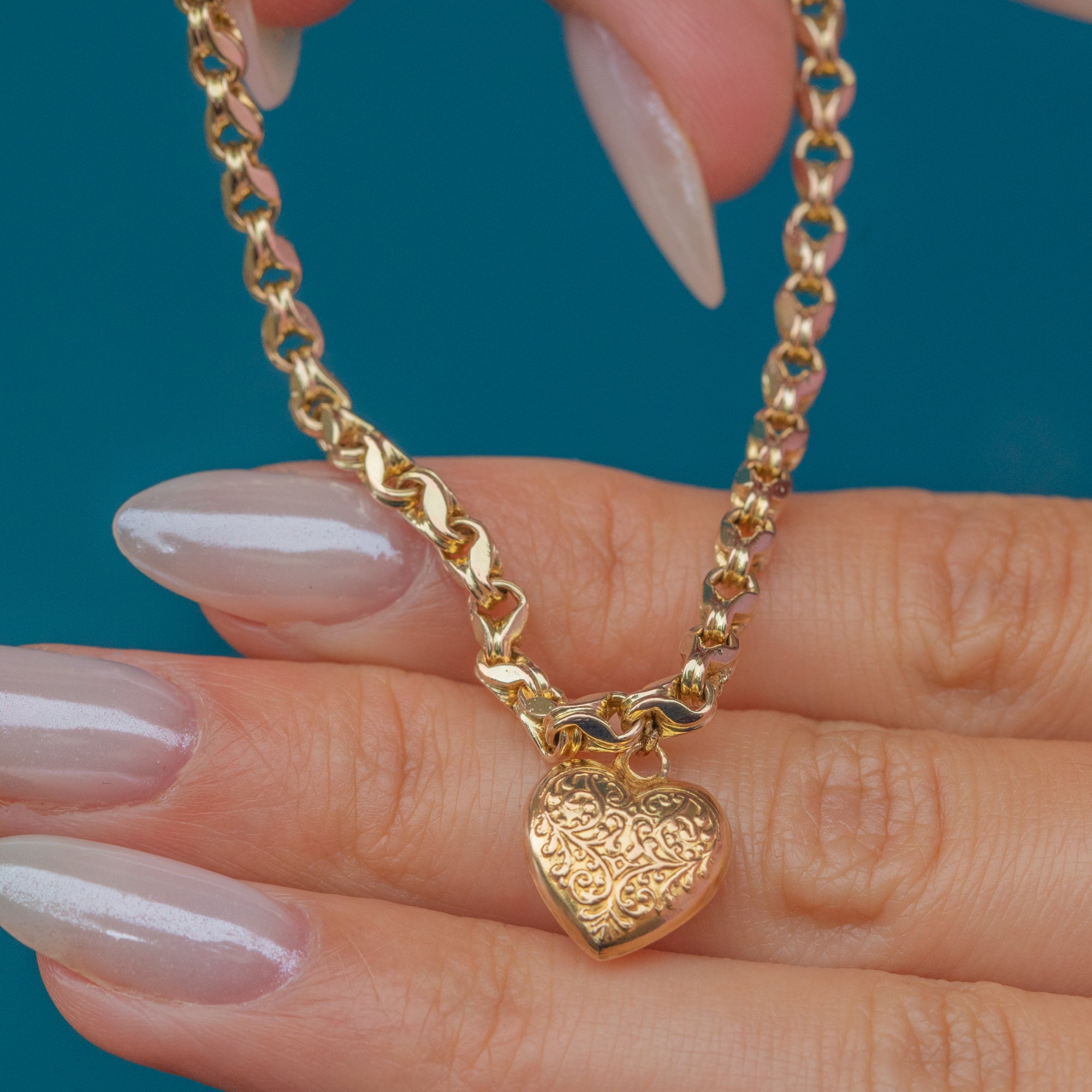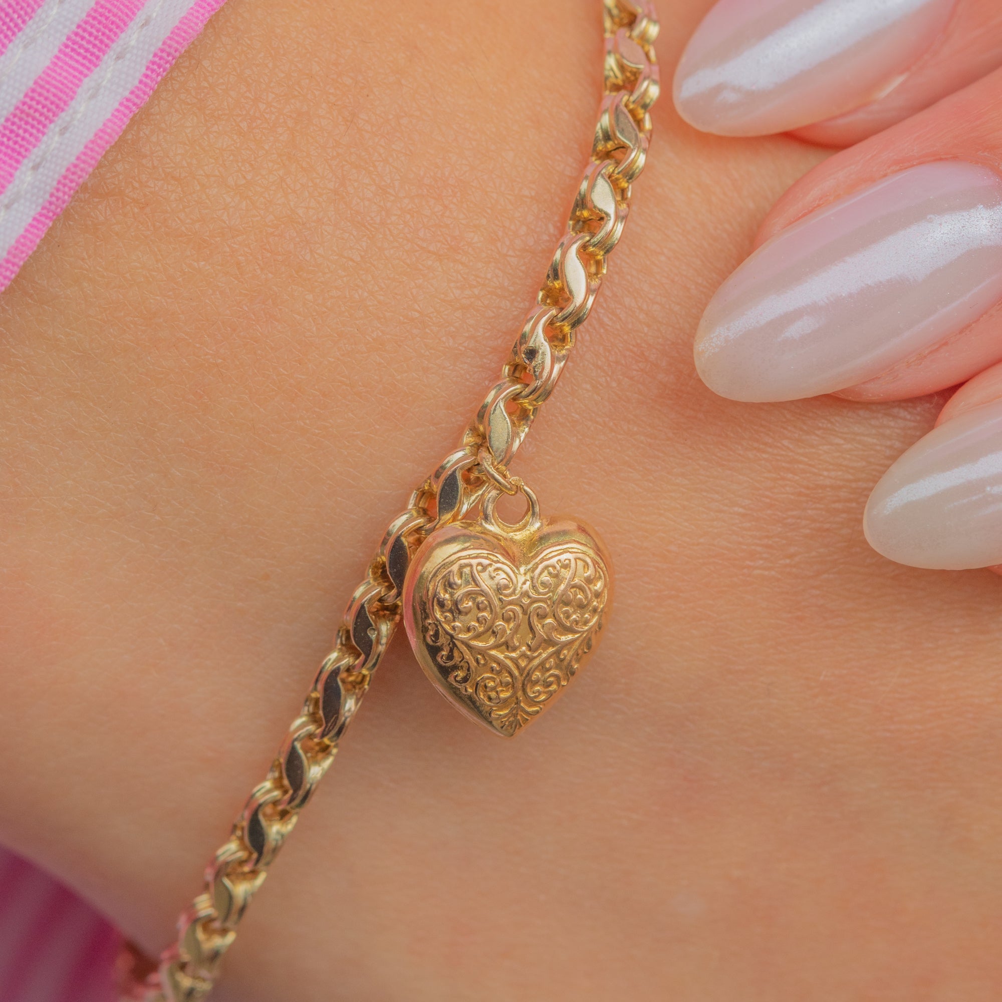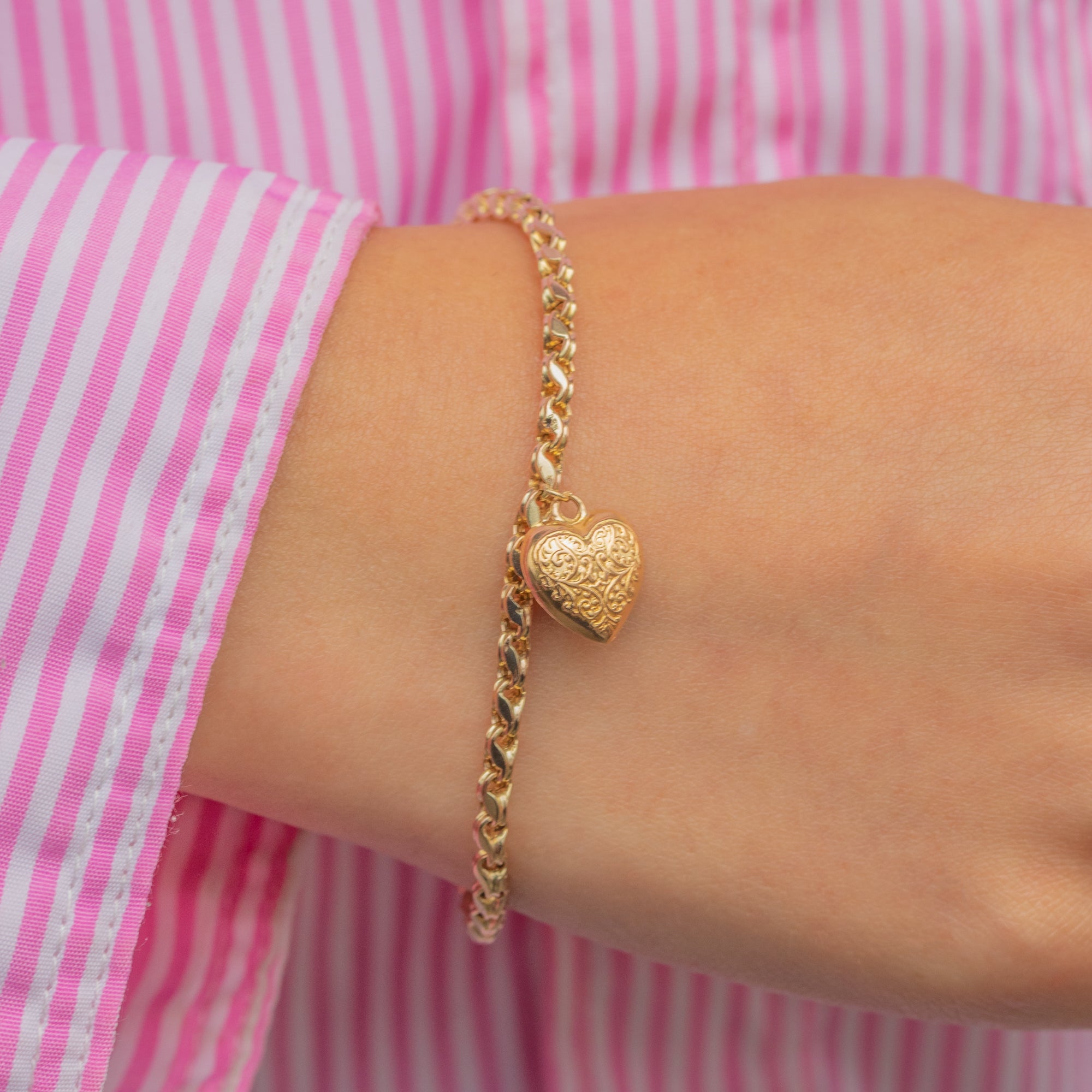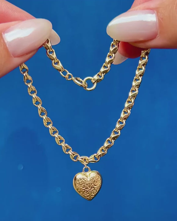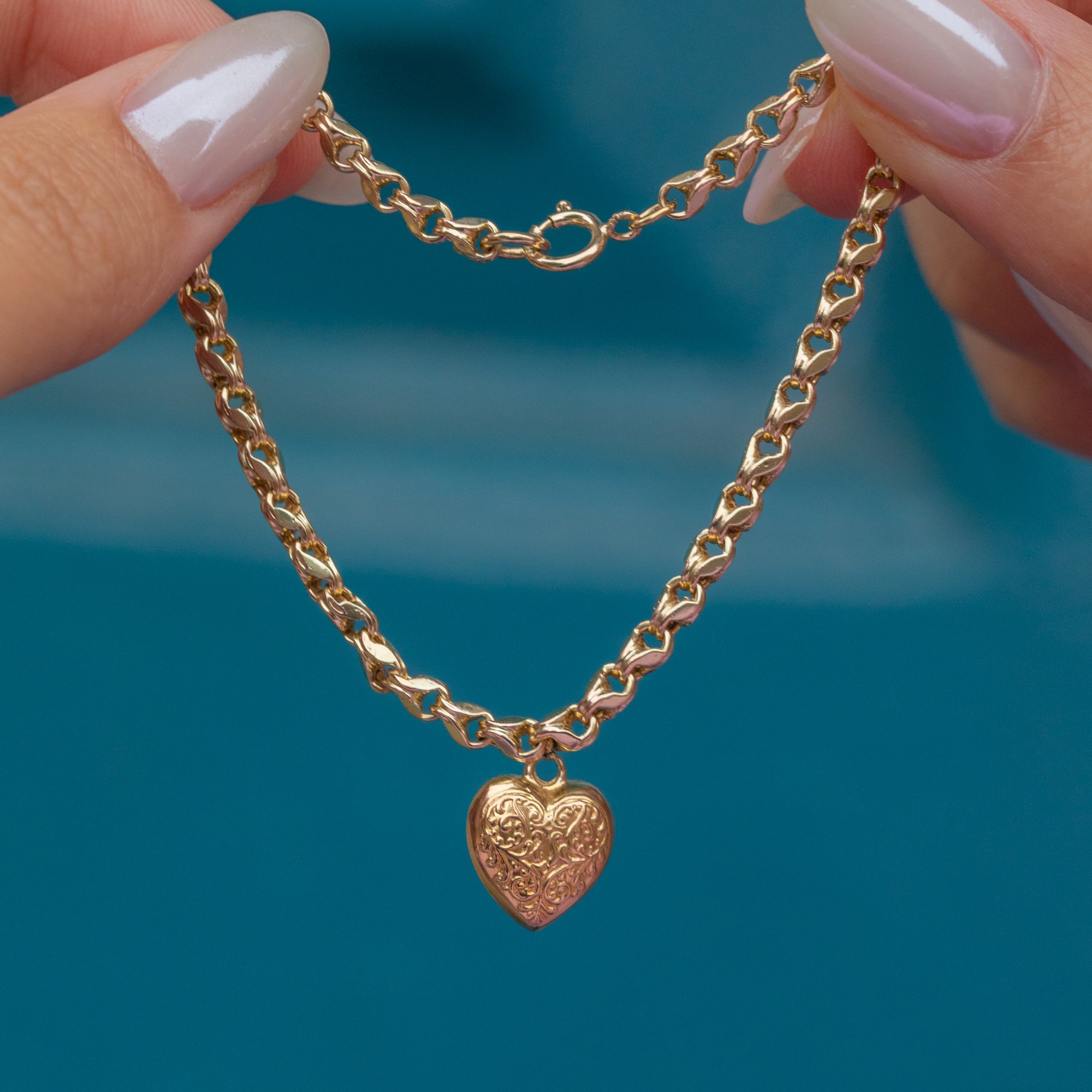 At the centre of attention hangs a puffy heart charm, delicately engraved with swirling patterns. This antique Gold bracelet is a charming piece steeped in romantic sentiment and is sure to bring ample character to your collection!