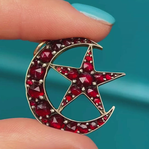 Antique Bohemian Garnet Crescent Moon & Star Pendant
