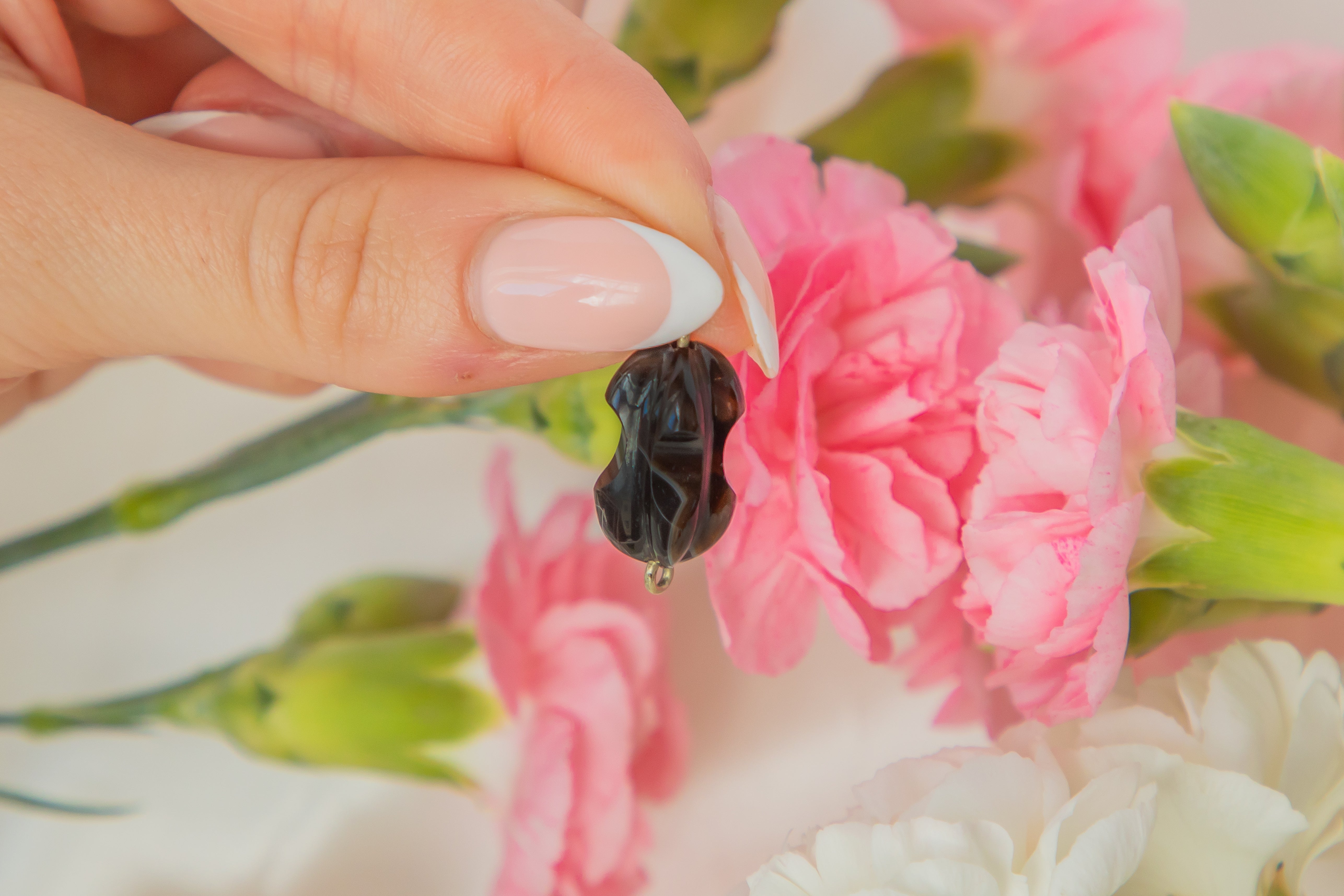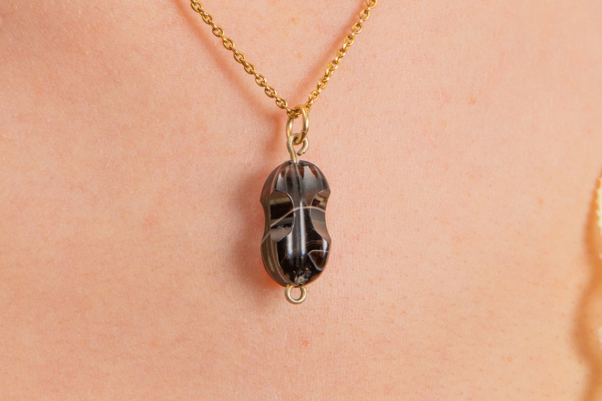 We are stunned by the craftsmanship of this antique carved Agate charm! Carved with precision, her Agate is formed into an intricately geometric shape, with satisfying symmetry throughout. Boasting a deep mocha hue, creamy lines of marble dance across her smooth surface, making her look delicious enough to eat!