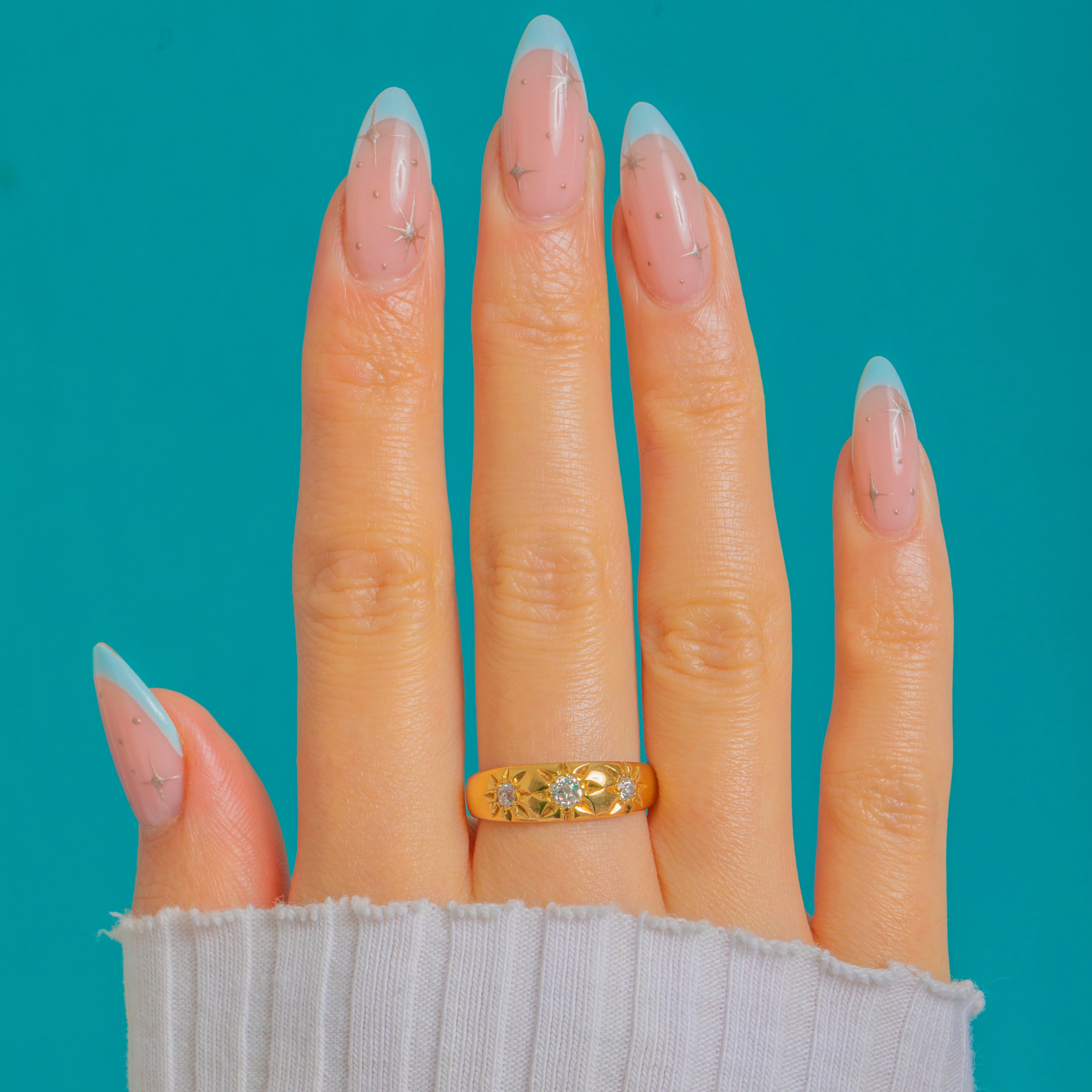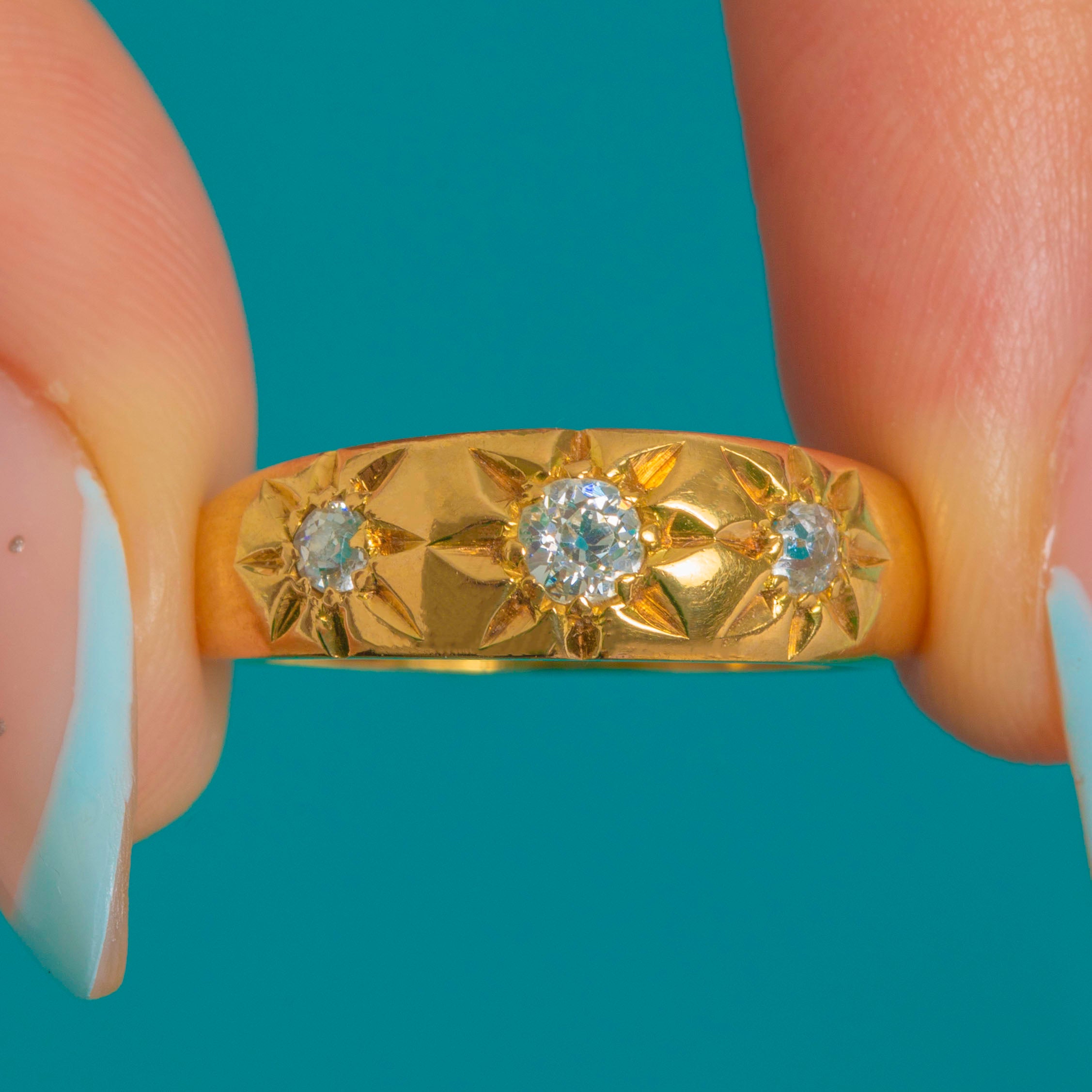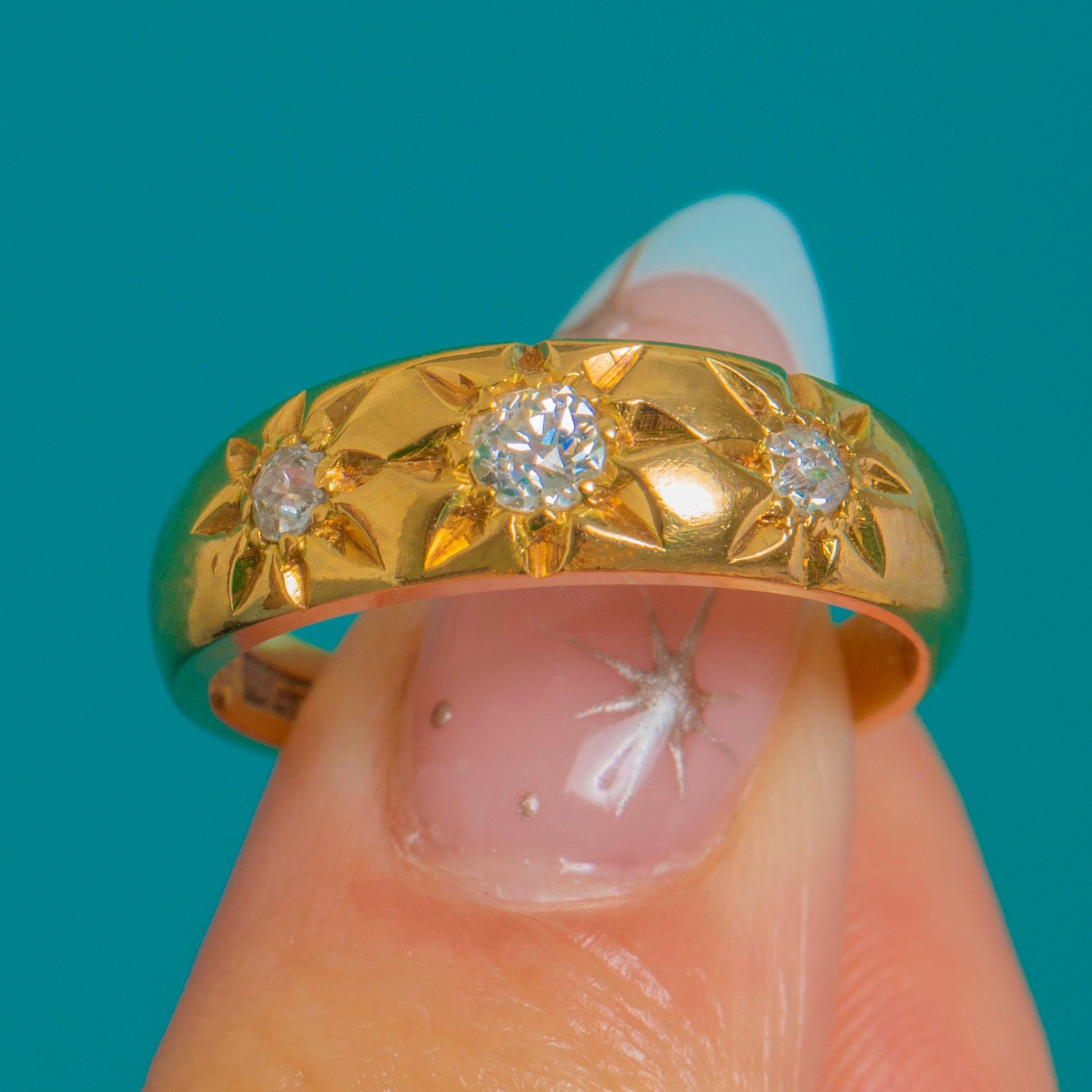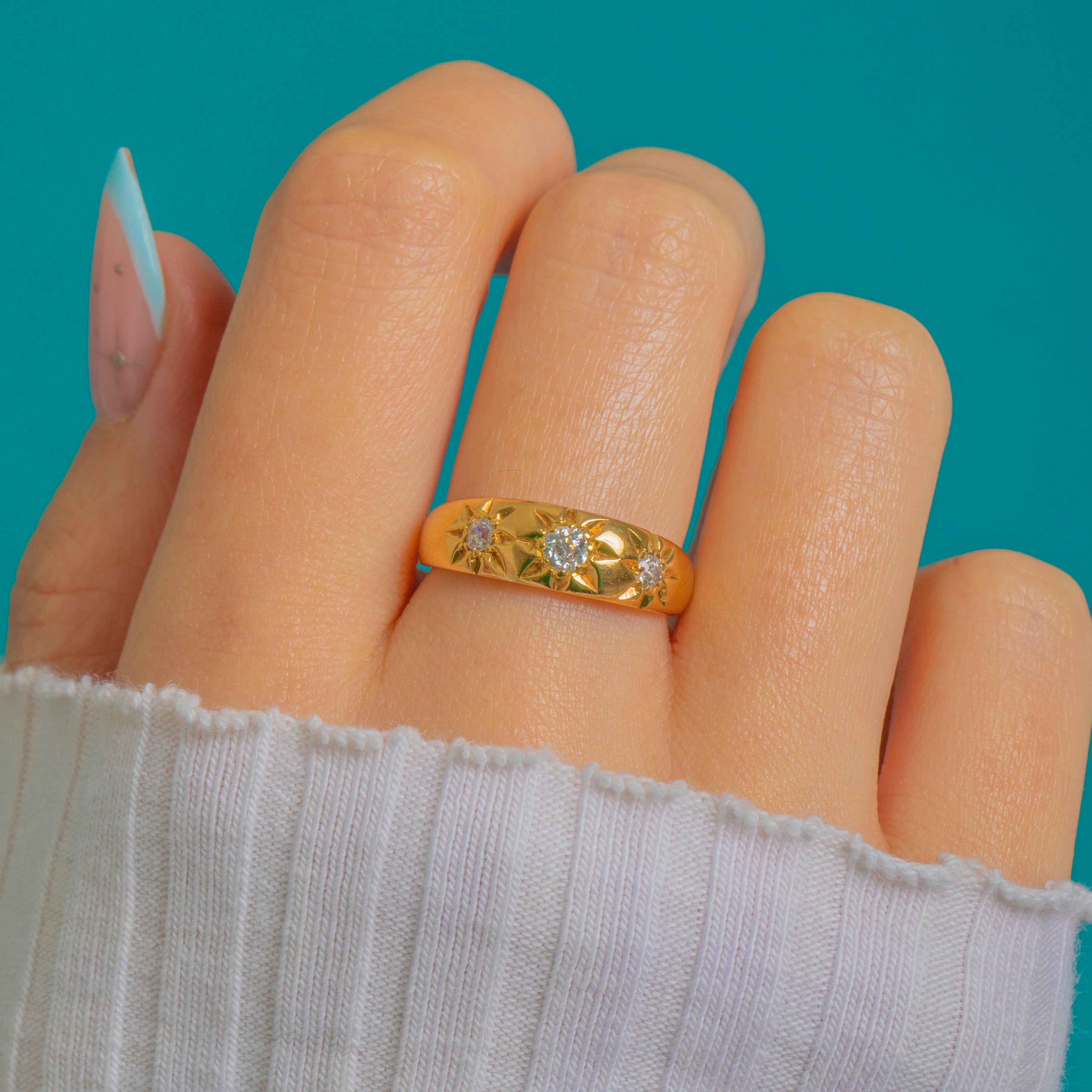 A wonderfully bold Victorian gypsy ring, set with three glittering Old Mine Cut Diamonds in crisp star settings. The warm 18ct Gold band has that timeless, high-polish look that makes antique Diamond rings so easy to wear every day.