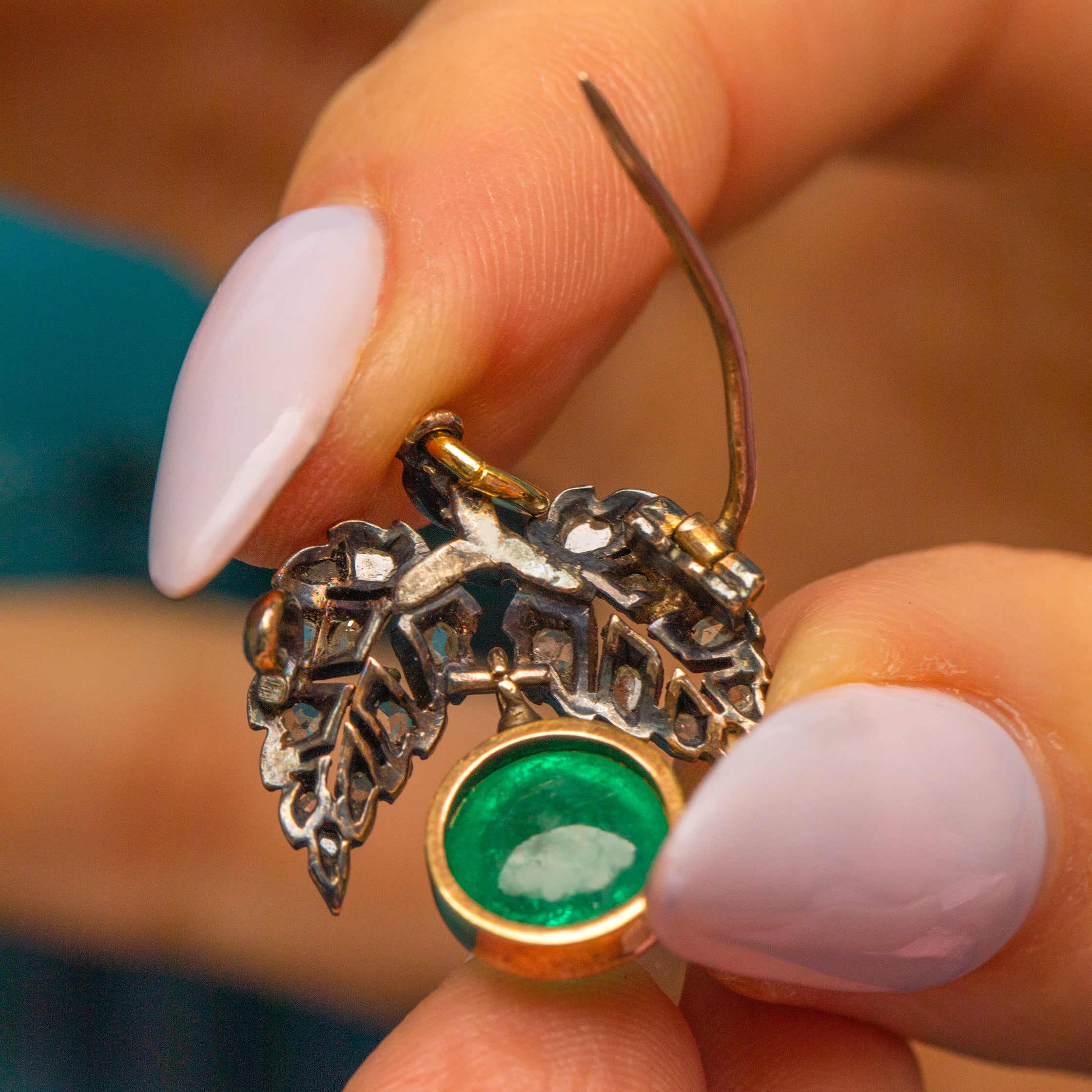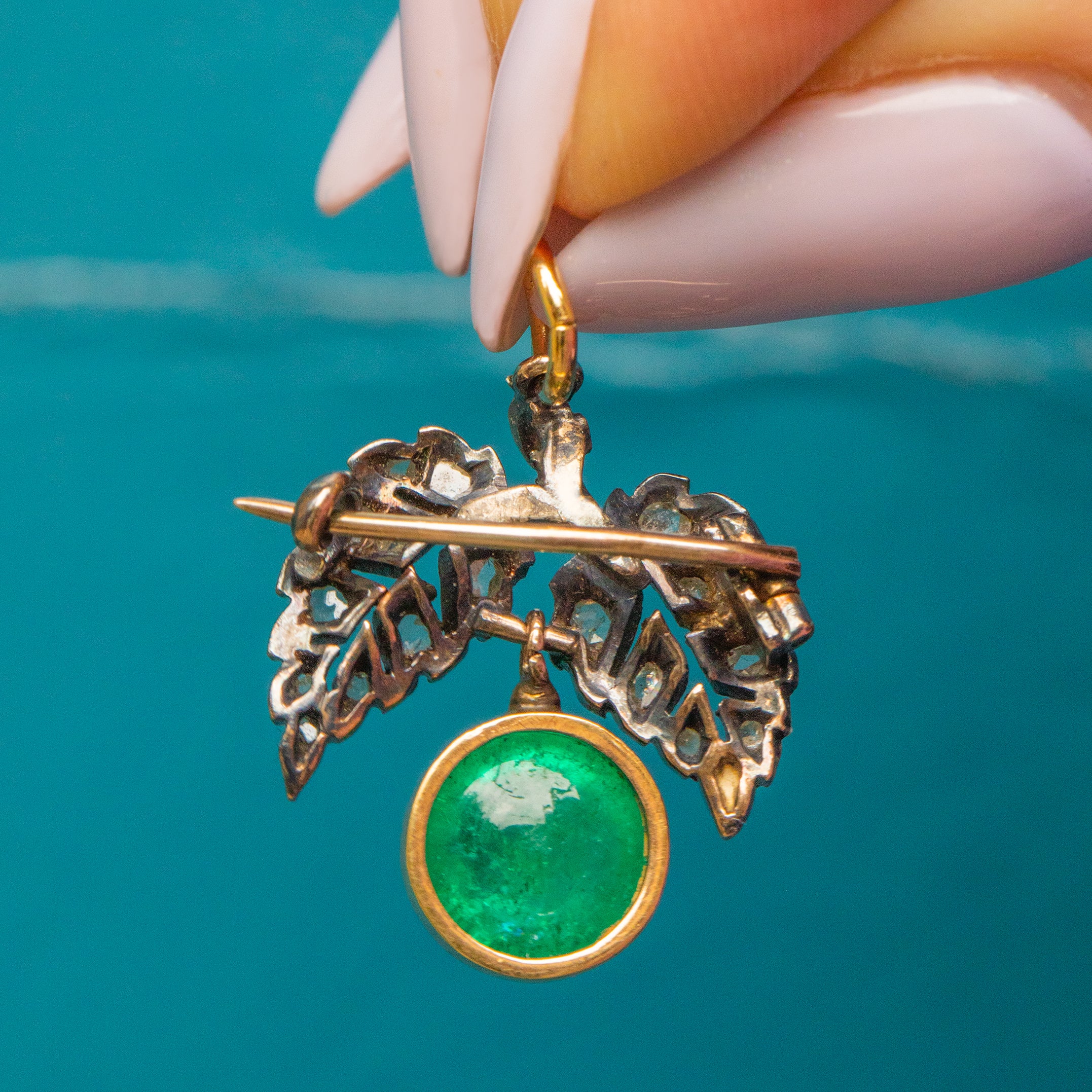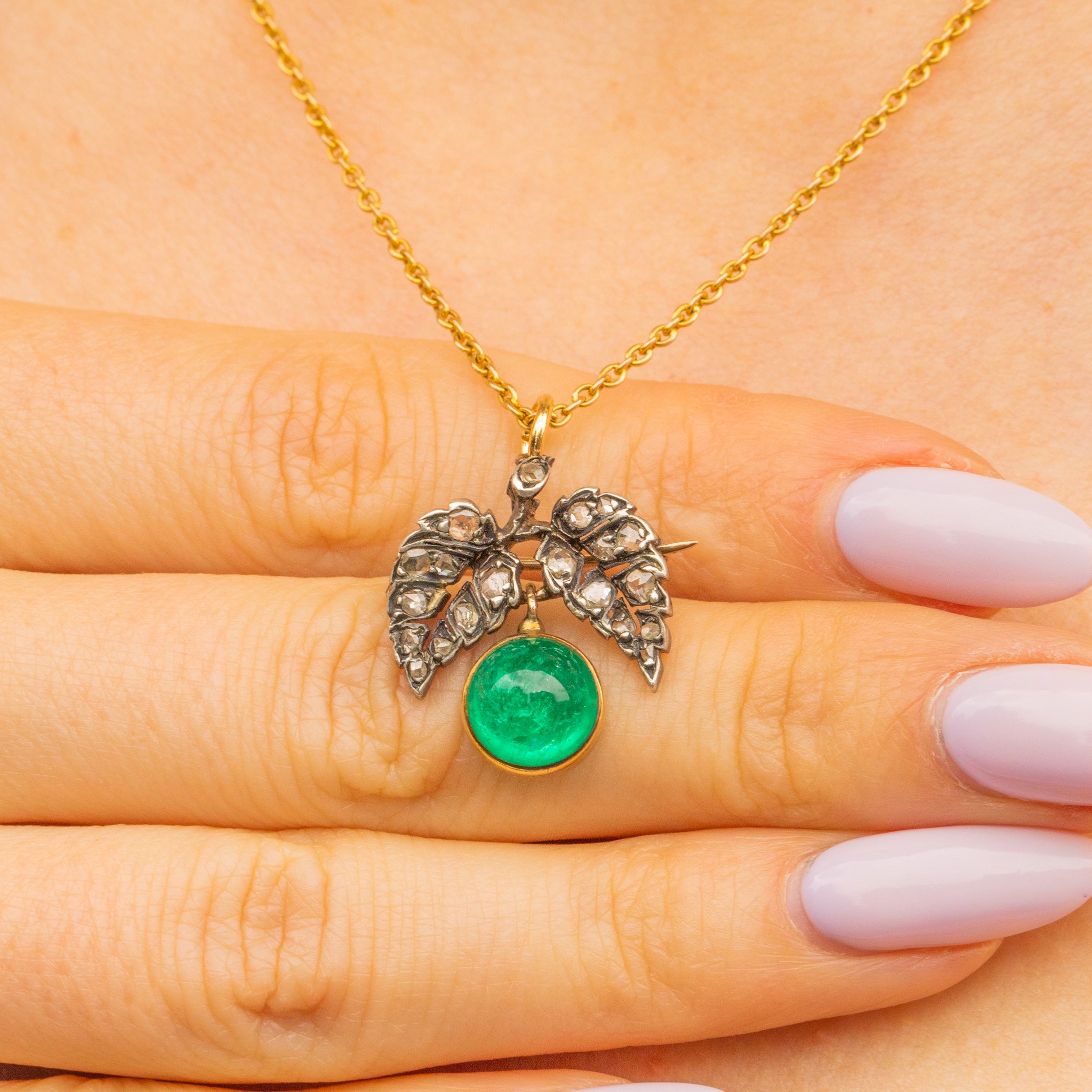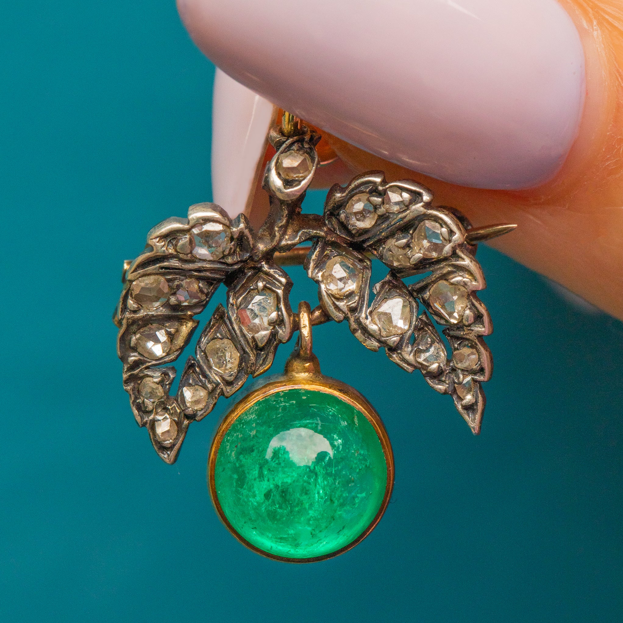 Suspended below in perfect position is her enchanting 3.30ct Emerald cabochon. Flaunting gorgeous natural inclusions at her core, a soft green glow beams from the surface. Not only does she have brooch fittings to affix to a jacket lapel, this Victorian Emerald brooch also comes complete with an 18ct Gold jump-ring making her a versatile pick. Her delicate design is bursting with charm, you'll find yourself looking at her when you don't even notice.