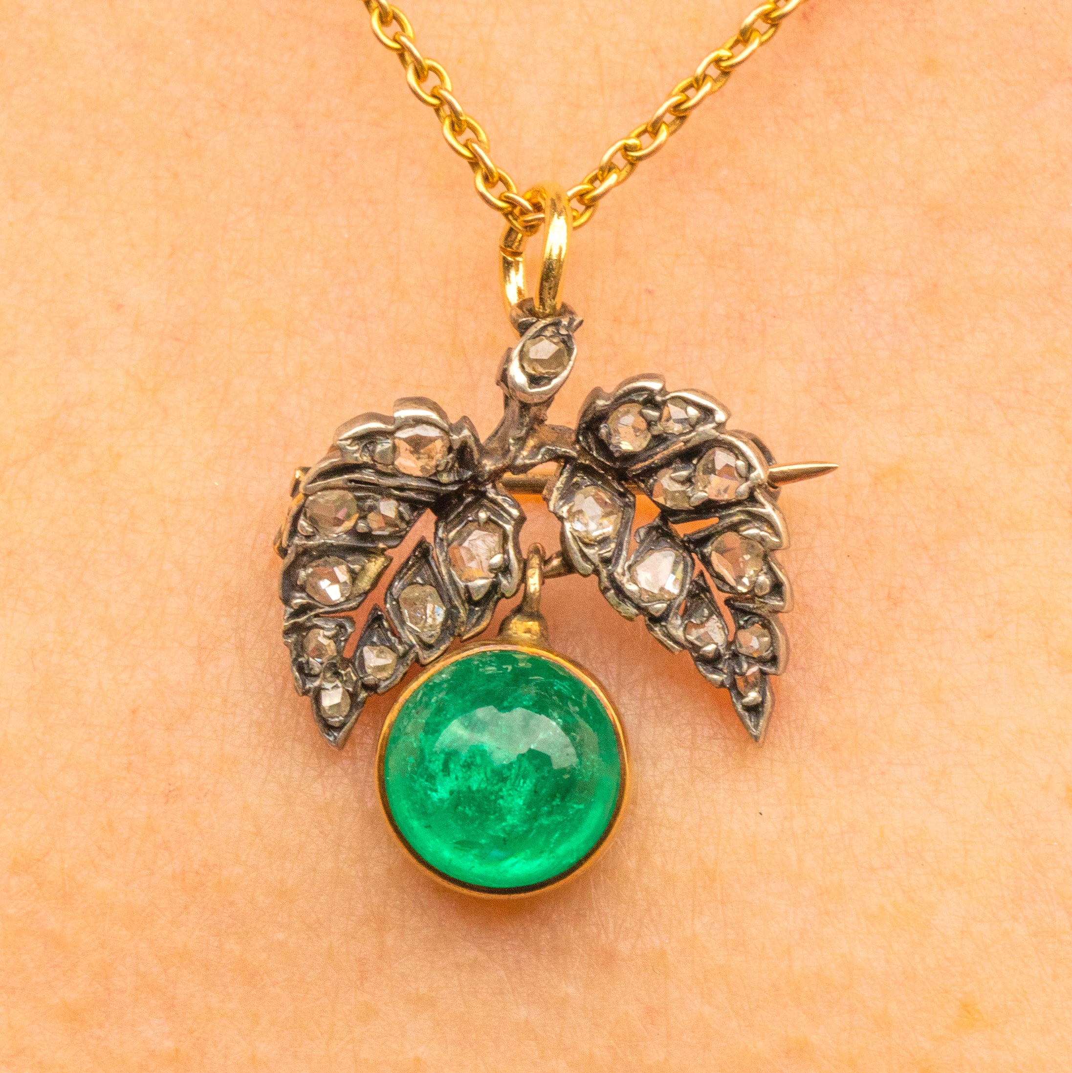 Whether a lover of nature or an antique jewellery enthusiast this antique Emerald and Diamond leaf brooch was made for you! The most splendorous leaves you will ever lay eyes on, their whimsical form is inlaid with an abundance of fabulously faceted rose-cut Diamonds.