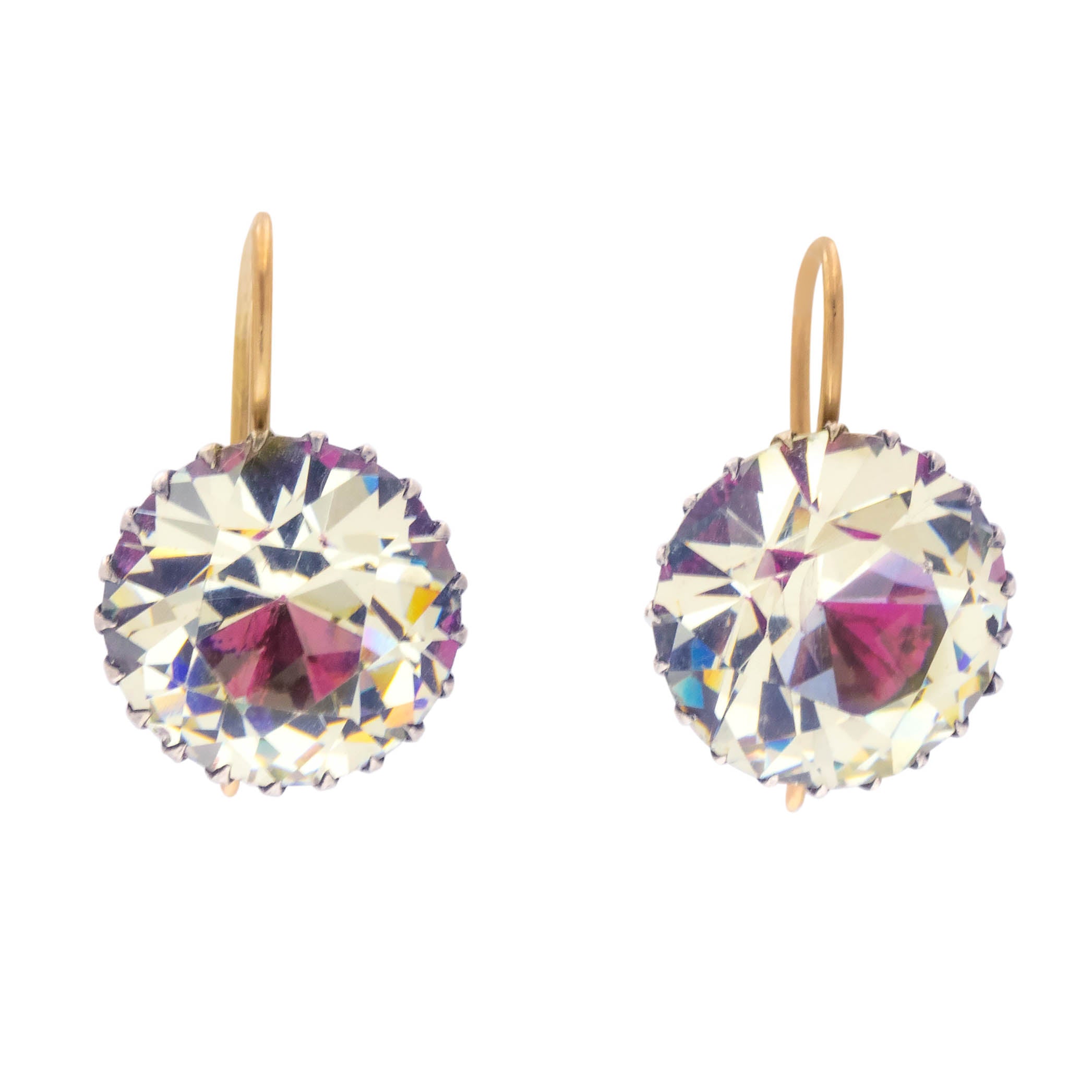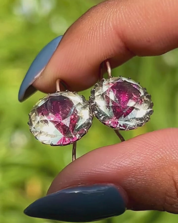 VERY GOOD. These antique foiled pink Paste button drop earrings are in wonderful condition. The Paste gemstones have a beautiful pink hue and the foils have been well preserved. One of the Paste gemstones has minor fleabites to some facets but these are only noticeable under closer inspection. There are some minor dings on the back of the earrings but this cannot be seen when worn. The Silver settings are lustrous and hold the Paste securely in place. The 15ct Gold hooks are robust and generously sized, allowing you to confidently wear these magnificent Victorian Paste earrings comfortably whatever the occasion!