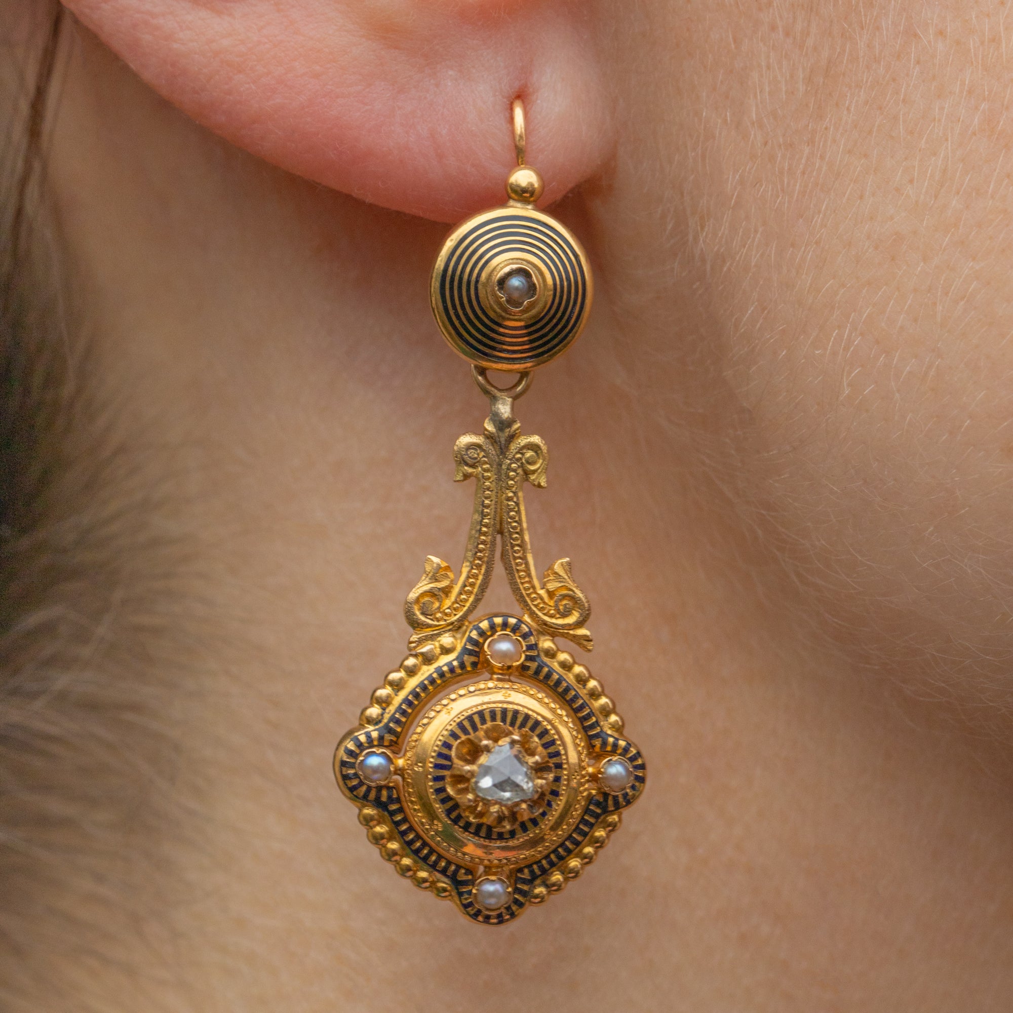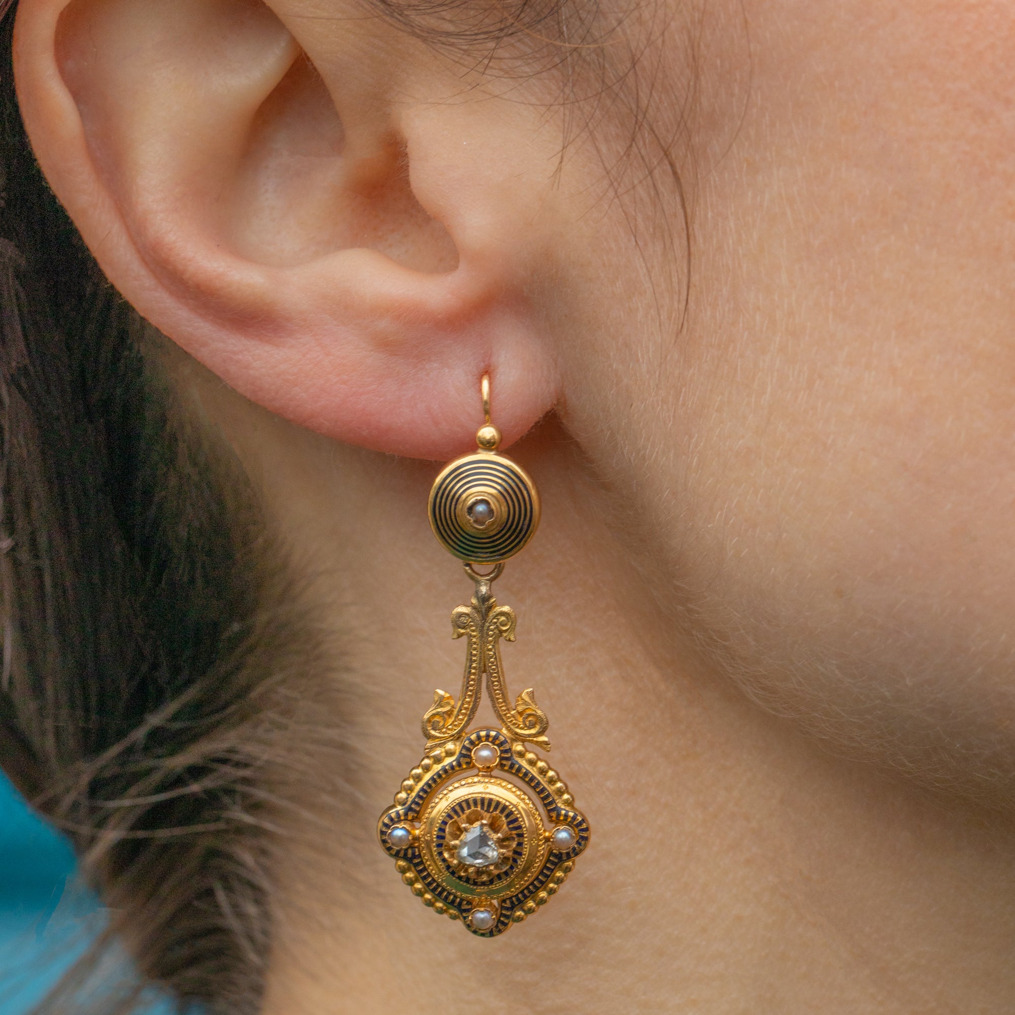 These outstanding antique French 18ct Gold black Enamel Diamond day & night earrings perfectly capture the exquisite craftsmanship of the Victorian era! The ornately formed 18ct Gold is bursting with intricate details, inlaid with striking black Enamel and studded with Pearls and a single rose-cut Diamond in the centre of each drop.