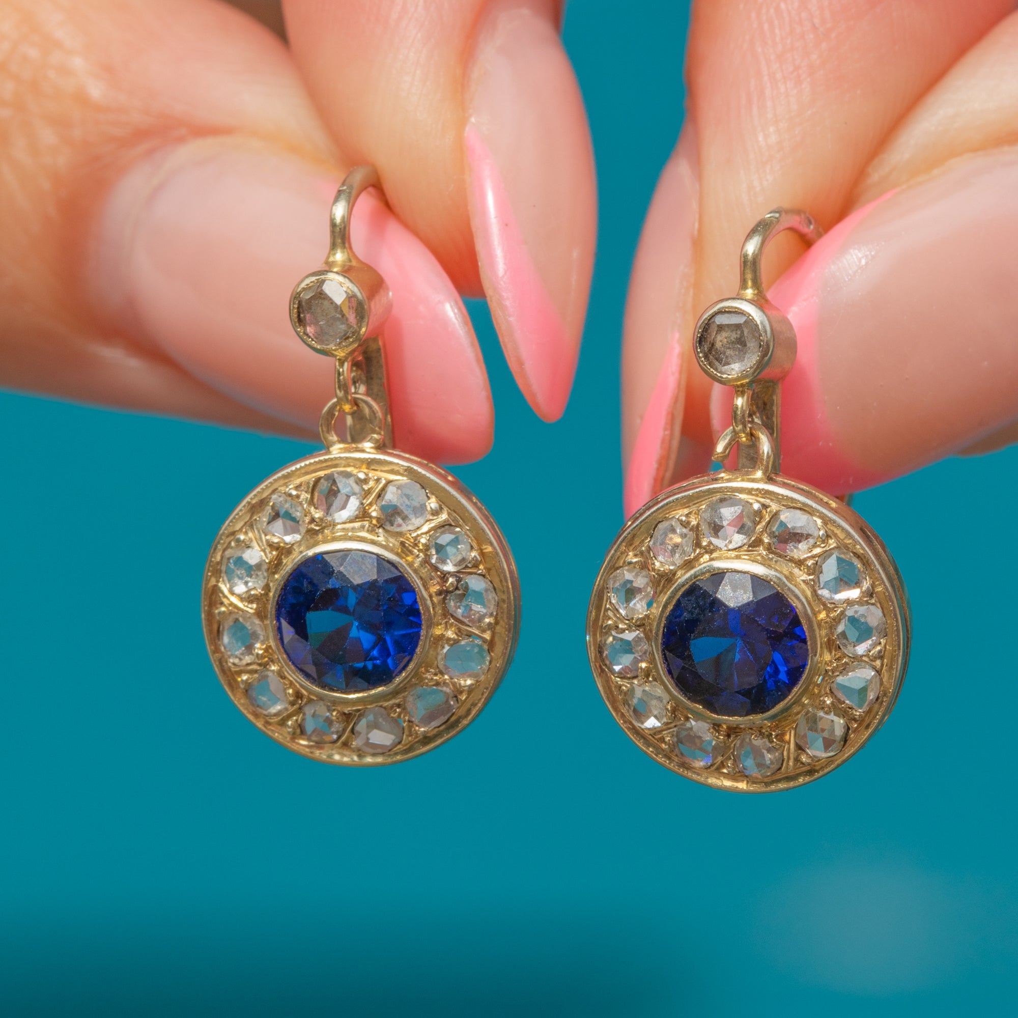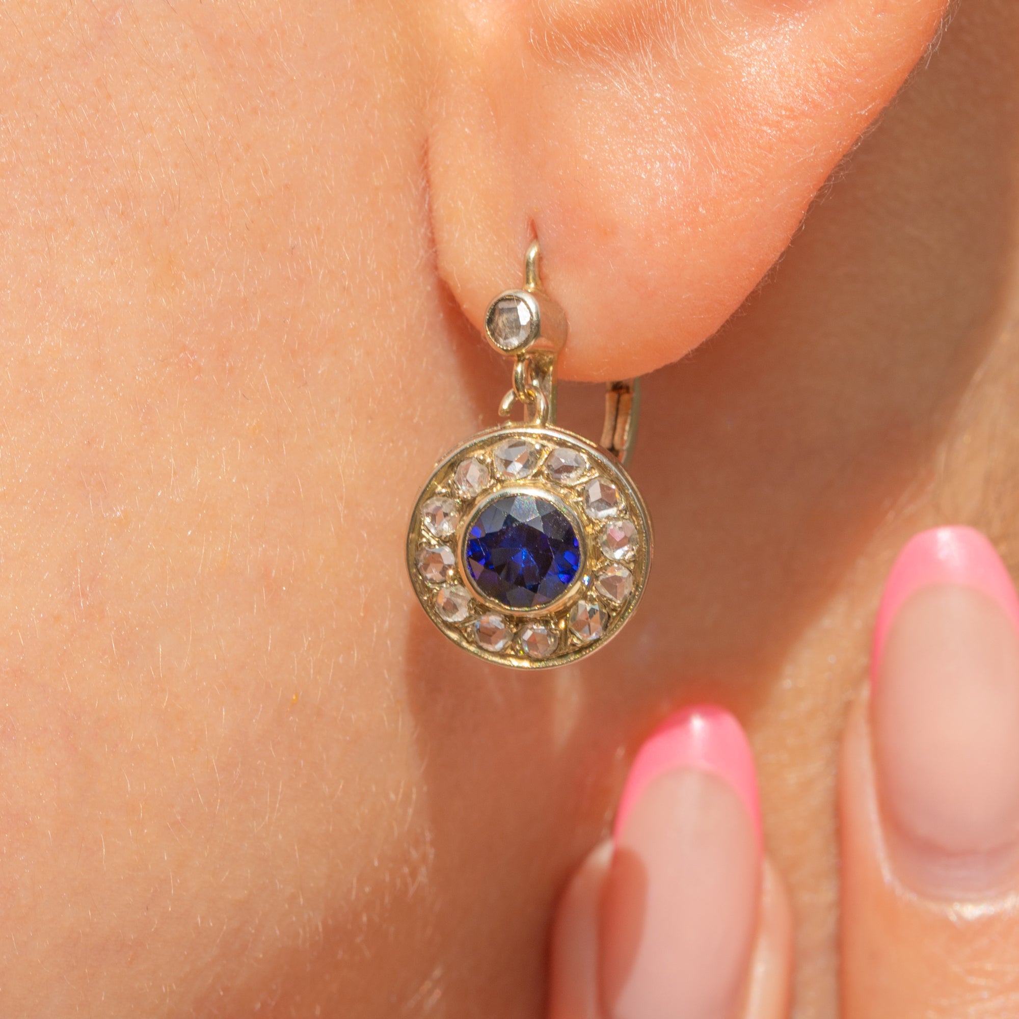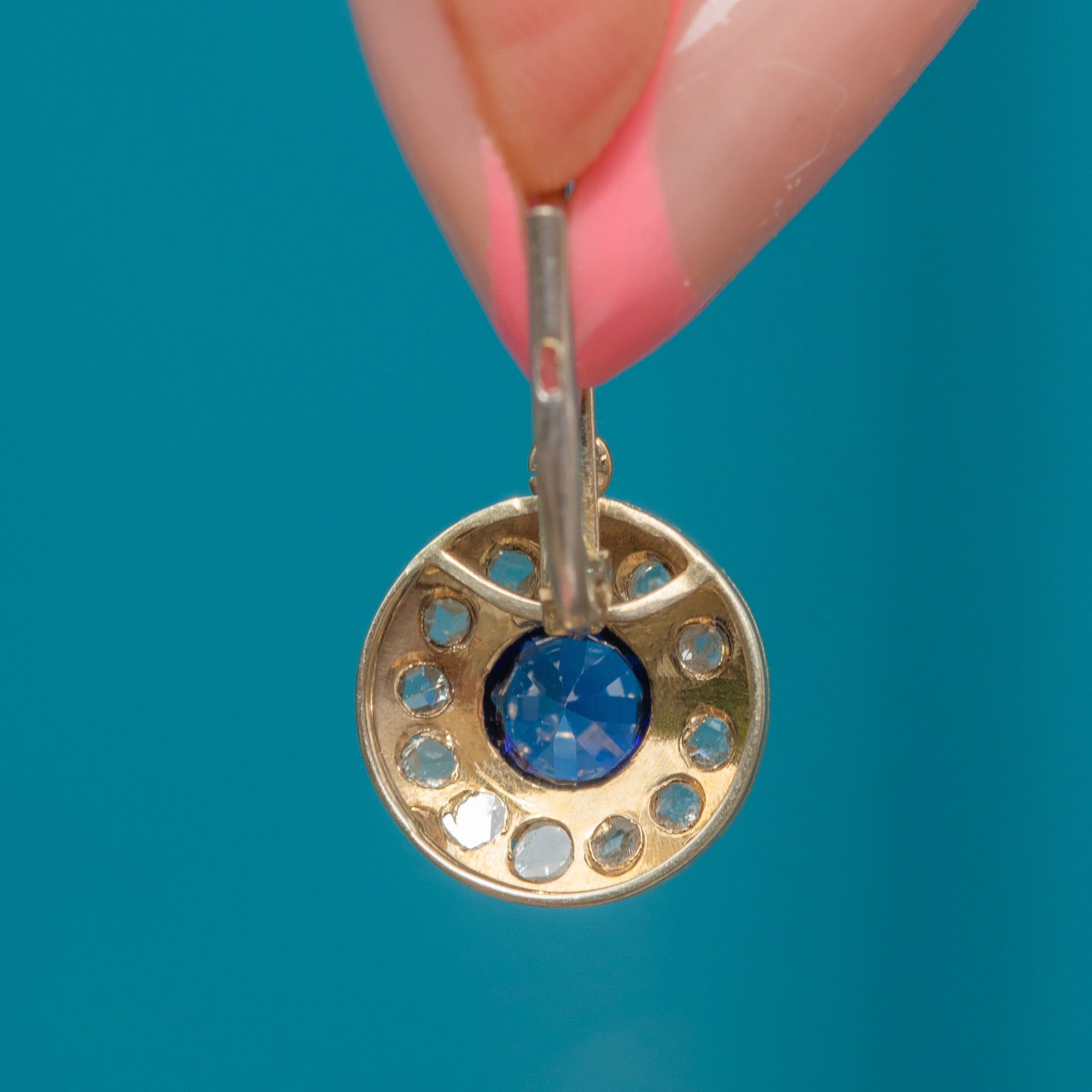 EXCELLENT: These antique French 18ct Gold Sapphire and Diamond cluster drop earrings are in wonderful condition. The Sapphires and rose-cut Diamonds are radiant and secure within their settings, free from chips or abrasions. With her lever backs in perfect working order, these antique earrings can be worn with the utmost confidence!